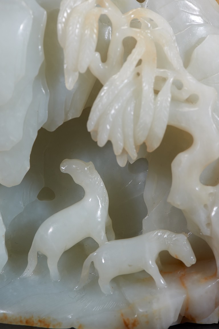 The boulder is carved as the mythological horse tamer, Bo Le, bathing his horse, with the other horse standing adjacent to him with head turning back gazing another horse, all set in a craggy rocky mountain setting, the reverse with two horses standing in a stream. The stone is of translucent and softly polished even white tone with some minor russet inclusions. Qing Dynasty period.