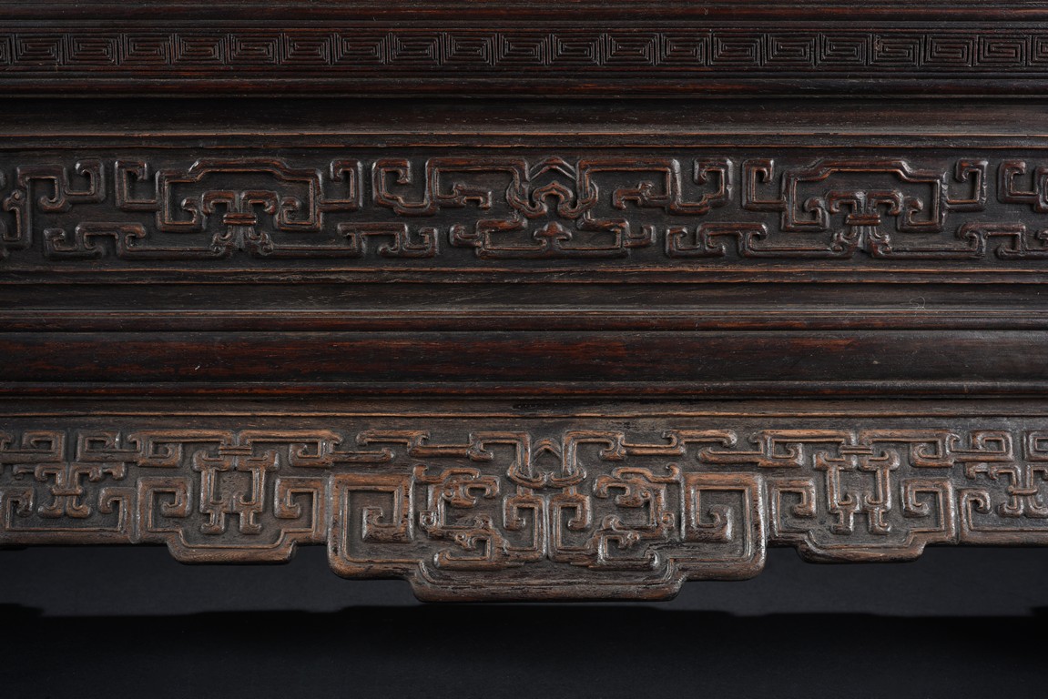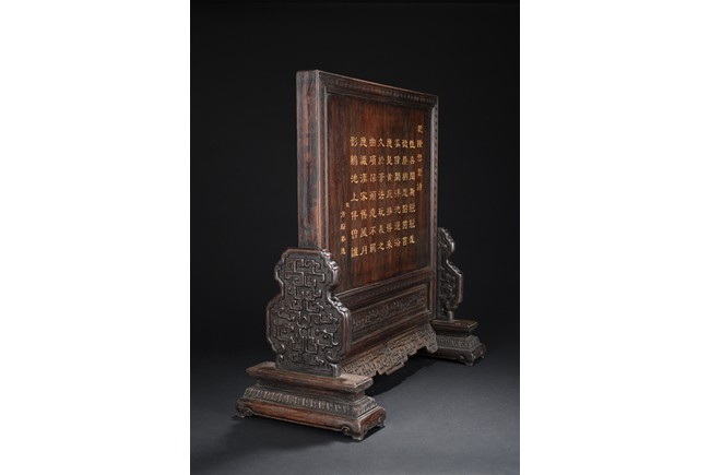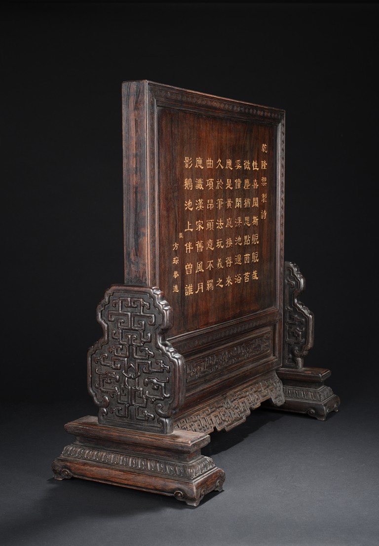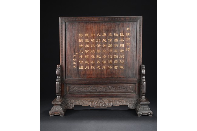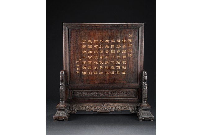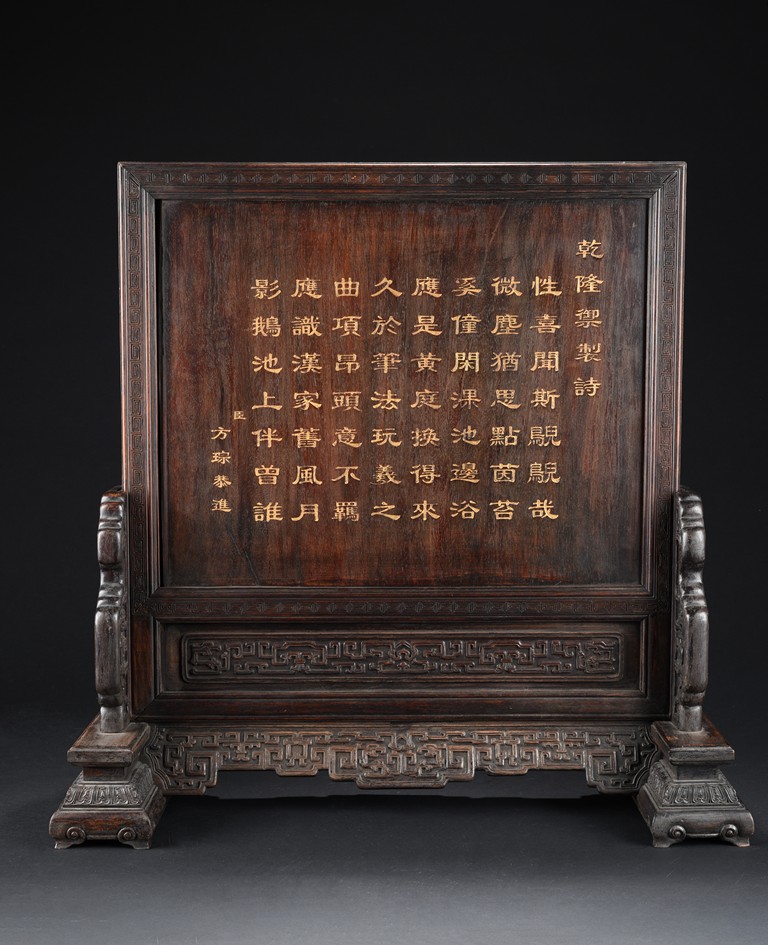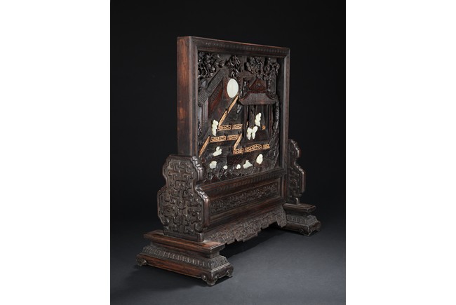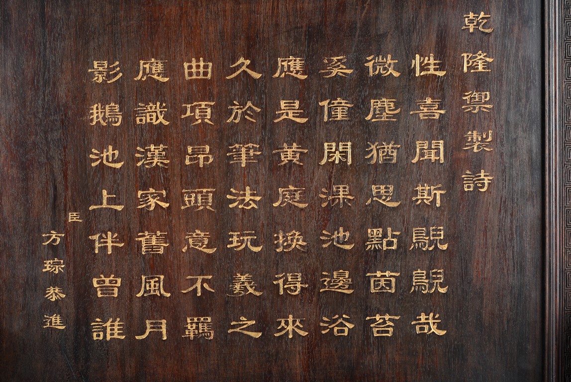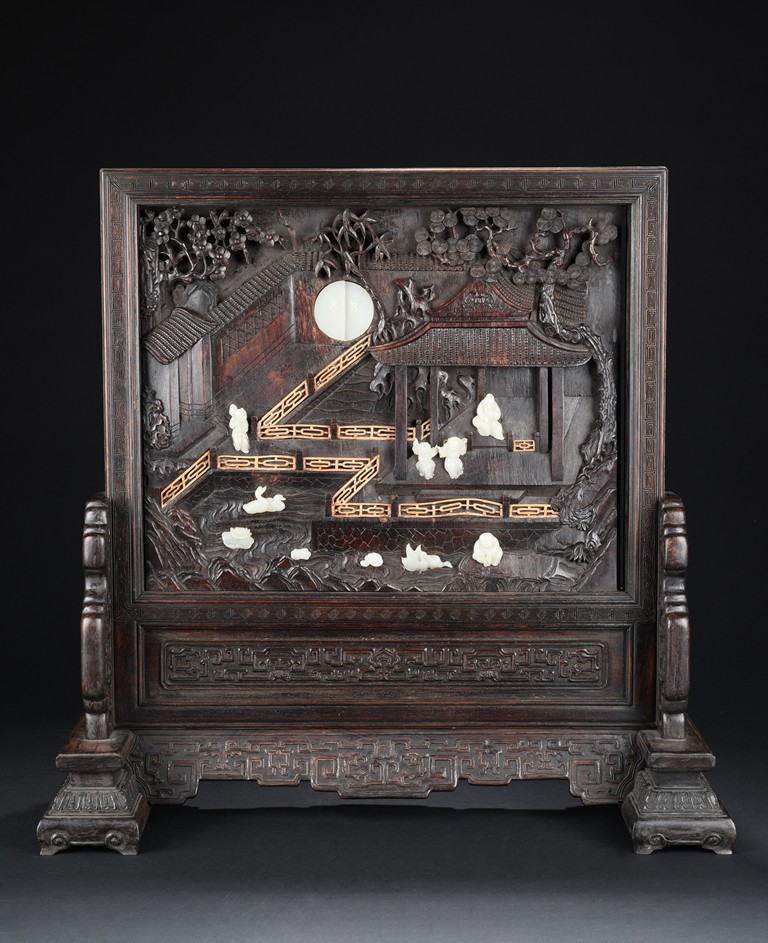 The rectangular panel deeply and elegantly carved with a garden scene, depicting two white jade carved boys under a pavilion gazing over the swimming ducks and lotus in the pond, with tall pine tree issuing from rocky outcrops, the reverse inscribed with inscription in gilt, the panel fitted into a zitan frame skillfully carved with archaistic scroll pattern. Qing Dynasty period.