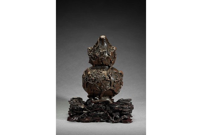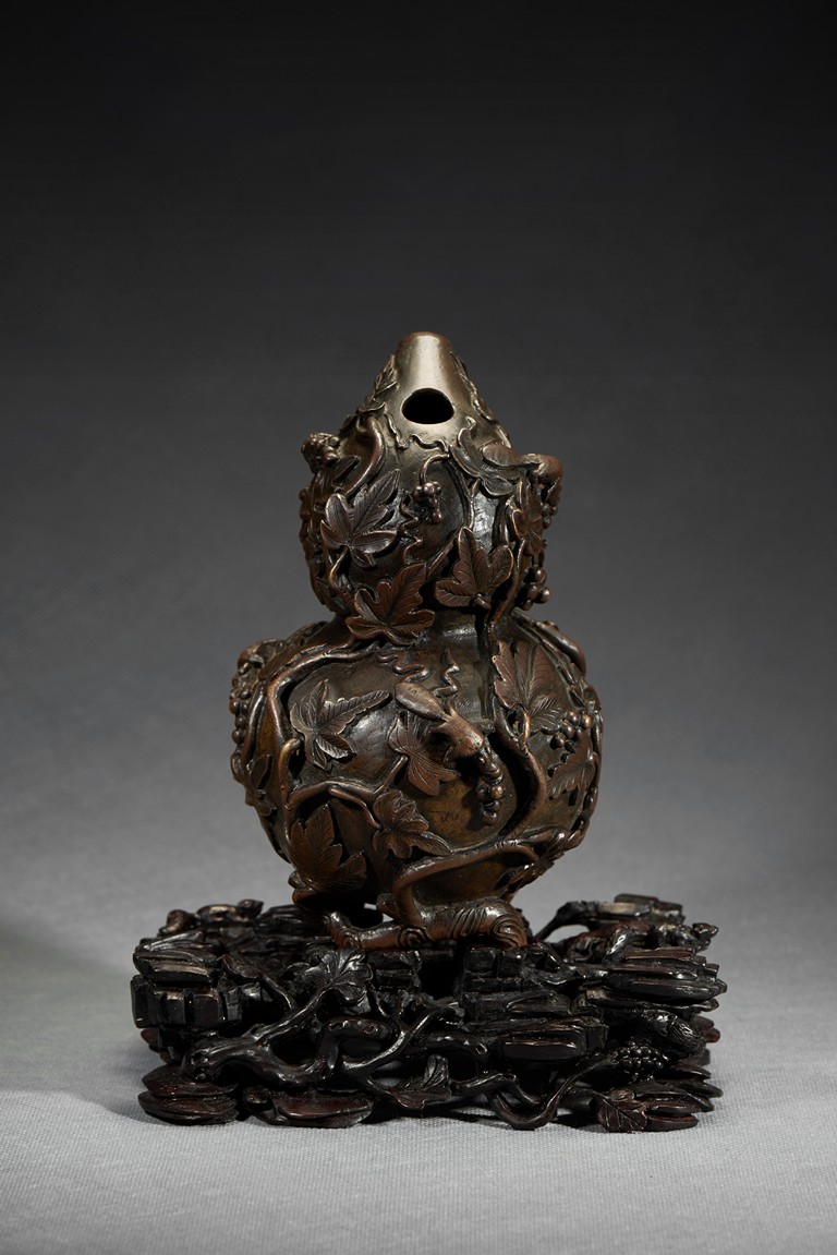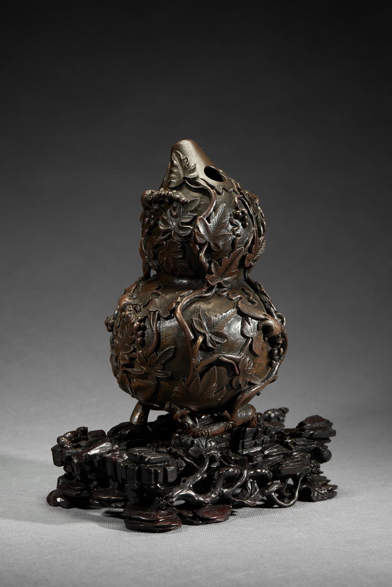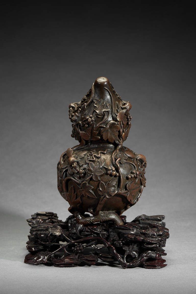 Modelled in the form of double gourd, cast to the exterior with meandering grapes vine and gnarled branches issuing from the base, with a circular opening to the top, all supported on a reticulated zitan stand. Qing Dynasty Qianlong period.