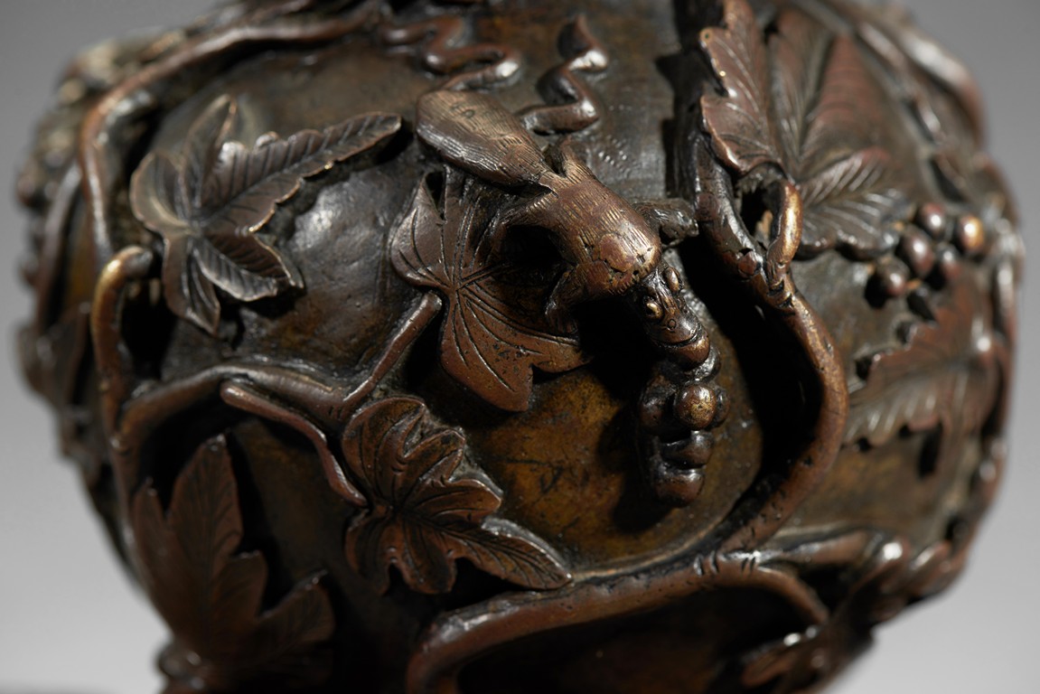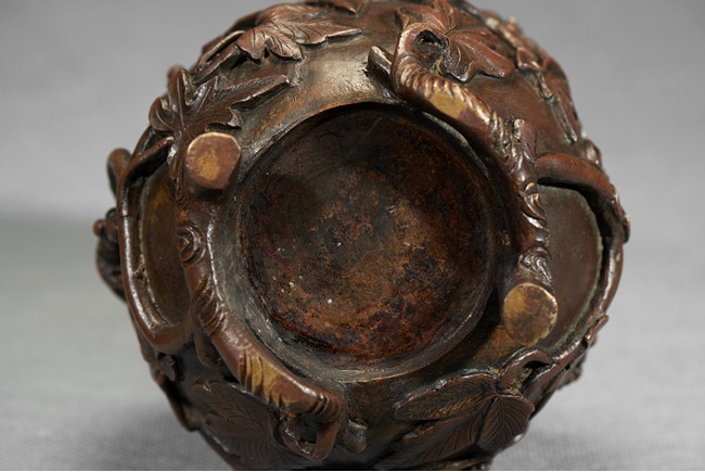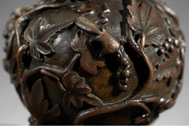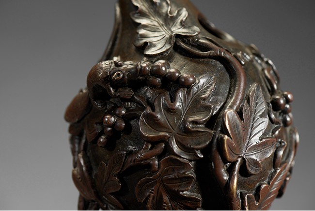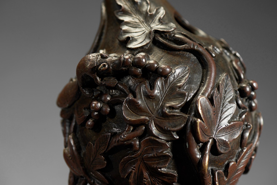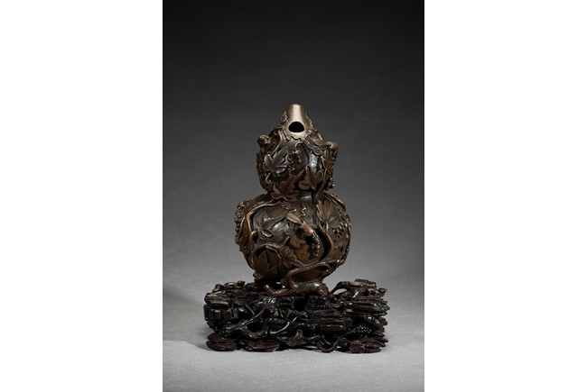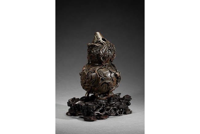 Modelled in the form of double gourd, cast to the exterior with meandering grapes vine and gnarled branches issuing from the base, with a circular opening to the top, all supported on a reticulated zitan stand. Qing Dynasty Qianlong period.
