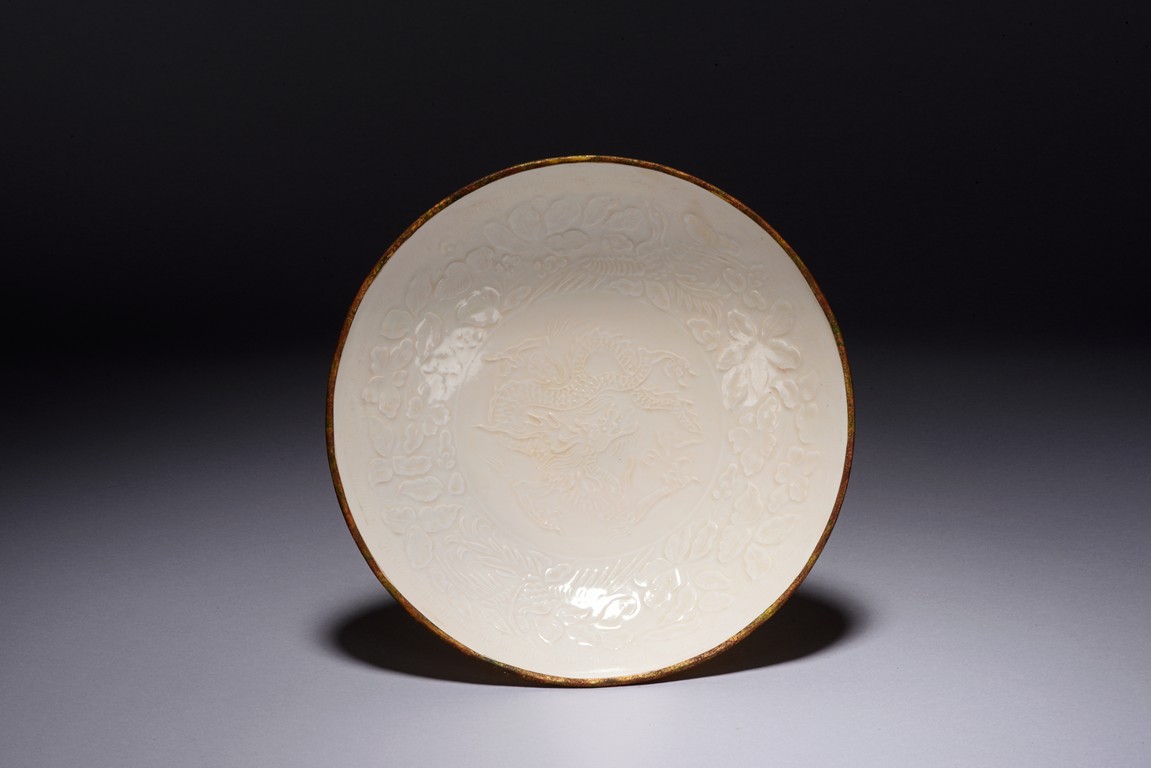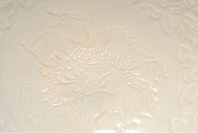 The interior of the dish moulded with a wrathful dragon to the center, surrounded by leafy floral scroll. Republic period.