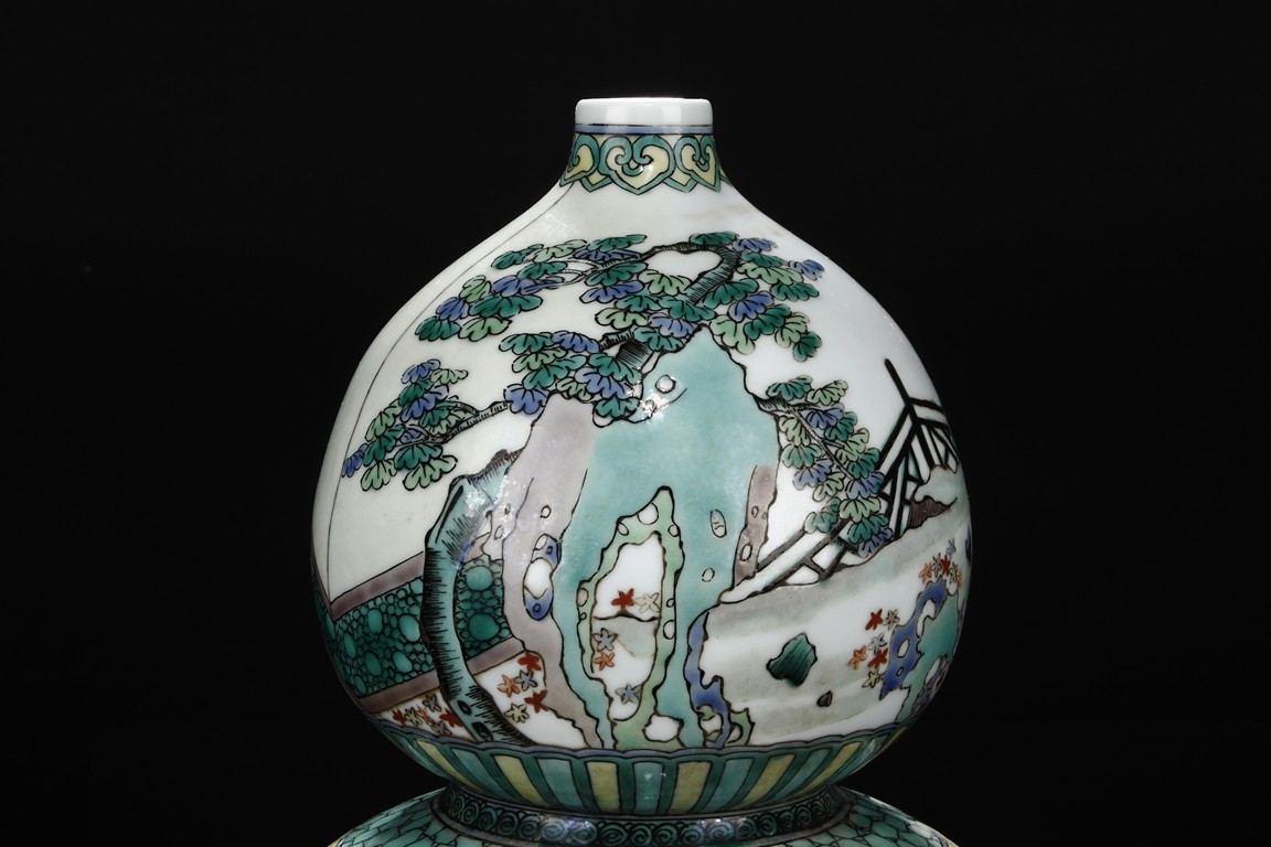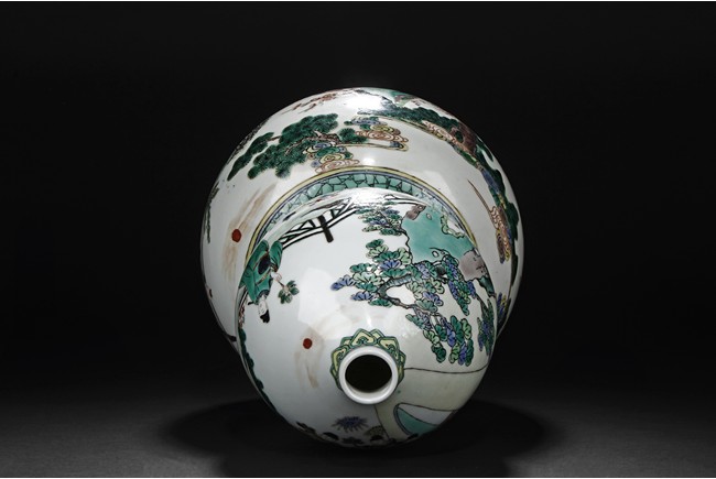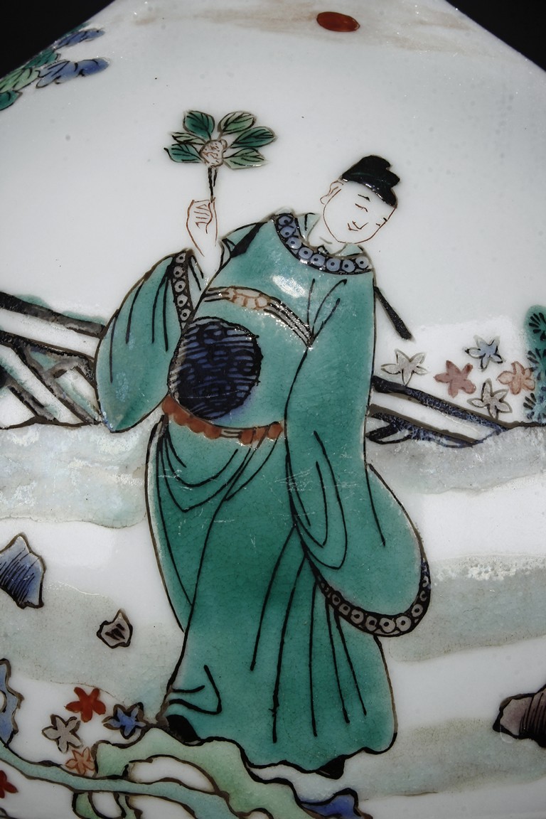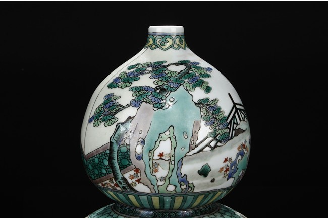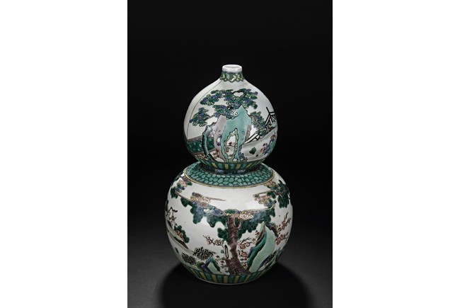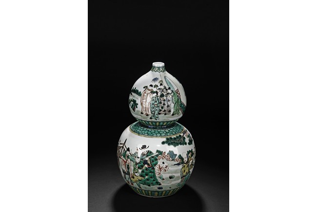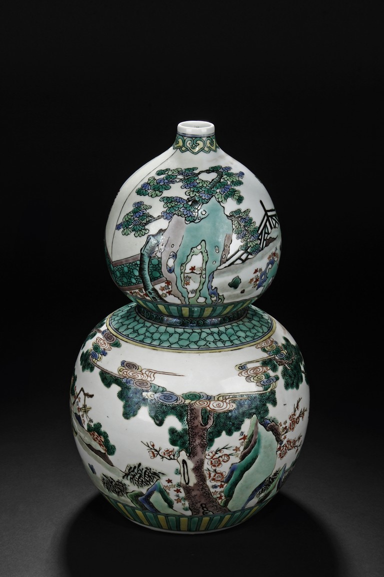 Of double gourd form, the wucai vase depicts garden and outdoor scenery, with Fu, Lu, and Shou Immortals and officials on the outside, surrounded by pine trees, plum flowers, and viewing stones on the lower gourd, and a group of scholars conversing in a garden on the upper gourd. Qing Dynasty period.