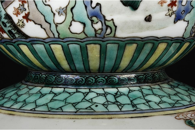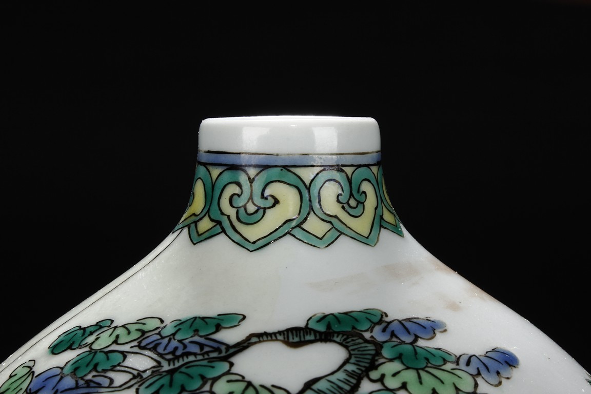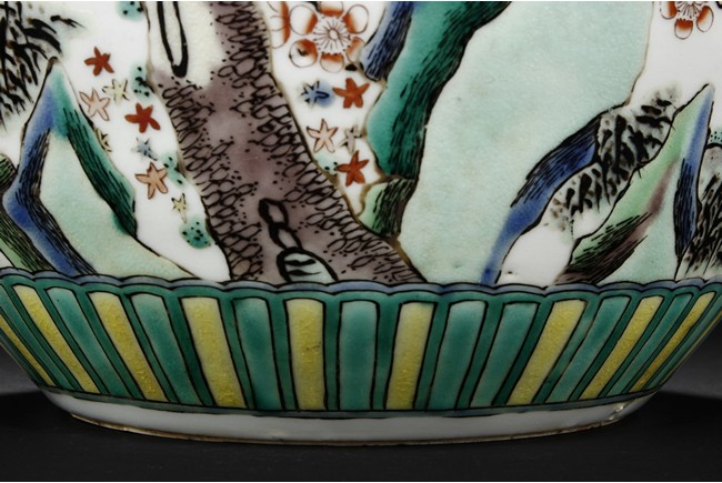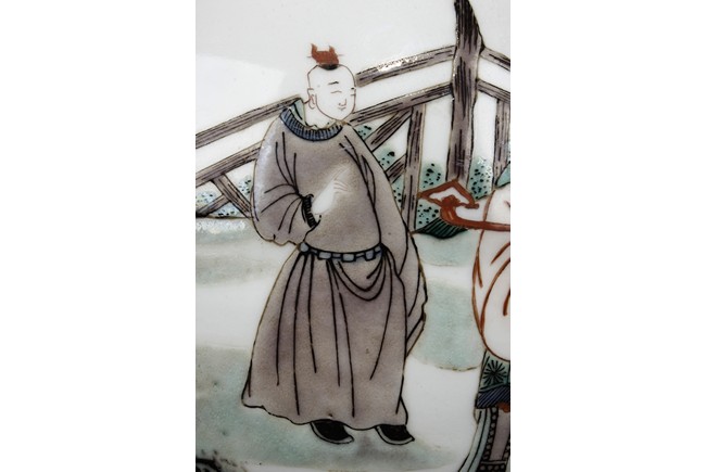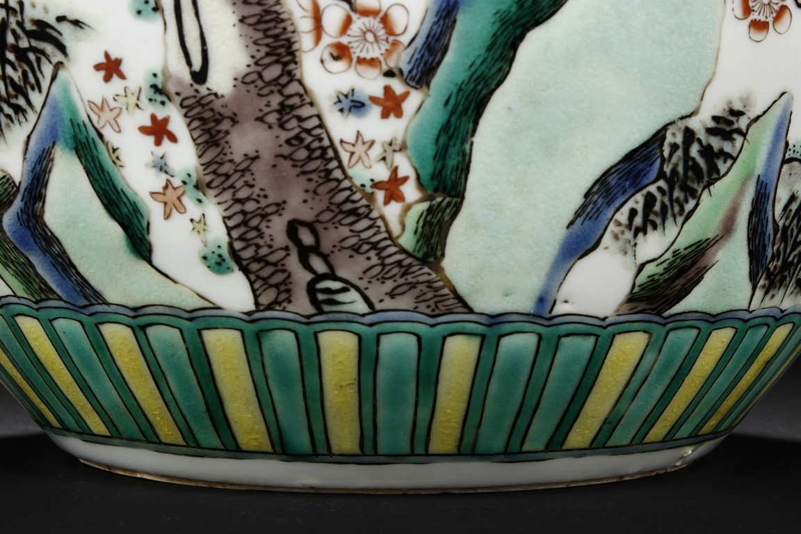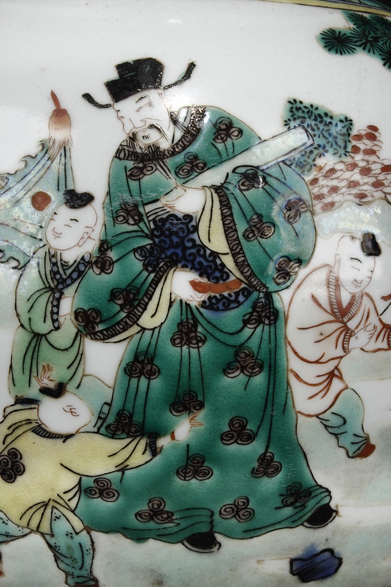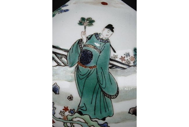 Of double gourd form, the wucai vase depicts garden and outdoor scenery, with Fu, Lu, and Shou Immortals and officials on the outside, surrounded by pine trees, plum flowers, and viewing stones on the lower gourd, and a group of scholars conversing in a garden on the upper gourd. Qing Dynasty period.