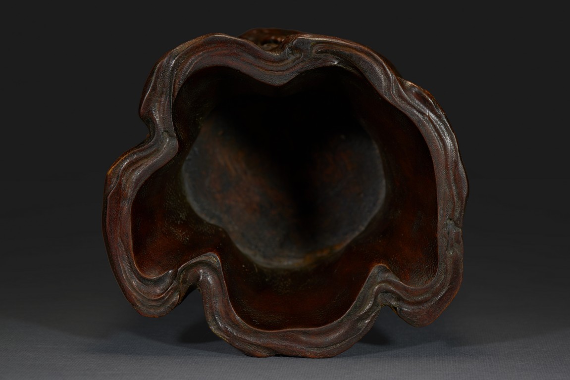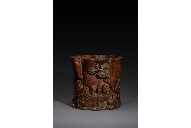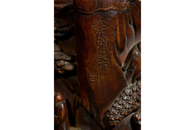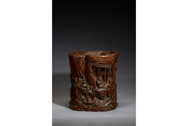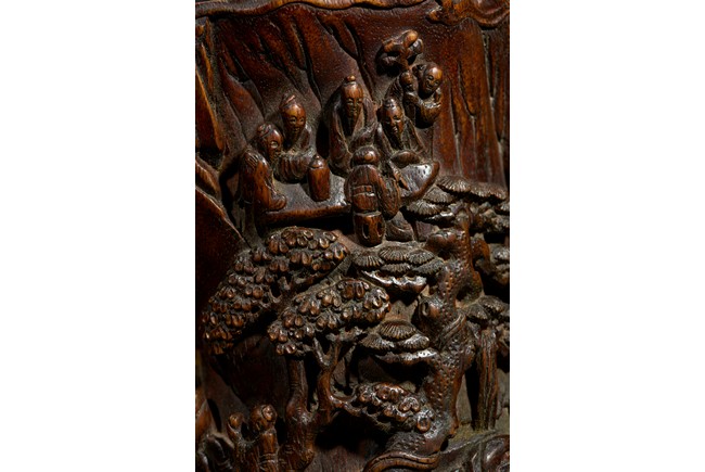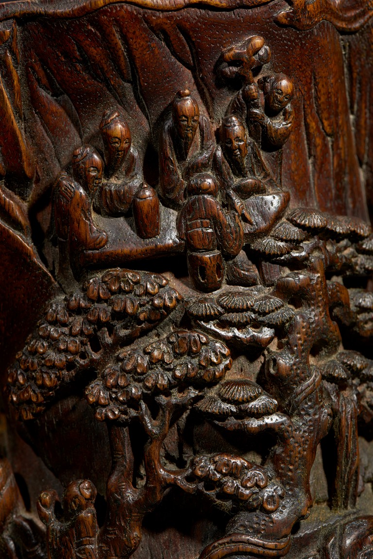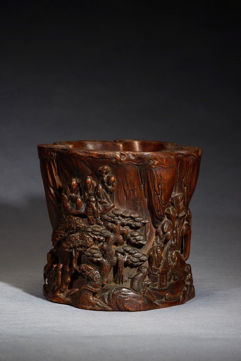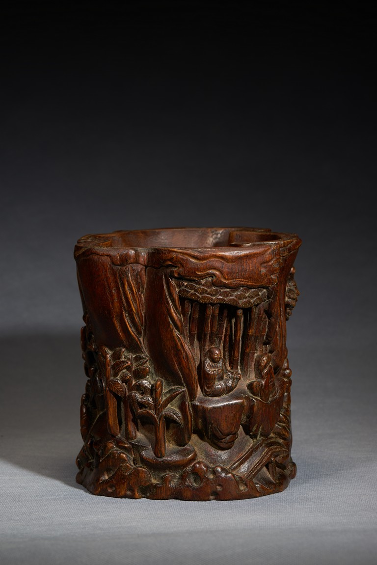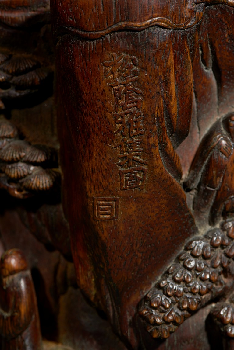 Naturalistically carved in the form of a tree trunk, the exterior finely carved in relief with a continuous scene of literati engaging in various scholarly leisures in a deep mountain setting, with five character inscription and seal mark on the rockwork. Qing Dynasty period.