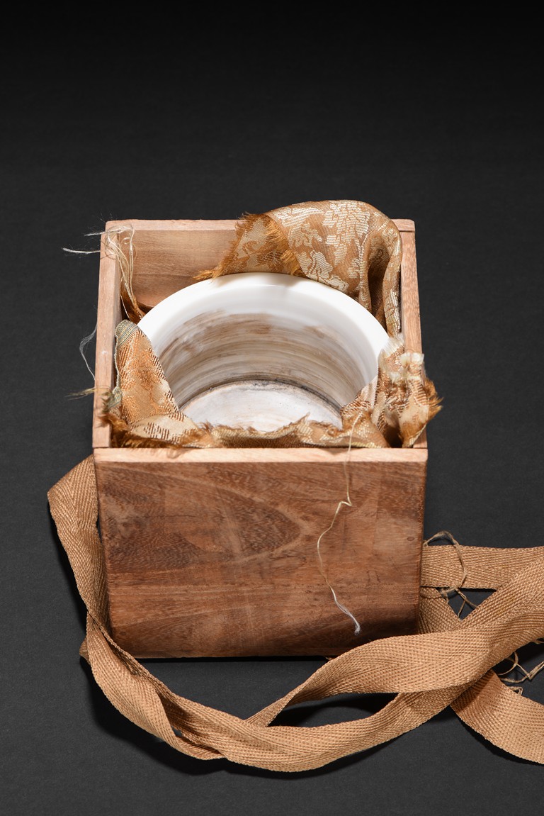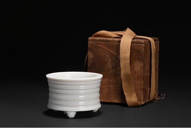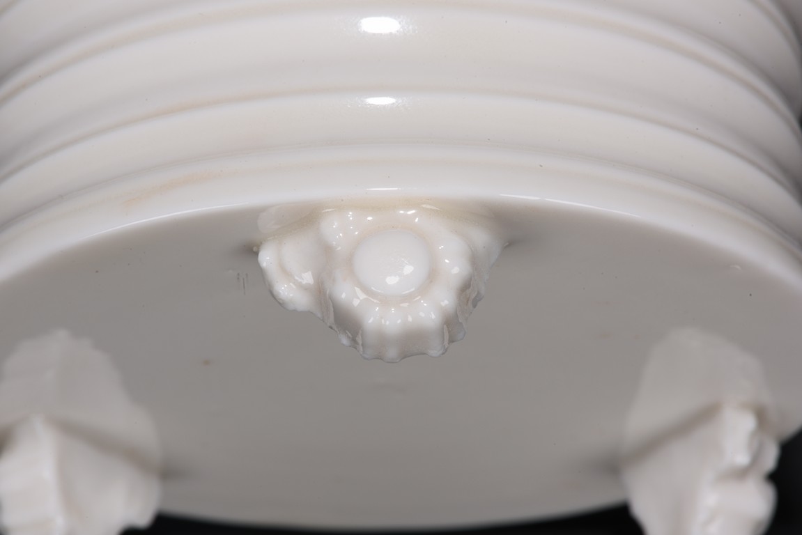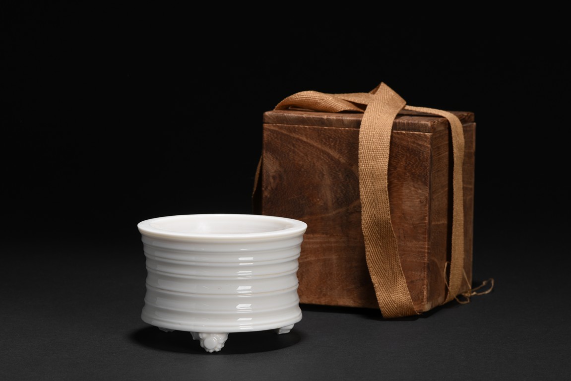 The censer is raised on three ruyi-form feet and is moulded with shallow bands around the exterior, covered in a transparent glaze of very pale bone tone. Qing Dynasty period.