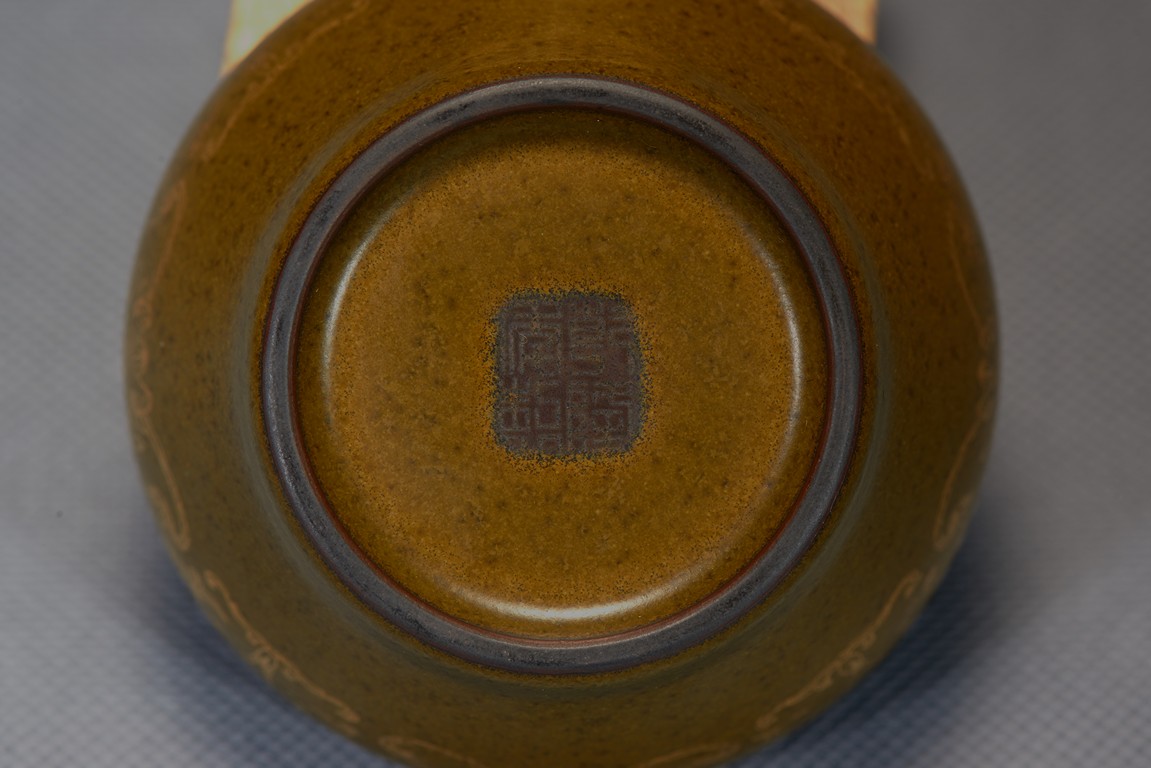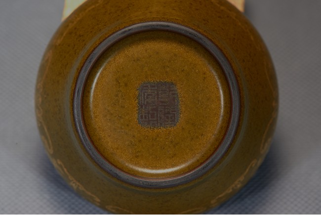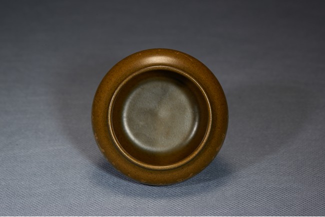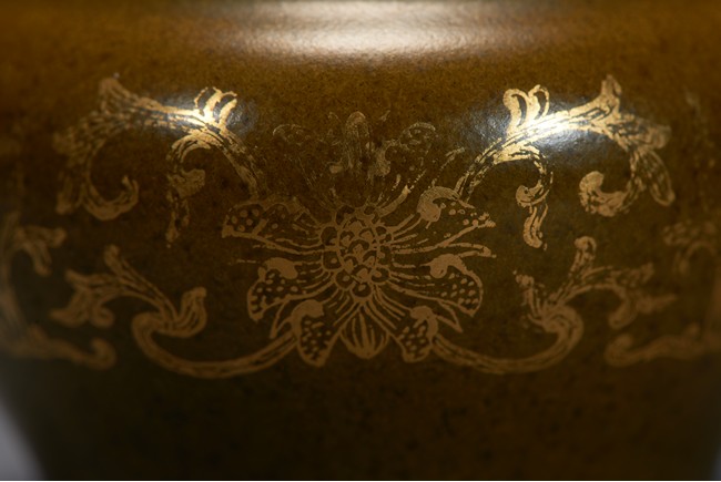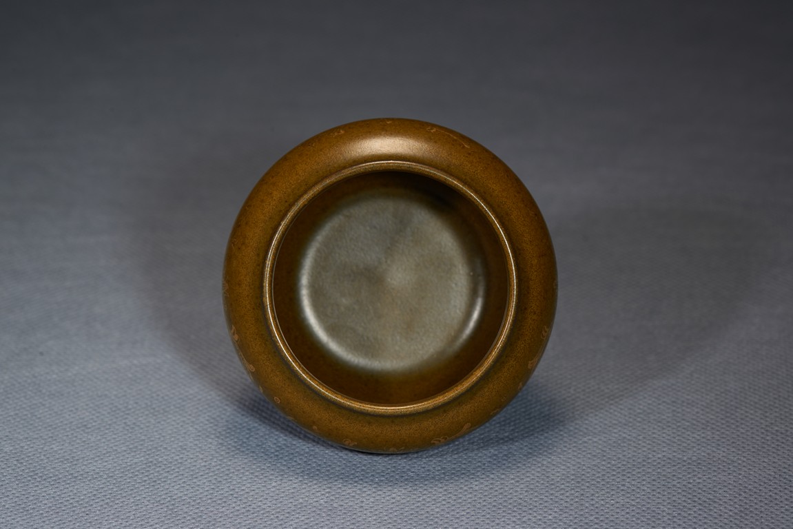 The waterpot rising to a broad shoulder, overall covered with tea-dust glaze and painted in gilt with a band of scrolling lotus. The base bears a four character 'QIANLONG' mark. Qing Dynasty period.