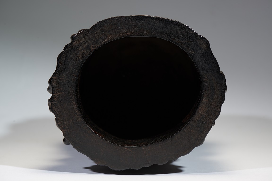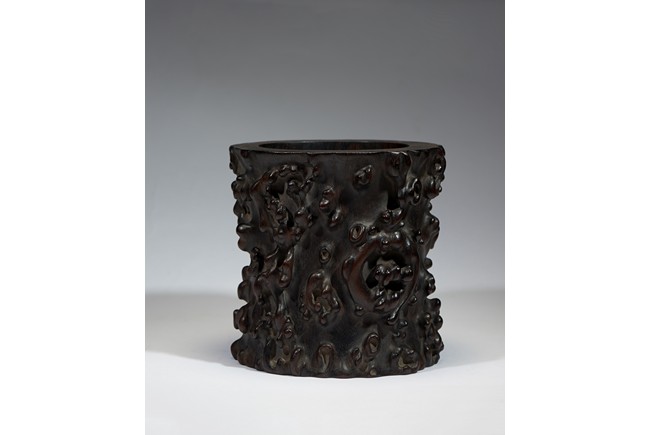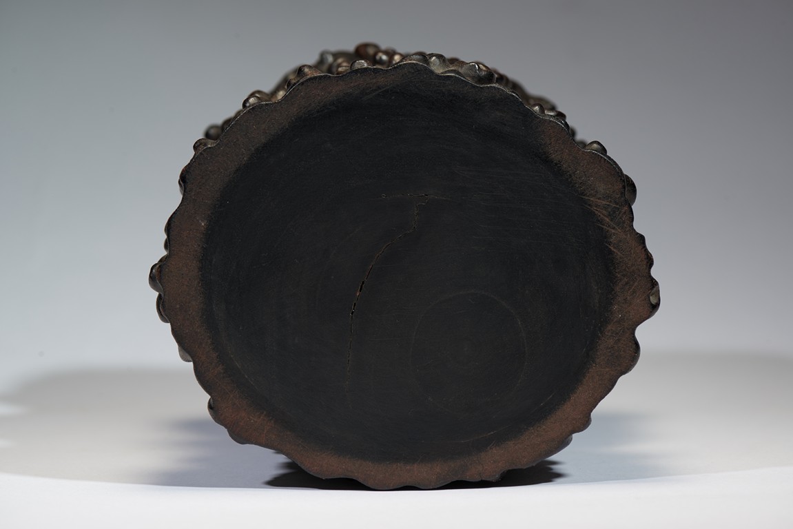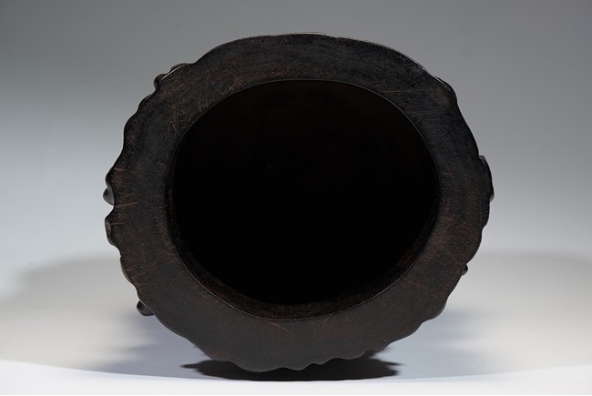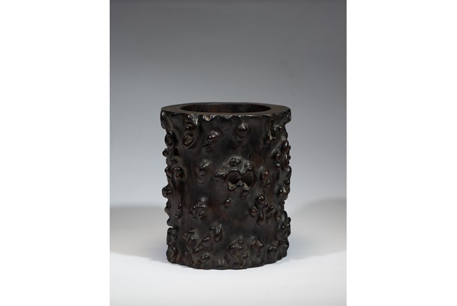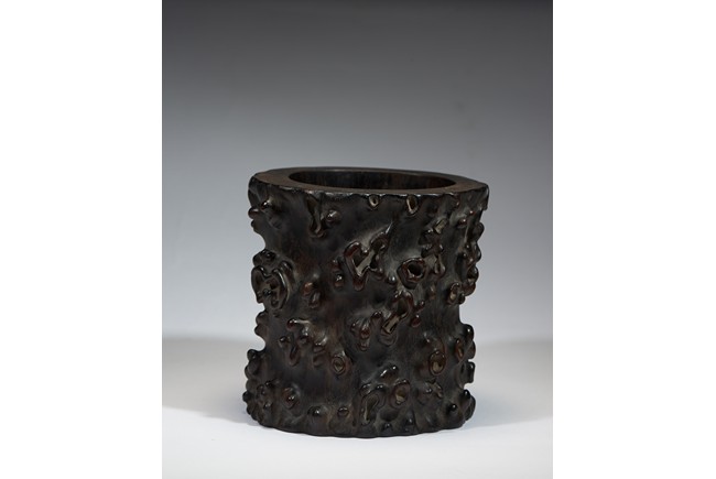 Of irregular cylindrical shaped and in the form of gnarled wood tree section, the wood is of rich dark brown patina and numerous crevices. Qing Dynasty period.