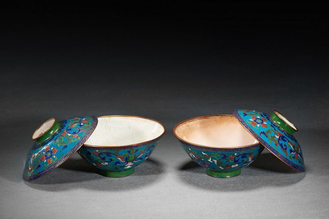 Each supported on short straight foot, the exterior of the body finely enamelled with scrolling lotus flanked by key-fret and lappet borders on both rims, all against turquoise ground, the domed cover enamelled in green, with four character mark inside. Late Qing Dynasty period.