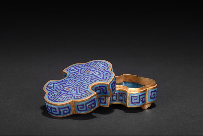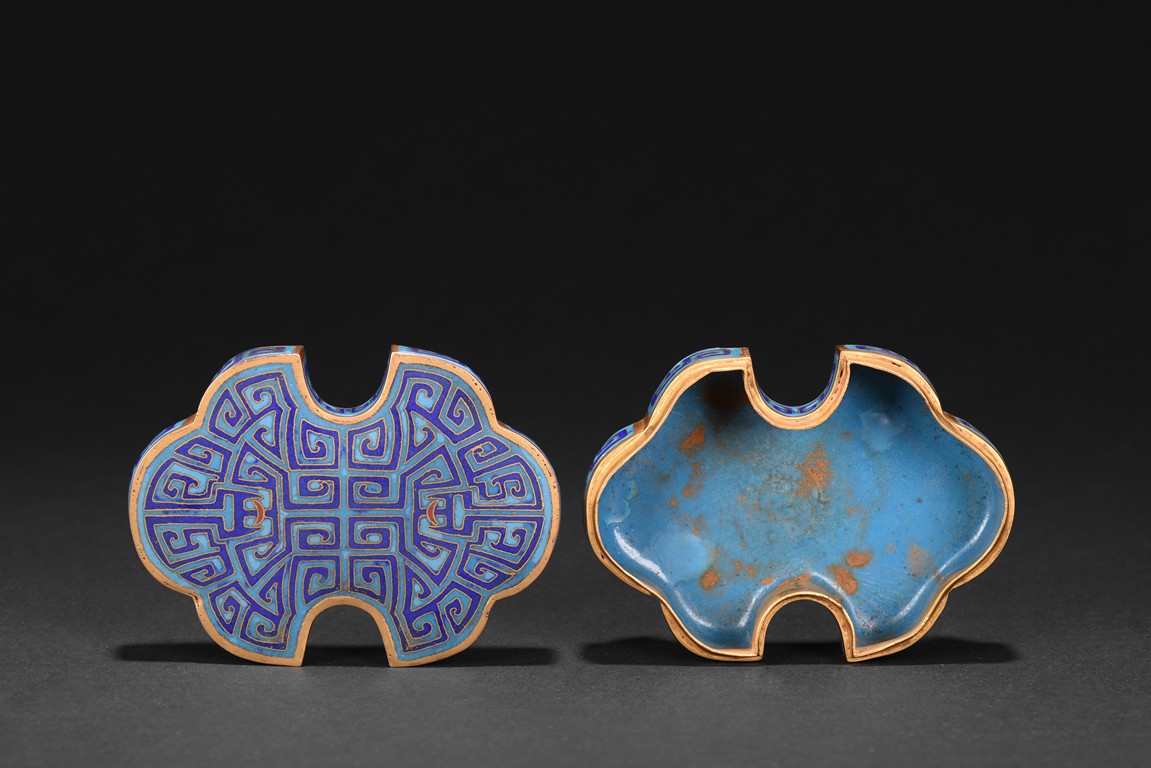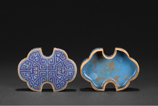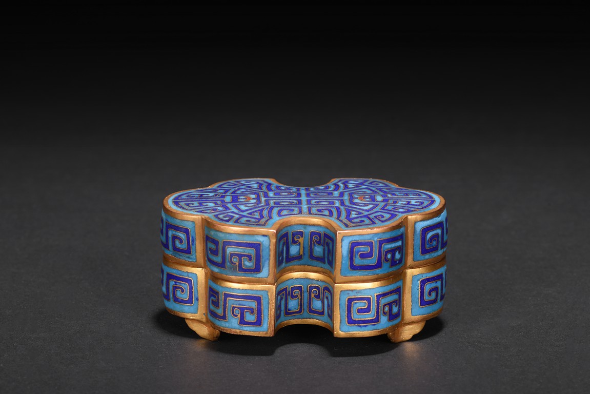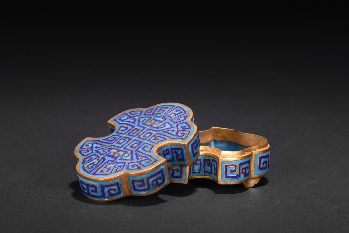 The box is modelled with double ruyi-head form, the cover exterior enamelled with symmetrical archaistic scroll pattern reserved on blue background, the underside in gilt. Late Qing Dynasty period.