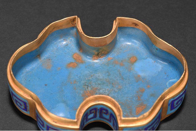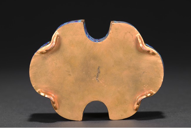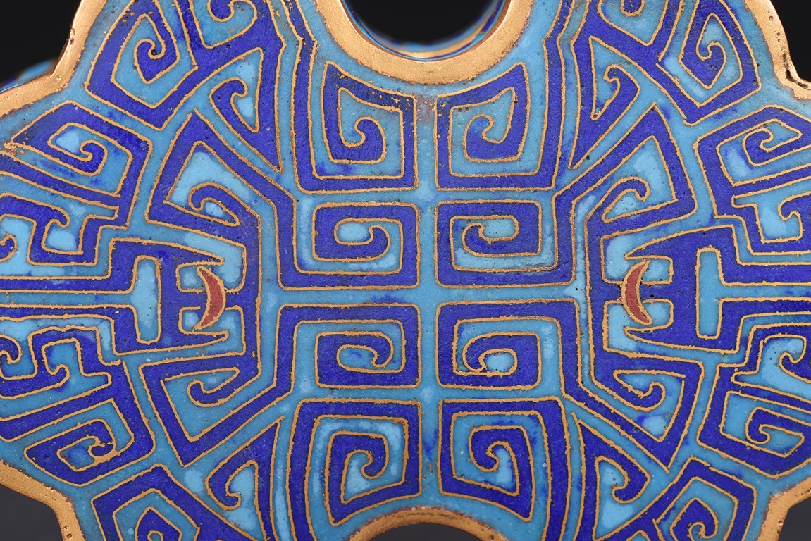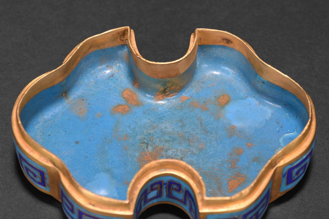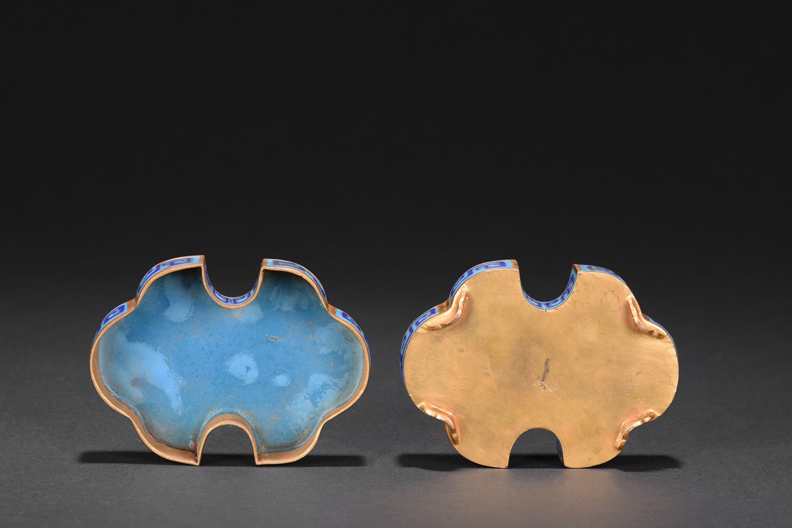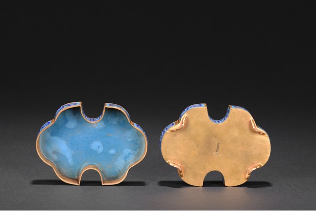 The box is modelled with double ruyi-head form, the cover exterior enamelled with symmetrical archaistic scroll pattern reserved on blue background, the underside in gilt. Late Qing Dynasty period.