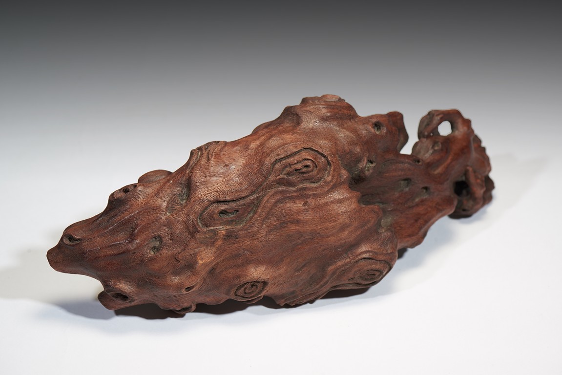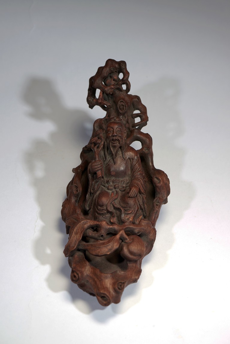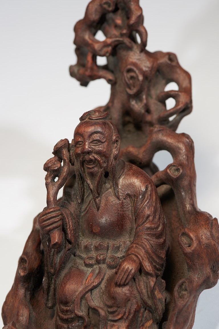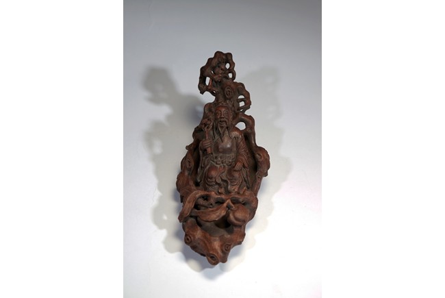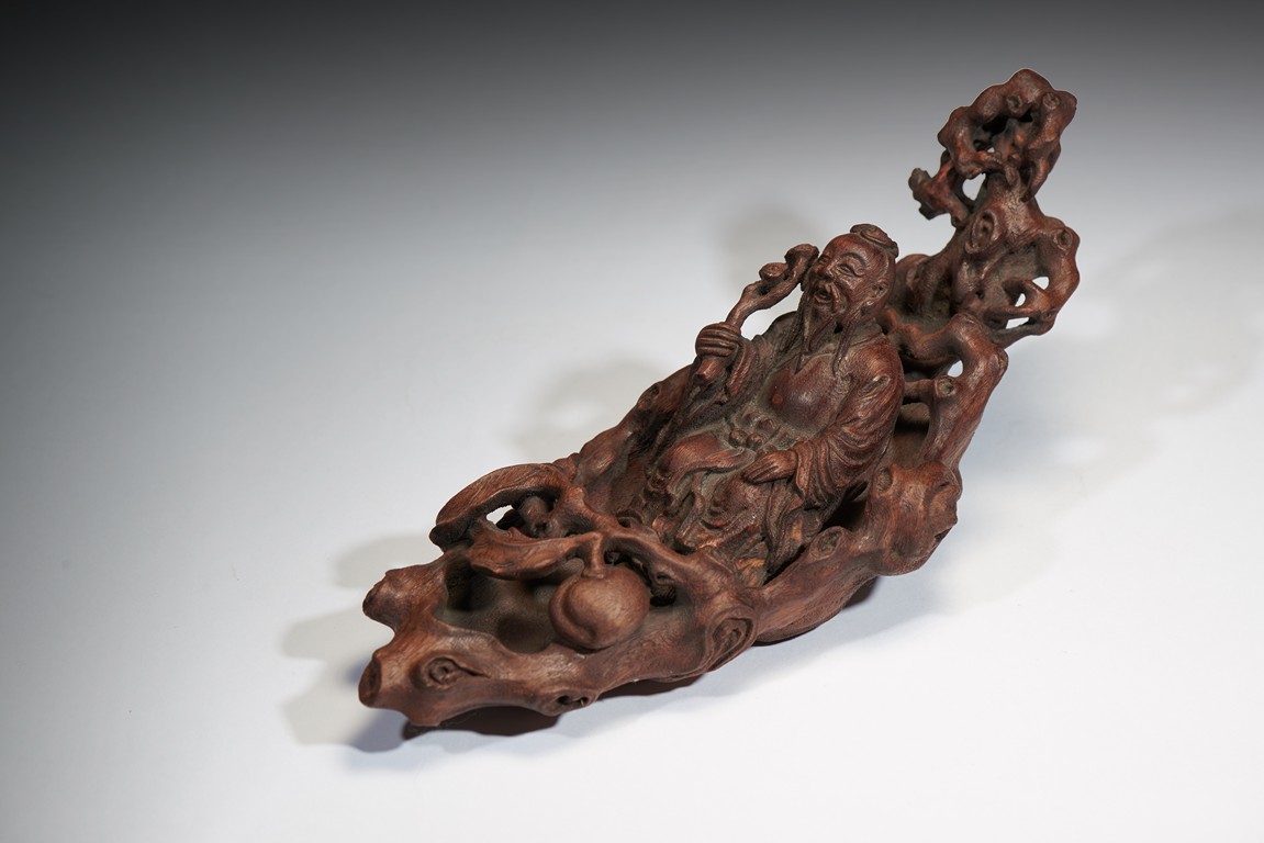 Vividly depicting an elderly immortal sitting upon a large gnarled tree branch as a log boat as if travelling through turbulent waves, holding a lingzhi branch on right hand, his face shown with joyful expression. Qing Dynasty period.