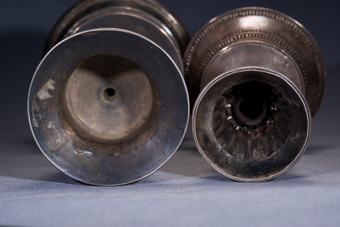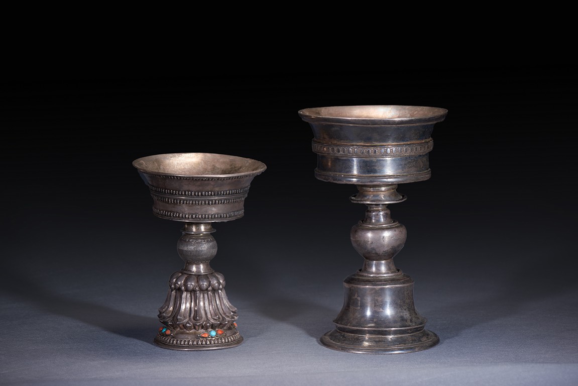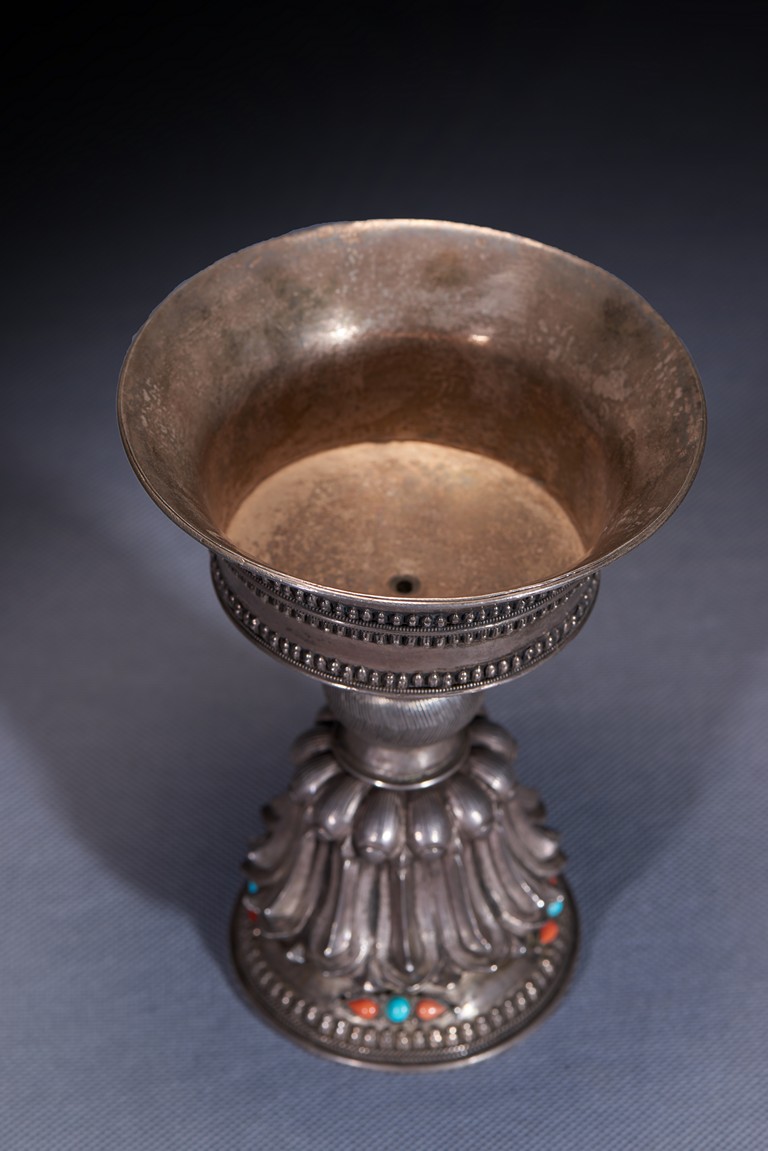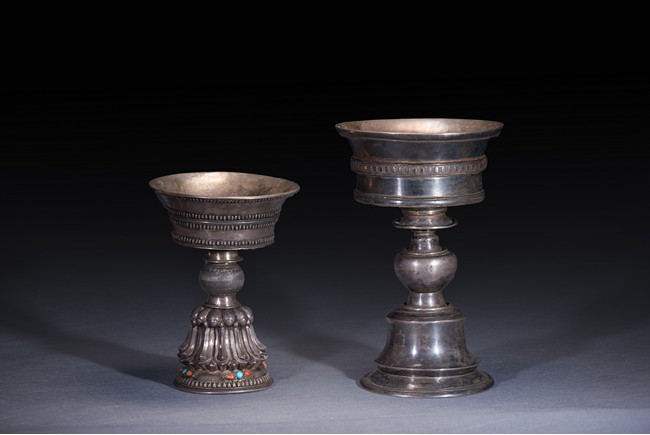 Each of fine repoussé, the tall spreading lotus-petal foot inlaid with coral and turquoise beads, the bell-shaped bowl with decorative bands. Qing Dynasty period.