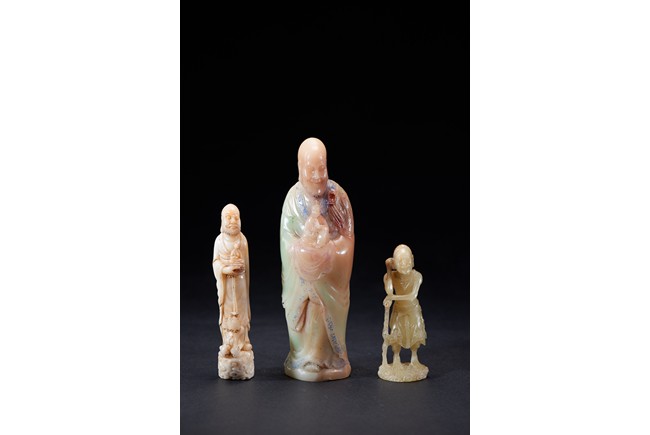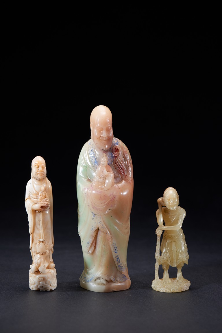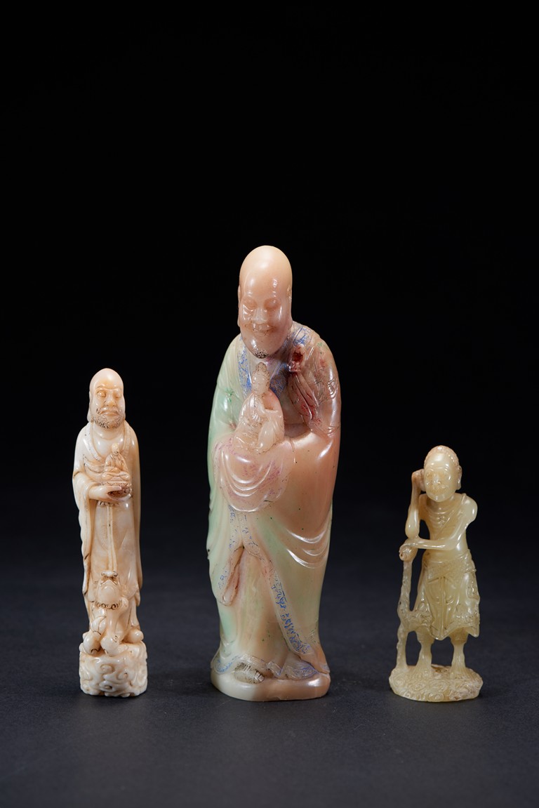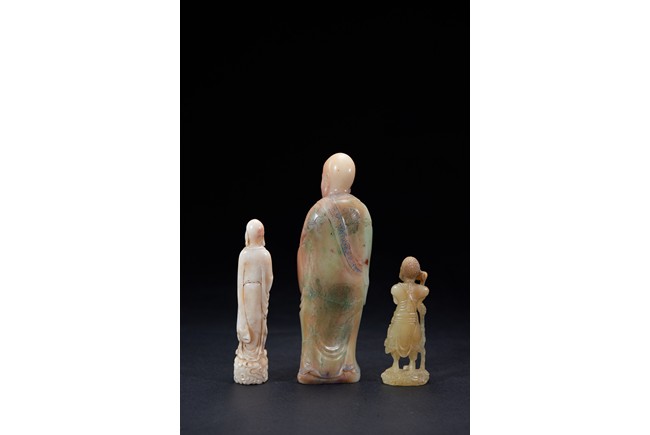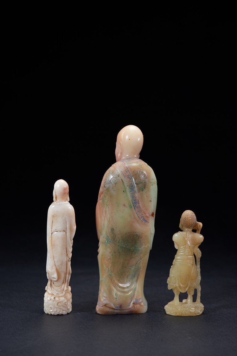 The group consists of three luohan figures, including a luohan holding a small bodhisattva statue one hand, with a buddhist lion underneath; a standing luohan wearing long robe holding a small bodhisattva on both hands; an emaciated luohan holding a stick on one hand. Qing Dynasty period.