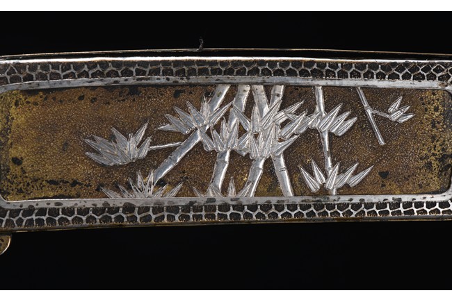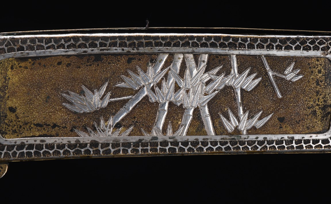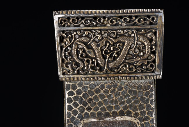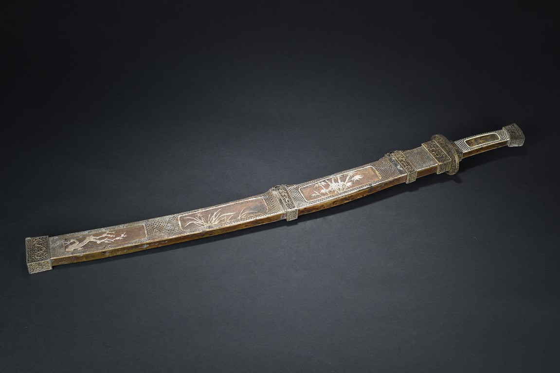 The metal blade slightly curved, its scabbard and handle wrapped in imitation of shagreen with and mounted with bronze reticulated with scroll pattern. Qing Dynasty period.