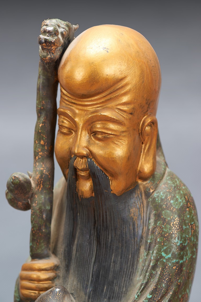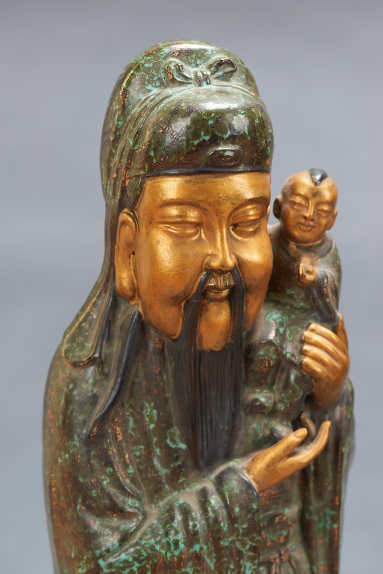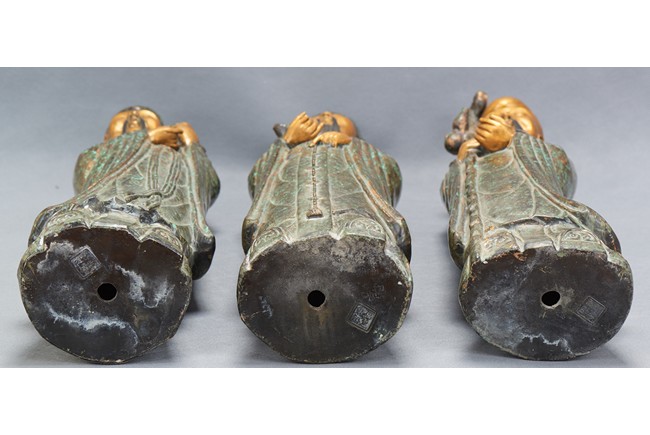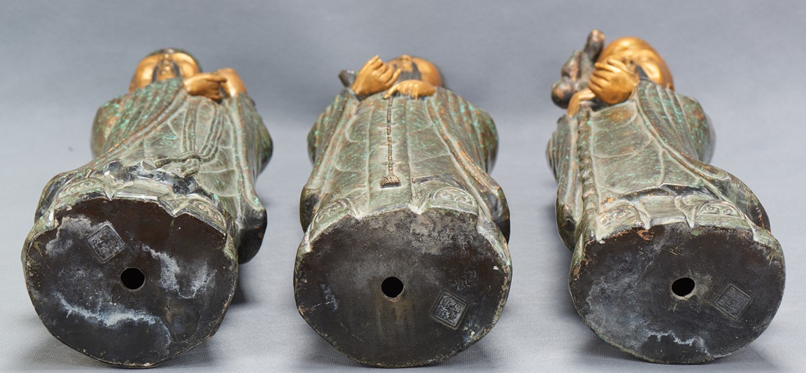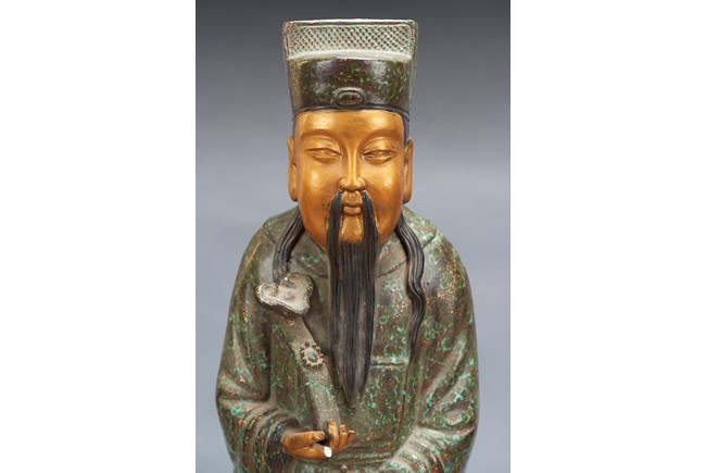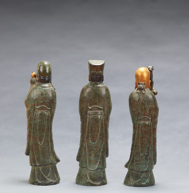 The group comprises of three large glazed immortal figures, fu, lu, and shou, each representing prosperity, status and longevity, each wearing long robe with elegant folds, glazed with flecks of robin's egg blue, the face richly painted in gilt, the underside impressed with four character mark 'Fujian Hui Guan' which may be translated as Hokkien Association. Late Qing Dynasty period.