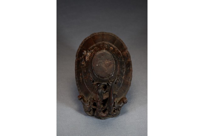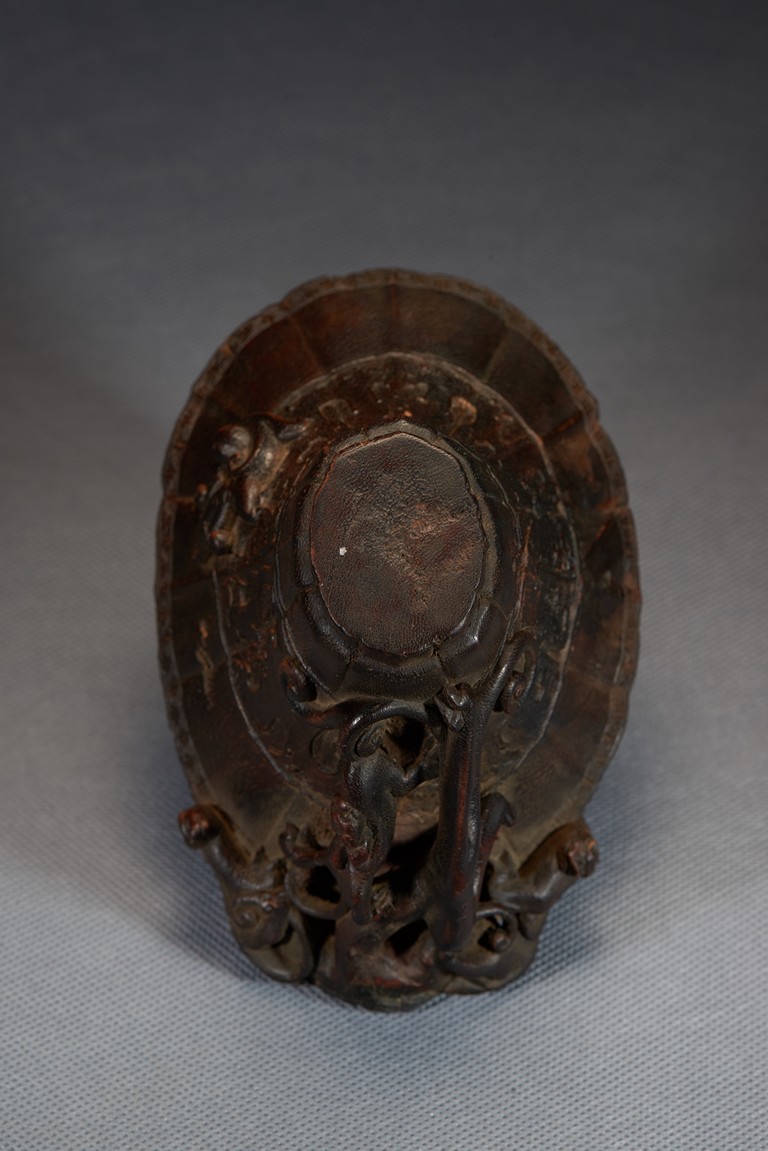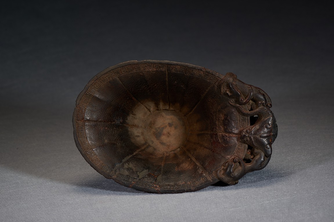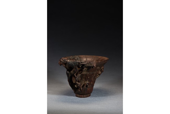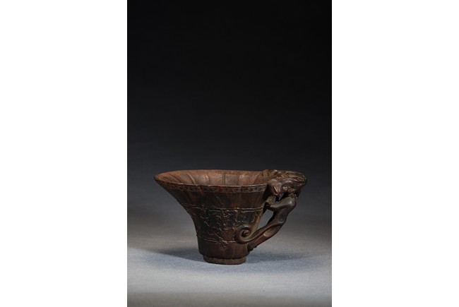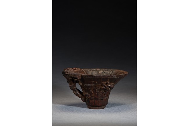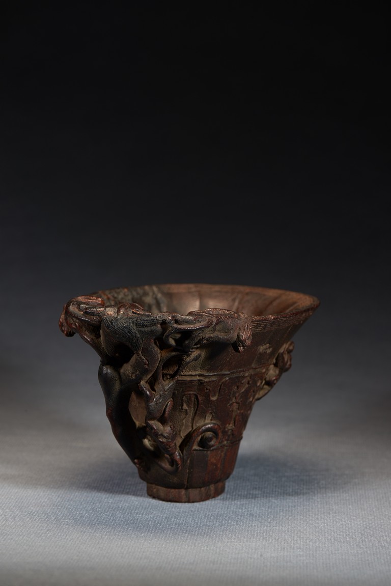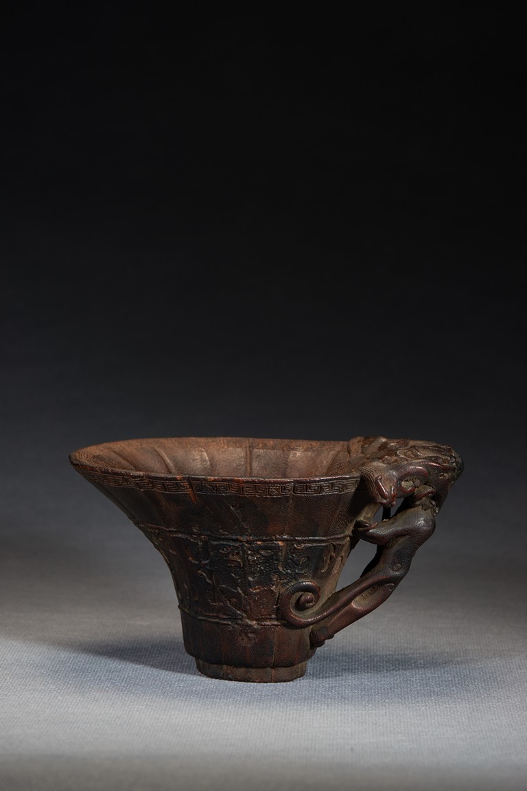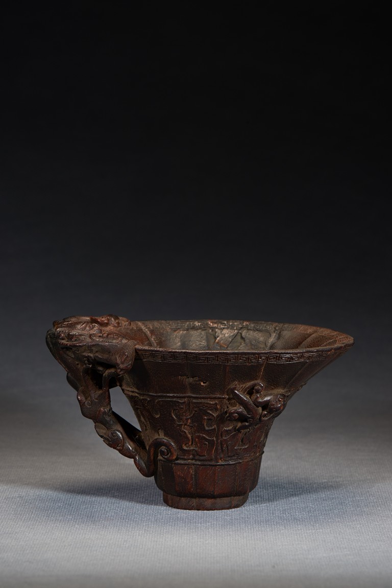 Modelled in imitation of horn libation cup, the exterior carved with a larger and smaller stylized chilong, the larger forming the handle, the body delicately carved with archaistic taotie masks on a geometric ground and another chilong under the lip. Qing Dynasty period.