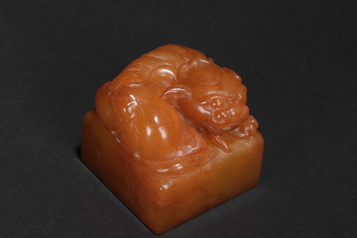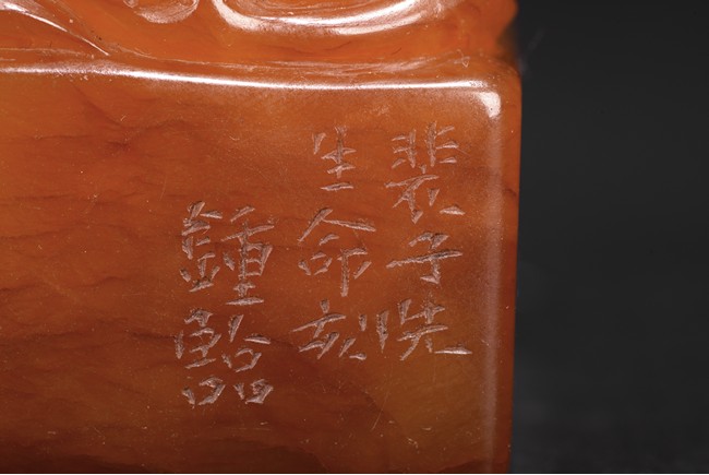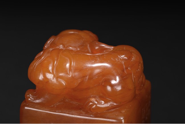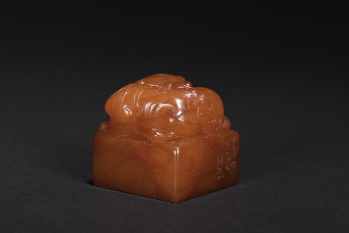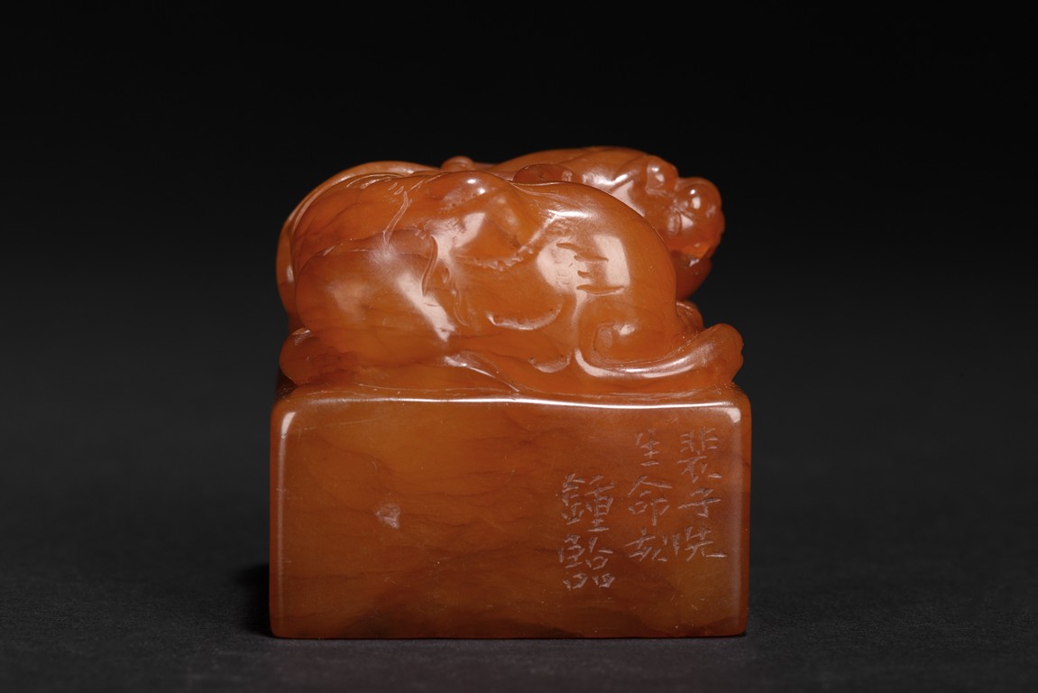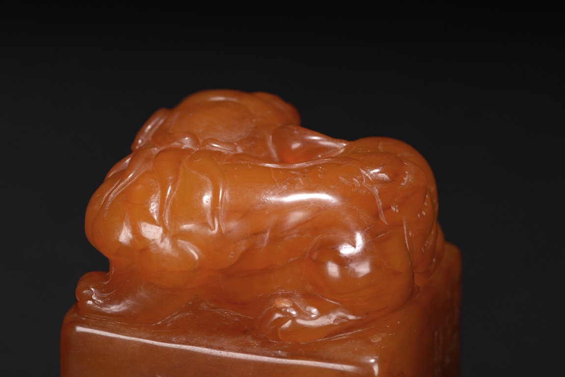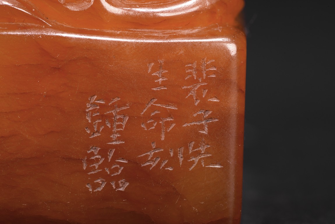 of square section and with well-polished sides, the seal is surmounted by a finial in the form of a recumbent lion with large snout and bulging eyes. One side is written with inscriptions attributed to Shao Peizi.The base is incised with characters in seal script. The stone is of a translucent rich caramel honey tone. Republic period.
