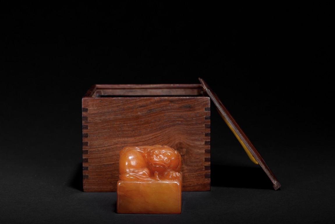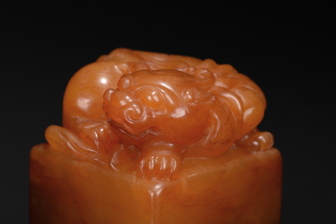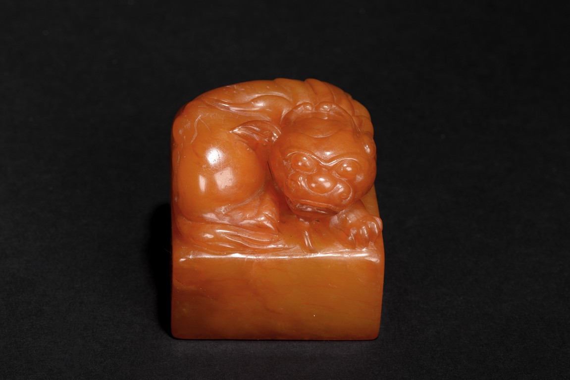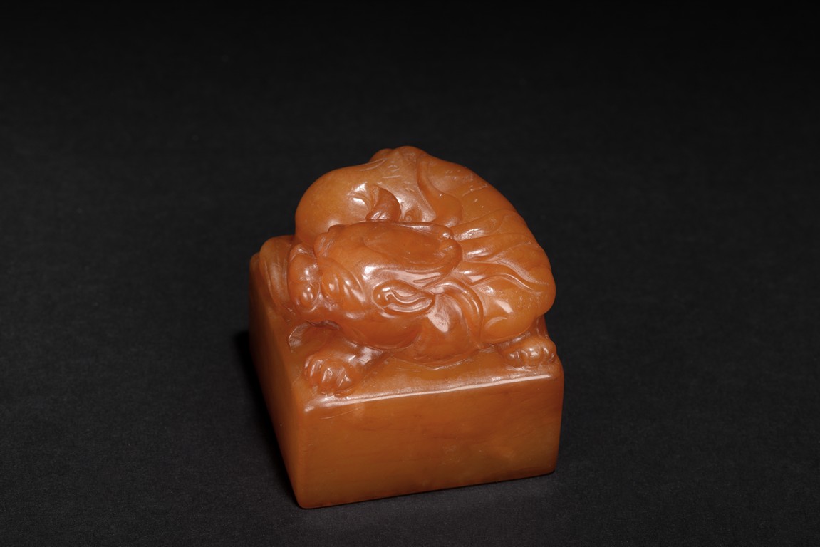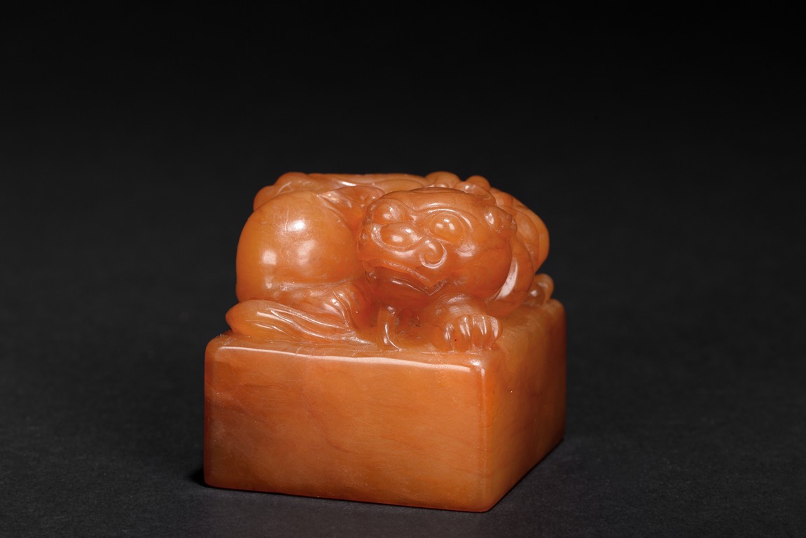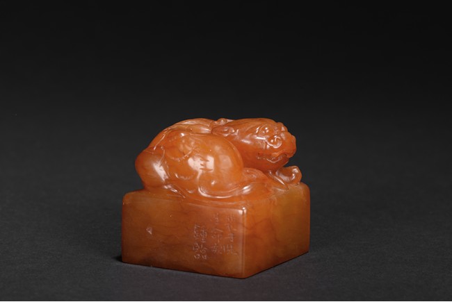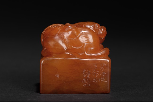 of square section and with well-polished sides, the seal is surmounted by a finial in the form of a recumbent lion with large snout and bulging eyes. One side is written with inscriptions attributed to Shao Peizi.The base is incised with characters in seal script. The stone is of a translucent rich caramel honey tone. Republic period.
