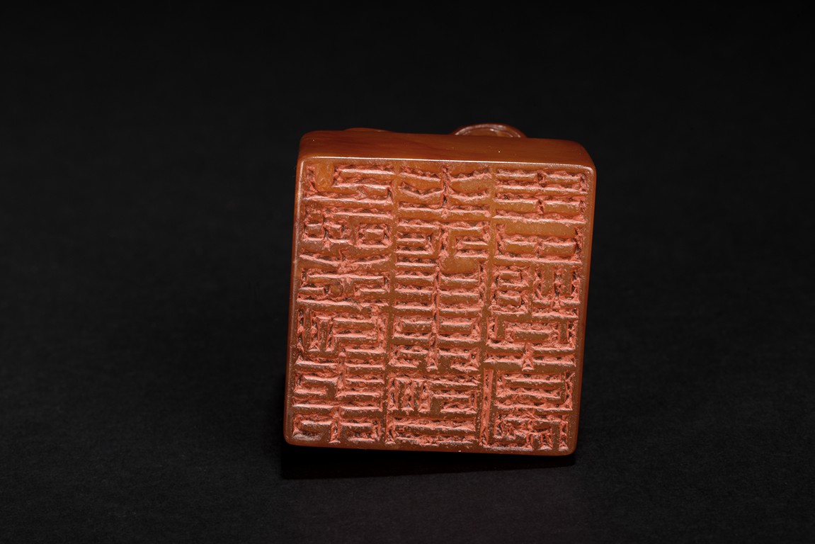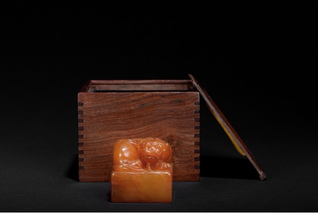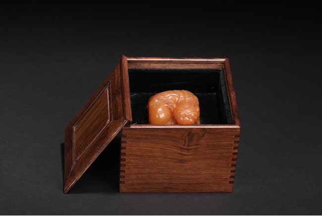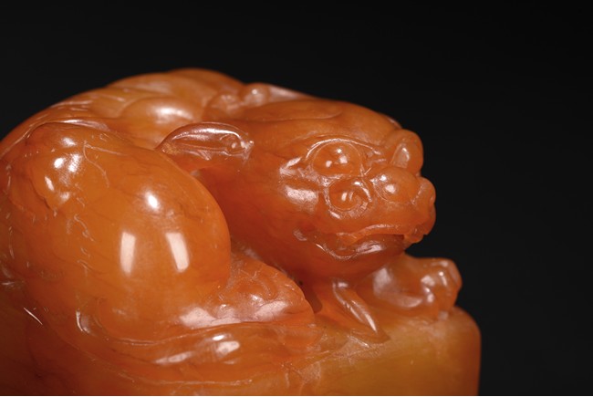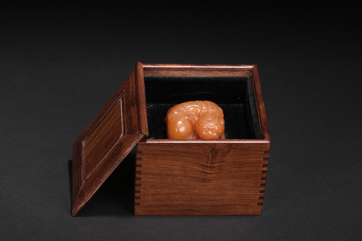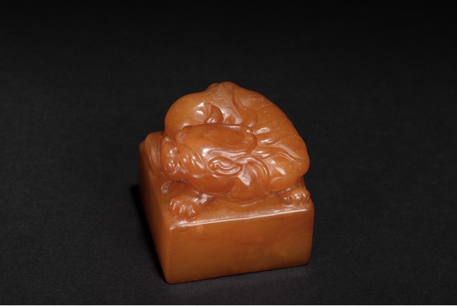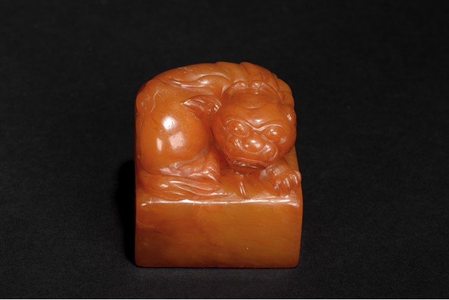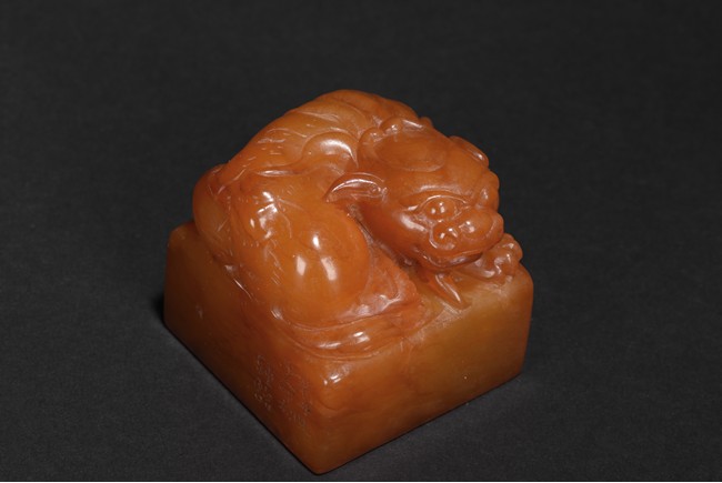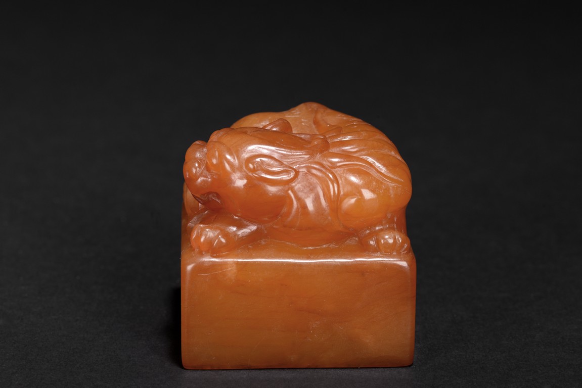 of square section and with well-polished sides, the seal is surmounted by a finial in the form of a recumbent lion with large snout and bulging eyes. One side is written with inscriptions attributed to Shao Peizi.The base is incised with characters in seal script. The stone is of a translucent rich caramel honey tone. Republic period.