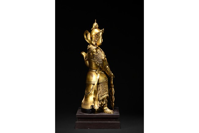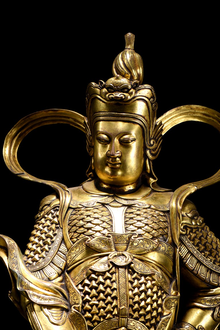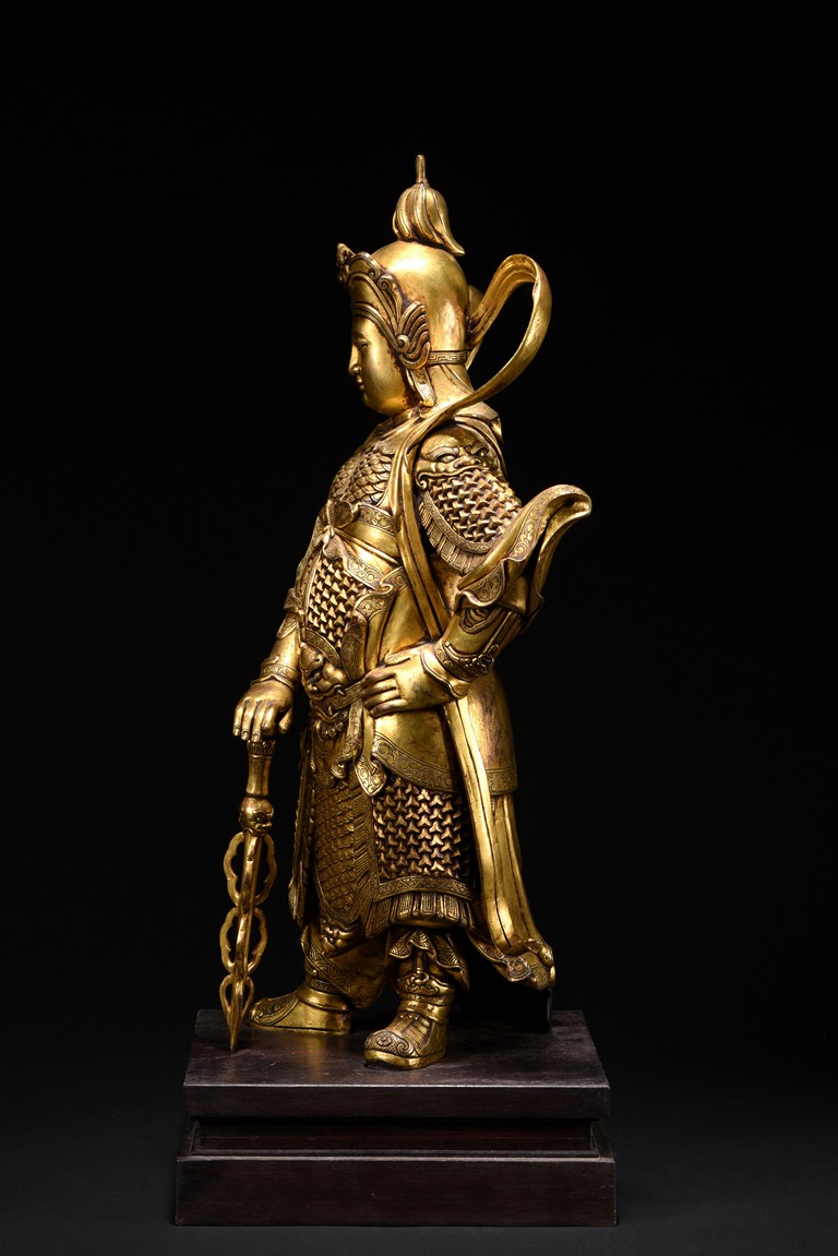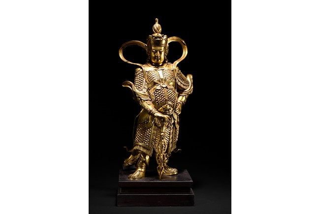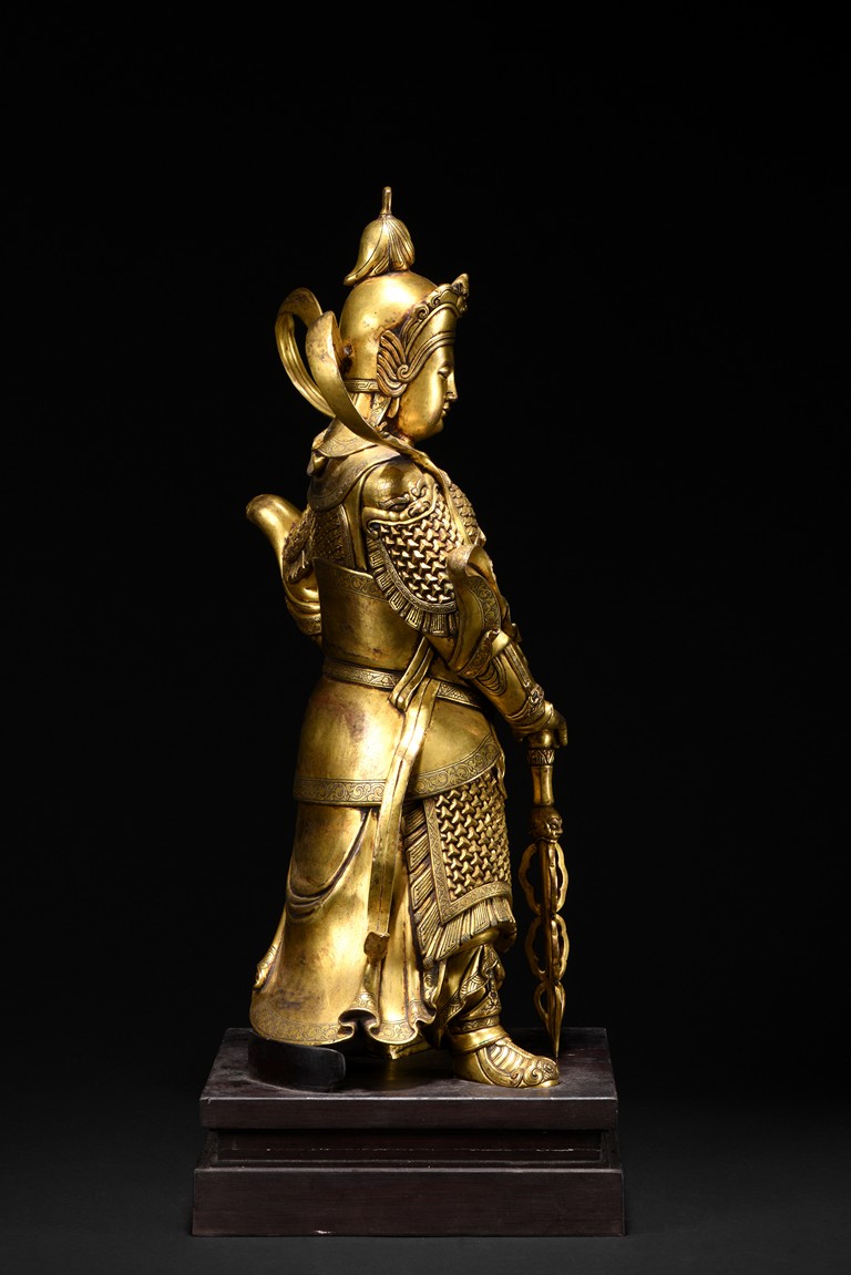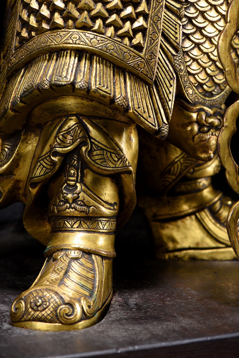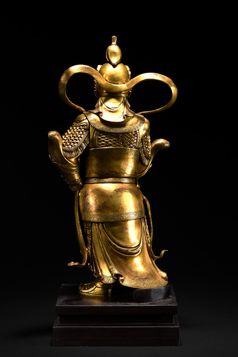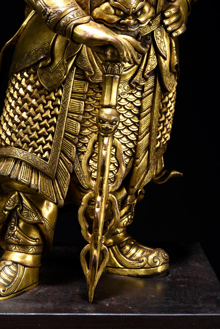 The figure is heavily cast as a warrior wearing elaborate armor, one hand holding a sword to the front, the other hand resting to his side, the face with a serene expression with a very gentle smile, with celestial ribbons flowing across his shoulders, all supported on a square stand. Qing Dynasty period.