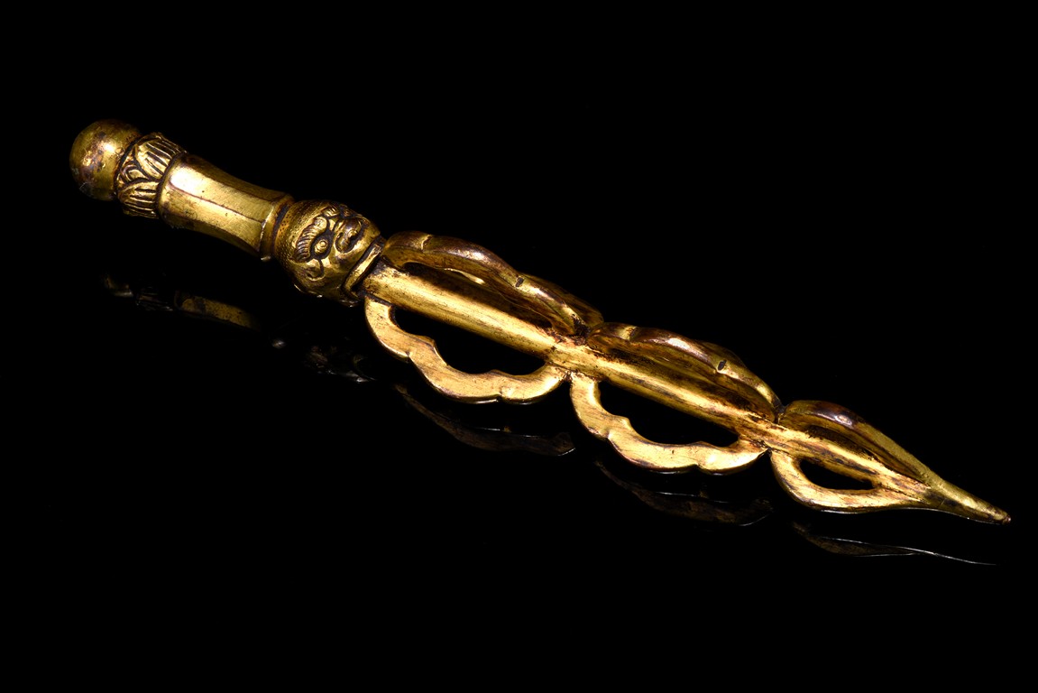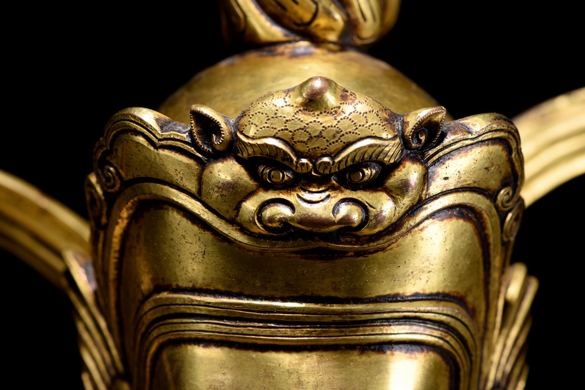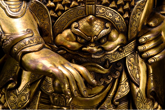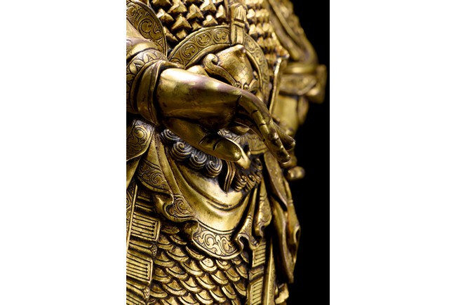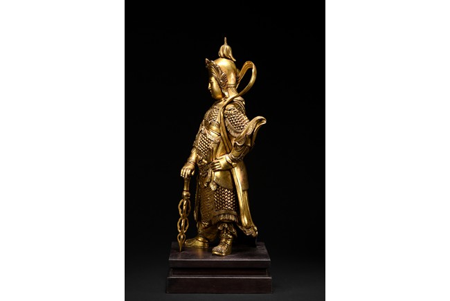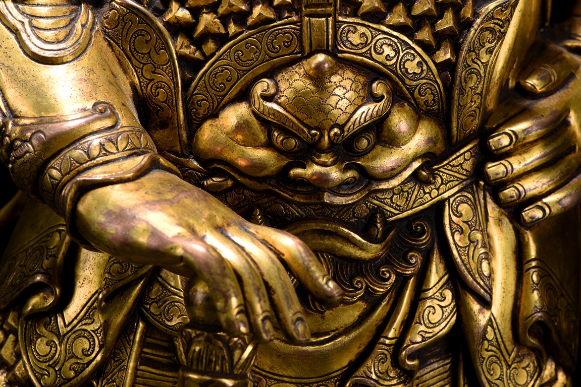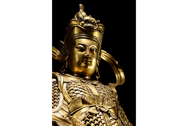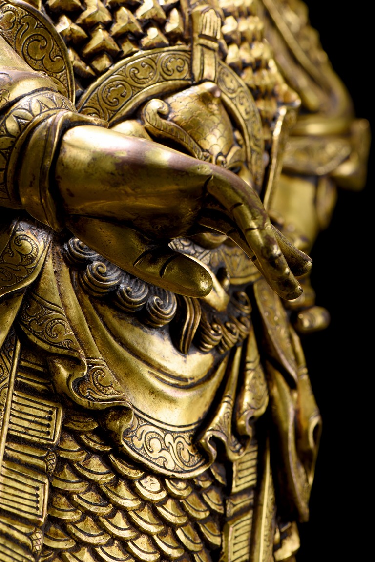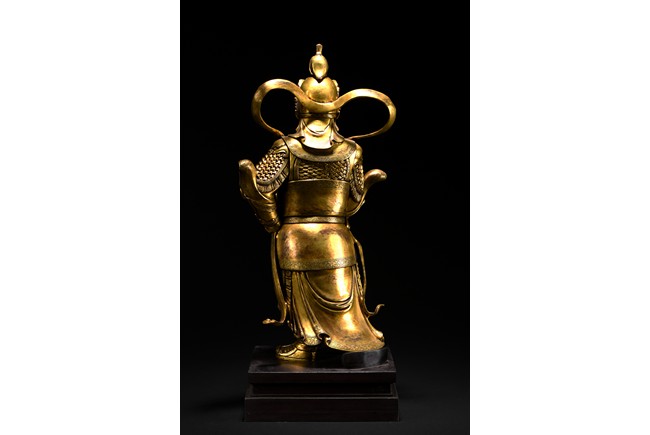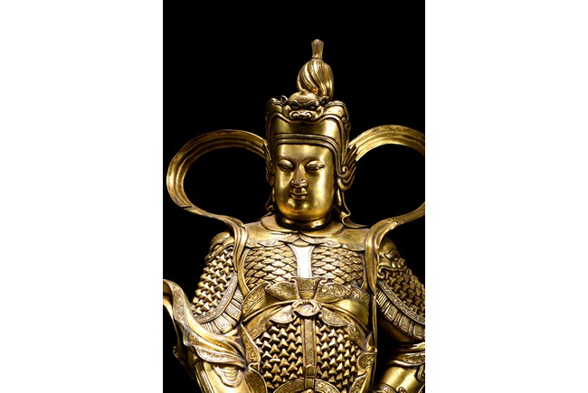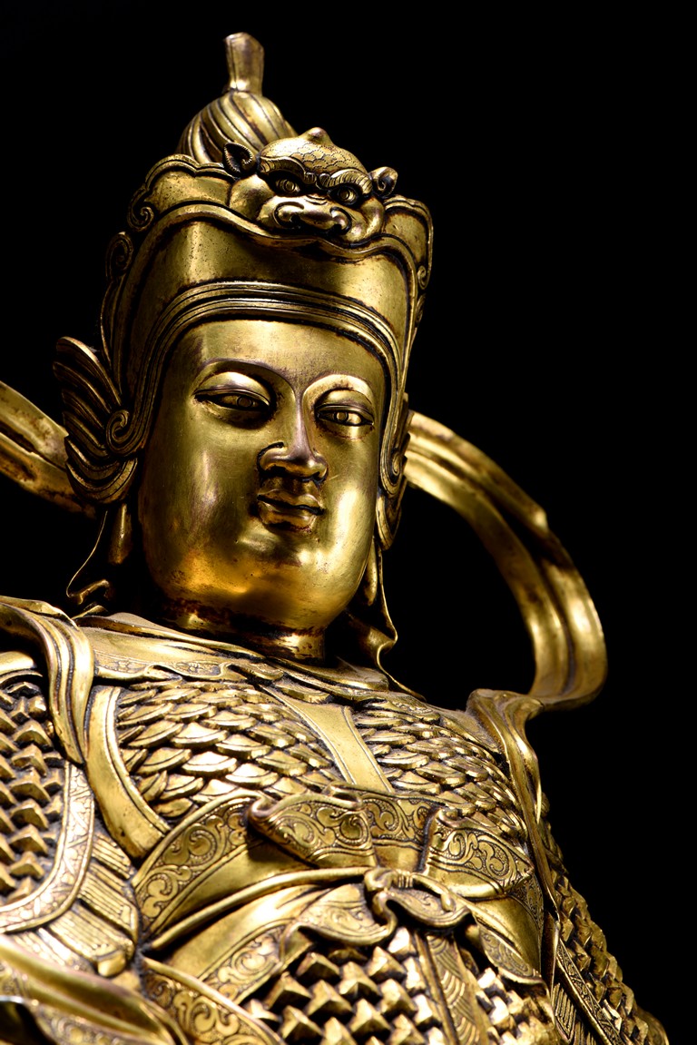 The figure is heavily cast as a warrior wearing elaborate armor, one hand holding a sword to the front, the other hand resting to his side, the face with a serene expression with a very gentle smile, with celestial ribbons flowing across his shoulders, all supported on a square stand. Qing Dynasty period.