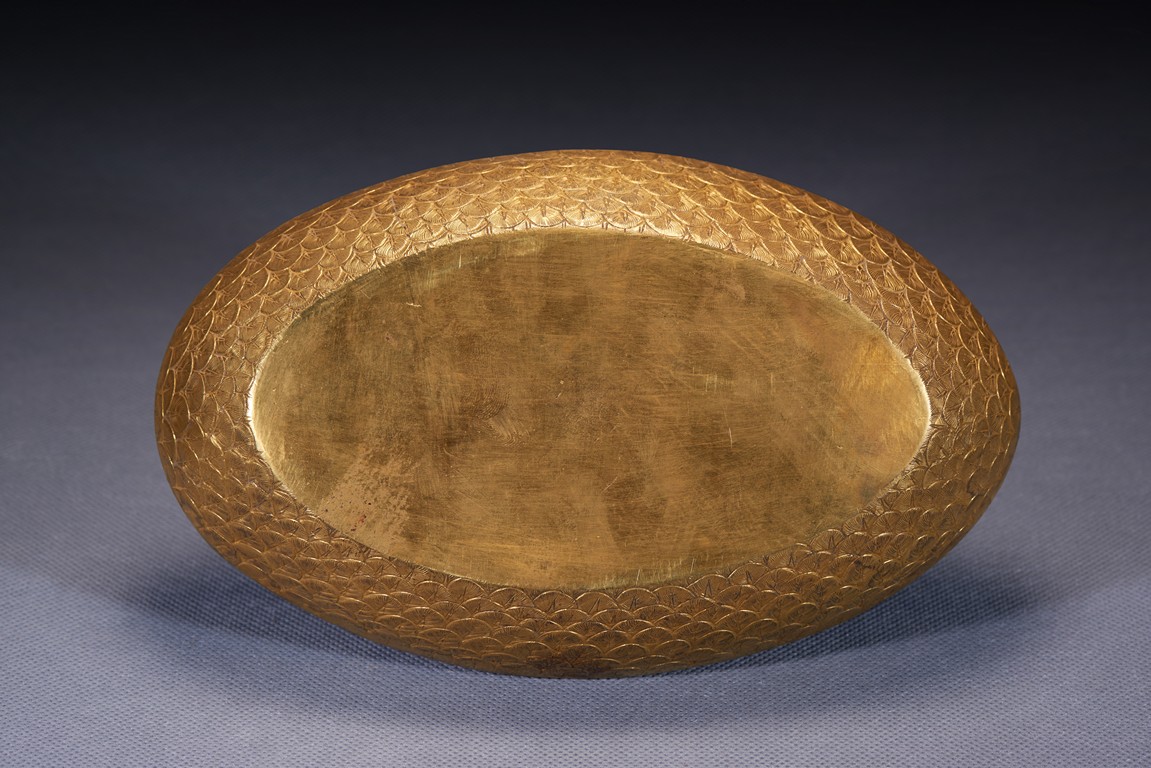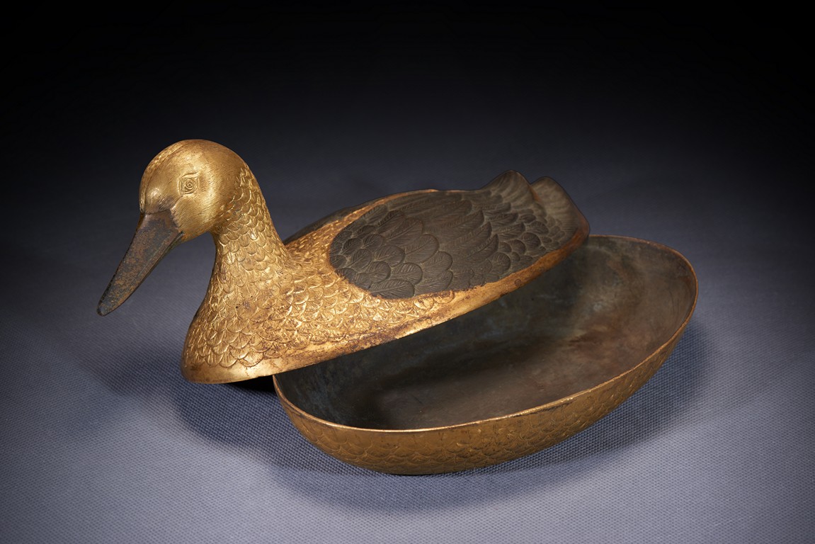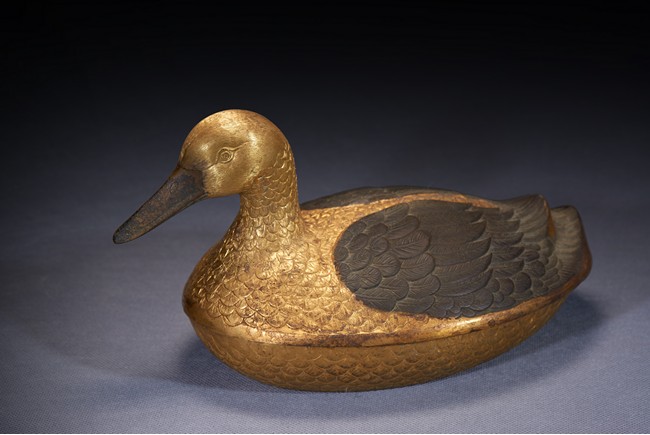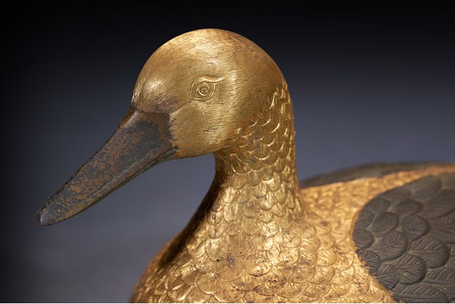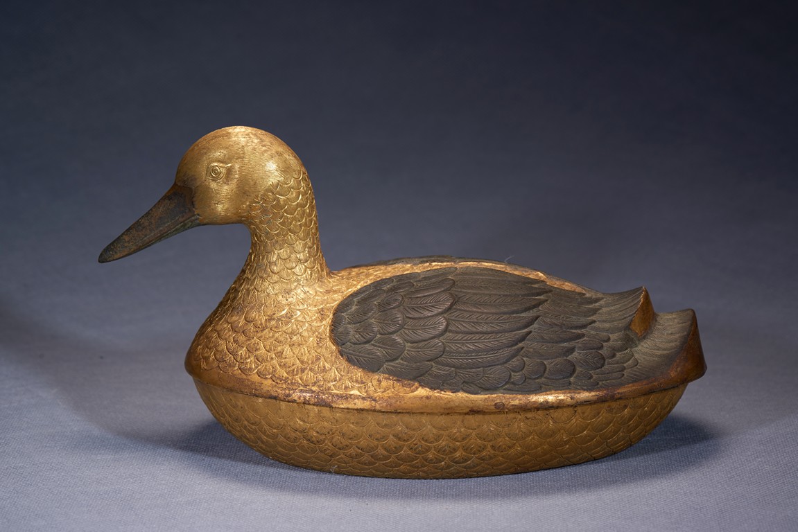 Realistically modelled, the recumbent duck is modelled with detailed overlapping plumes, the wings tightly tucked on either side, all richly gilt. Qing Dynasty period.