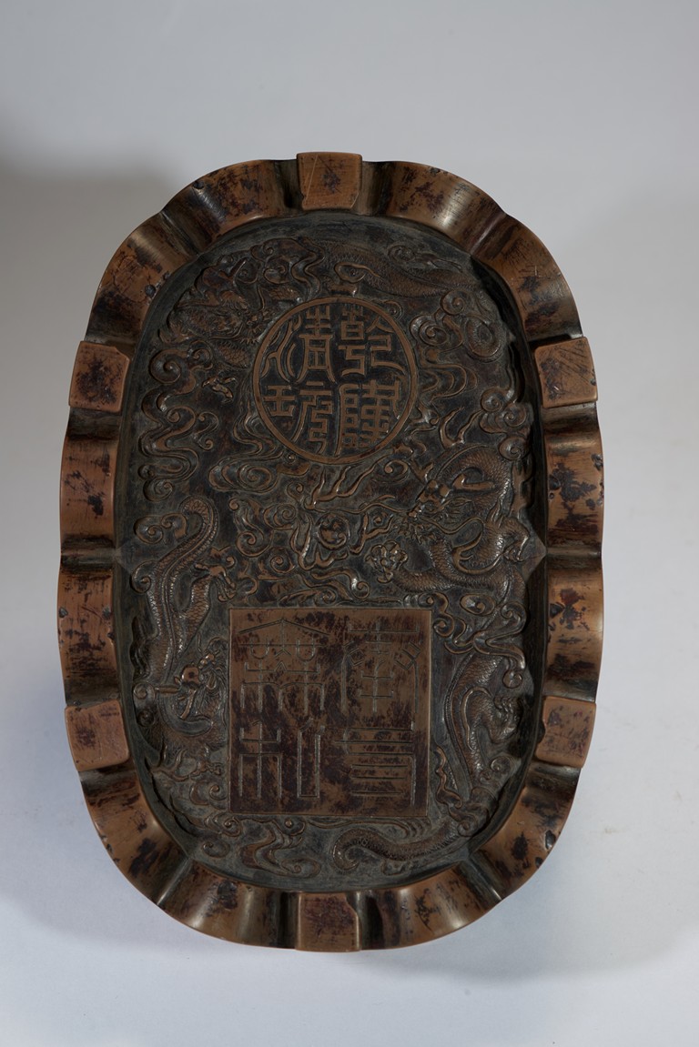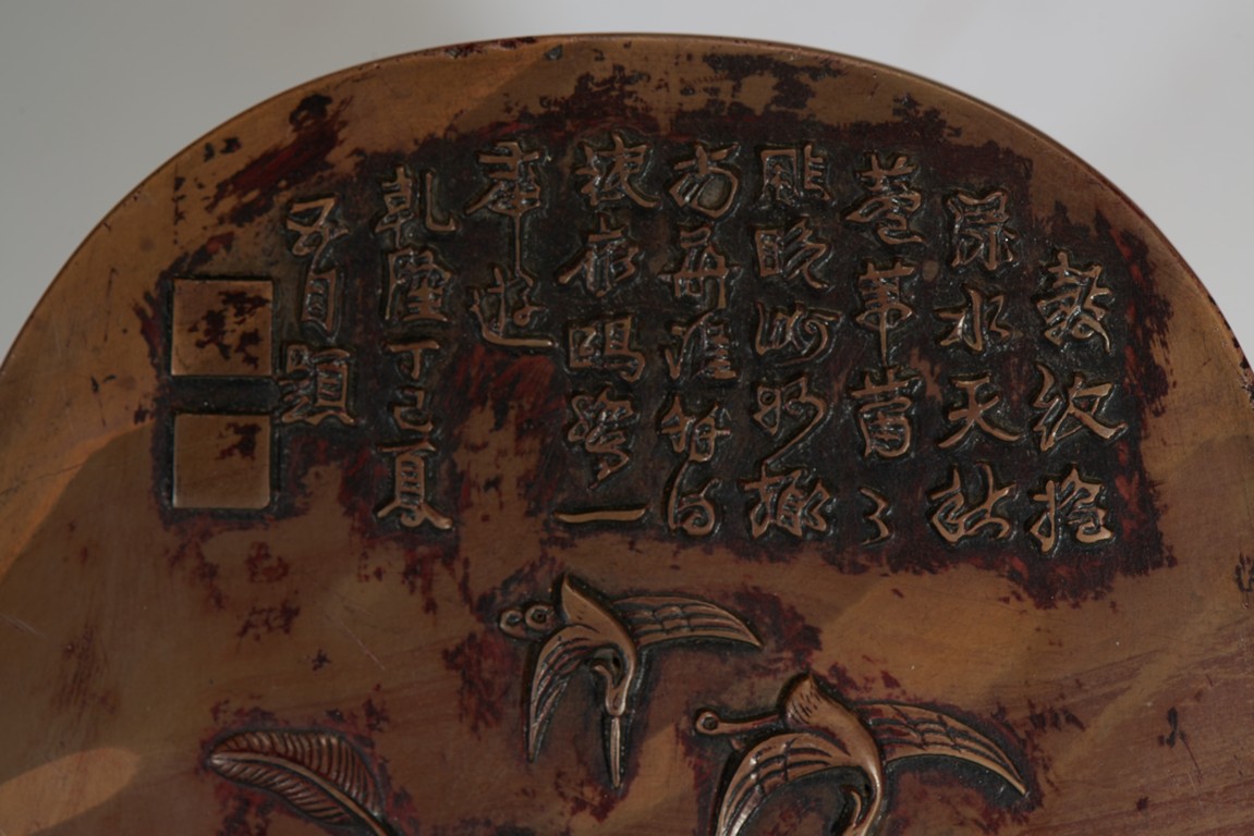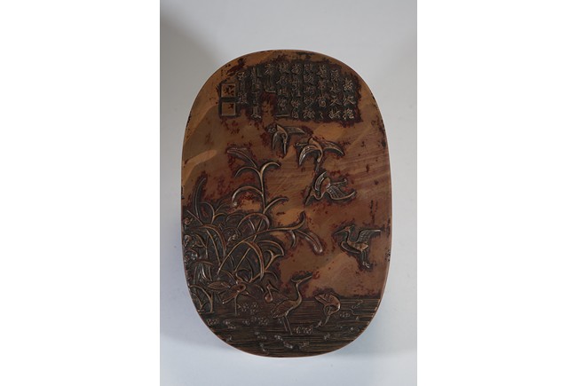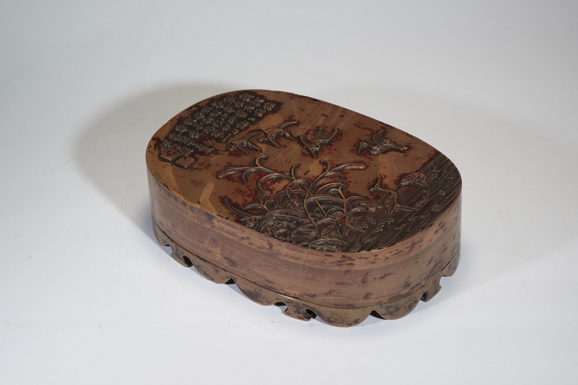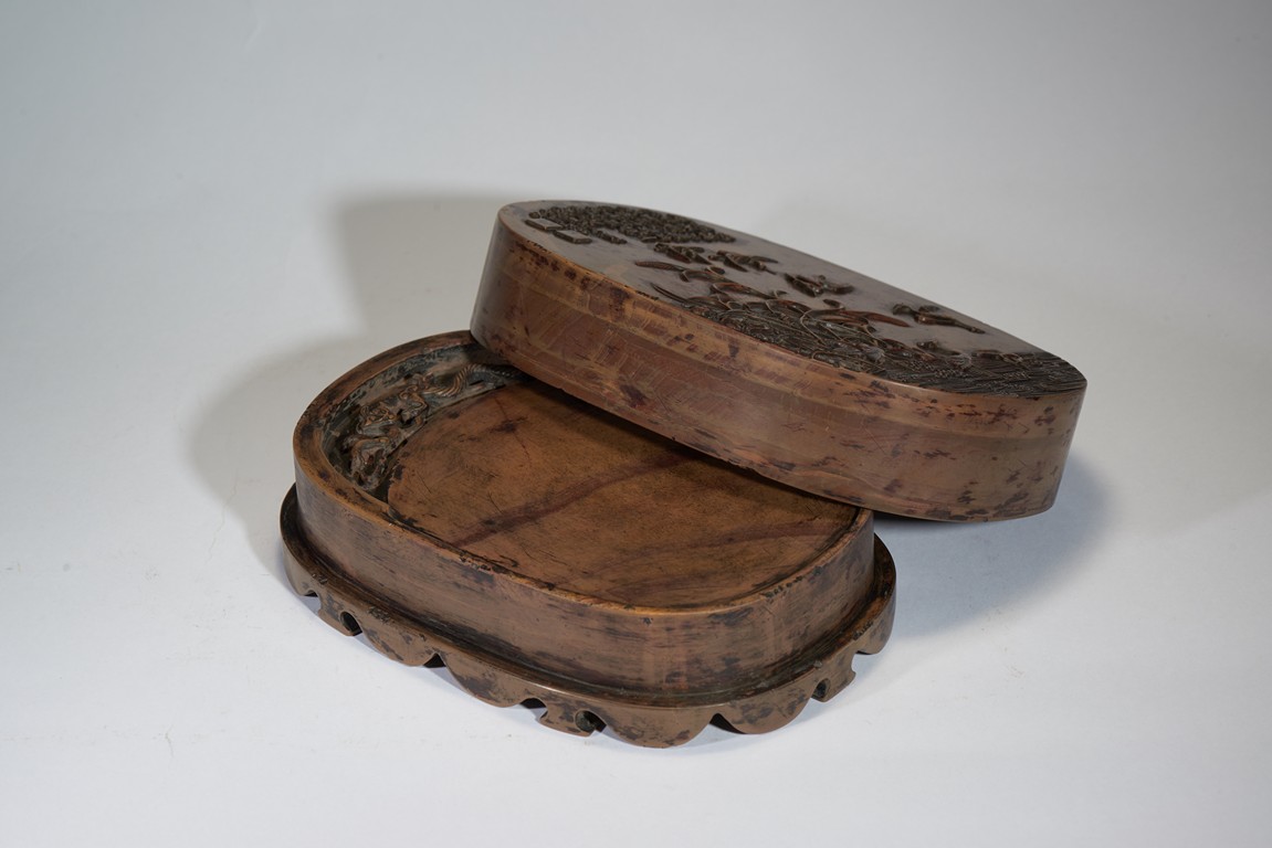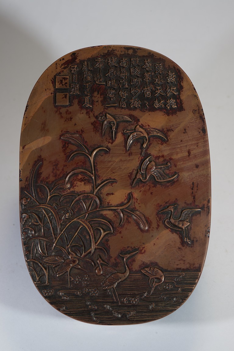 Of ovoid form, the cover carved with cranes in flight and poetic inscription, the base with mark. Qing Dynasty period.