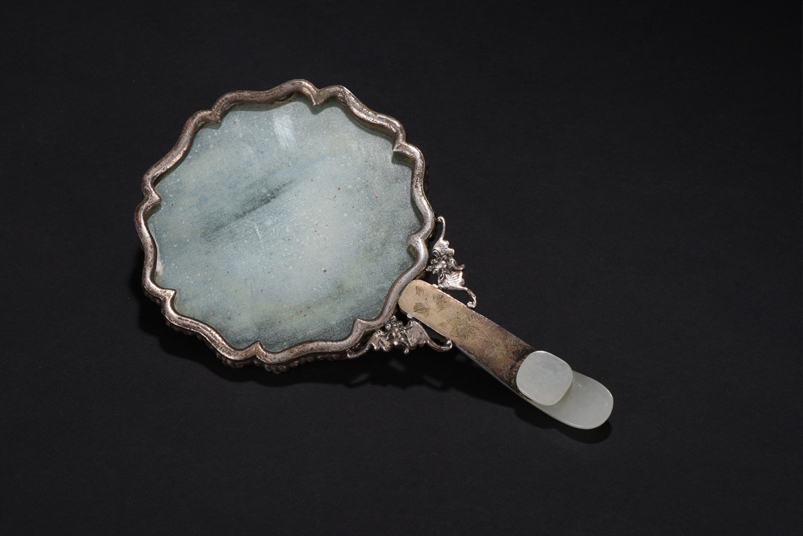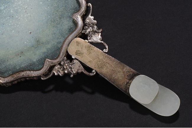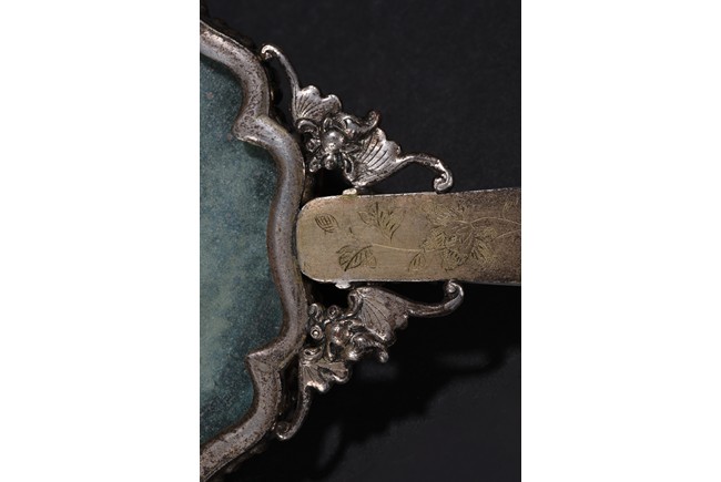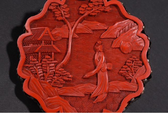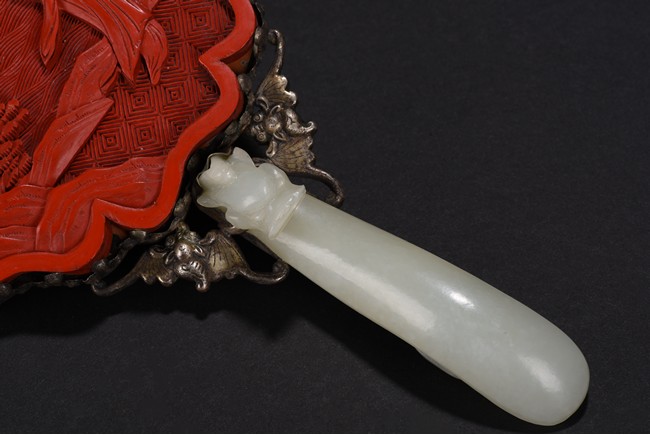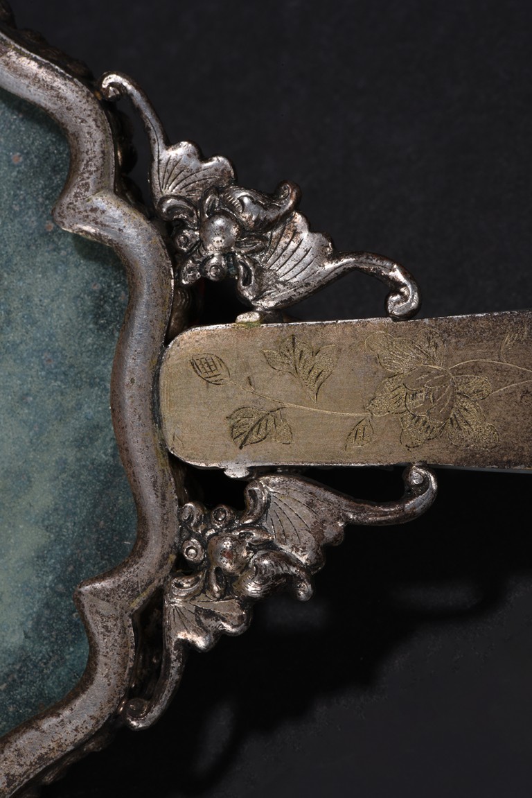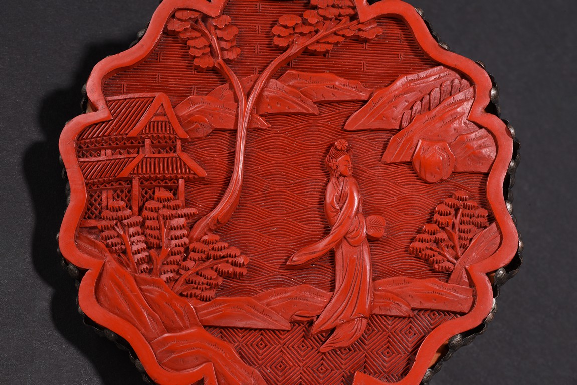 The shaped cinnabar lacquer mounted with silver frame is well carved to depict a beauty standing besides a lake underneath a tall wutong tree will hills in the far background, the handle is of white jade dragon head belt hook. 19th century.