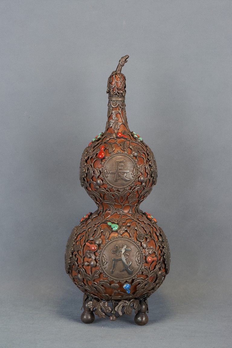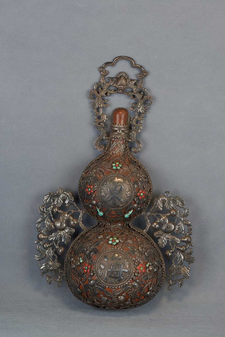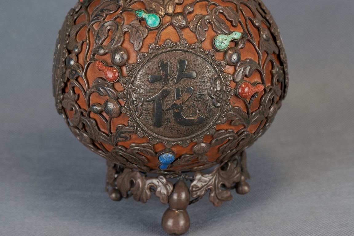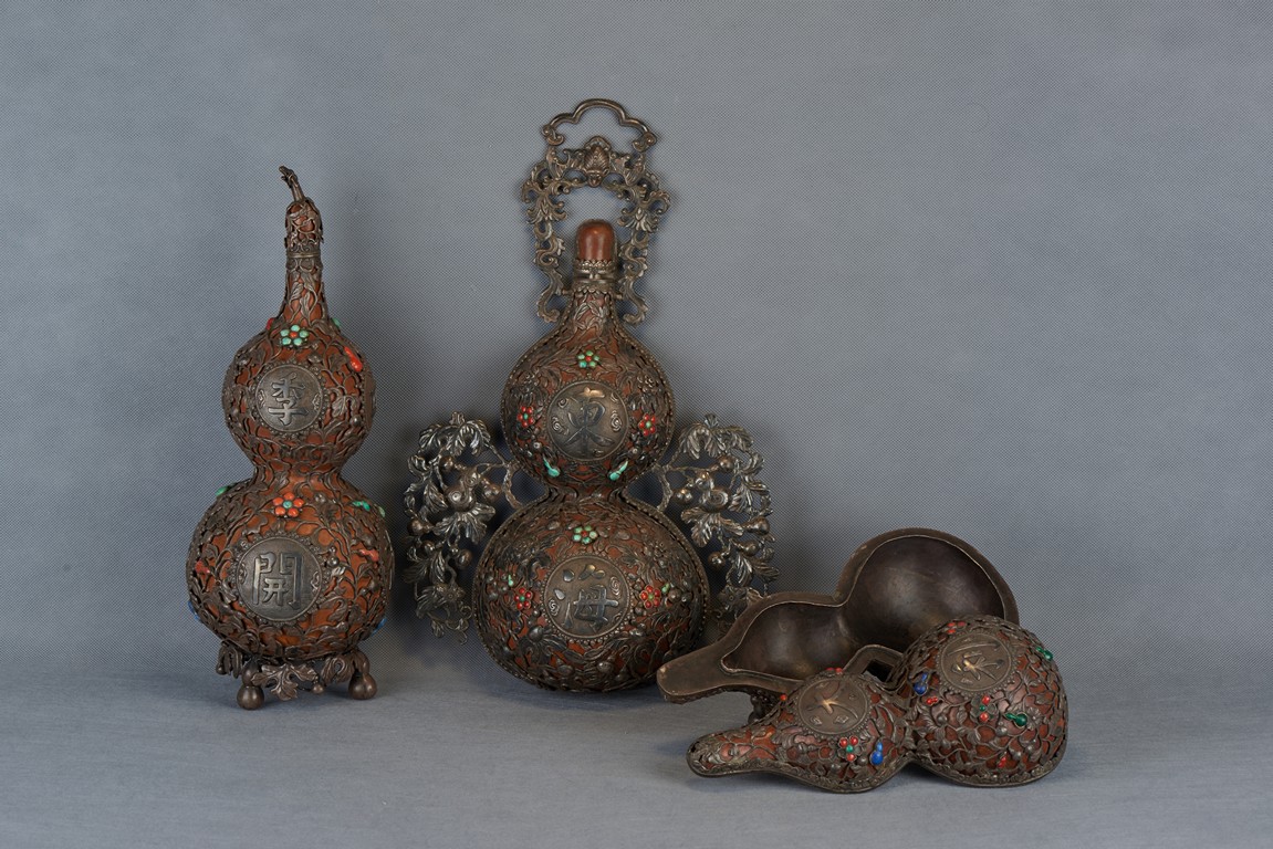 Each of double gourd form, finely inlaid with elaborate silver foliate decoration, with two circular emblems featuring a single character of auspicious meaning in relief, delicately embellished with semi-precious gems including coral, turquoise, and lapis lazuli forming small gourds and flower decoration. Qing Dynasty period.