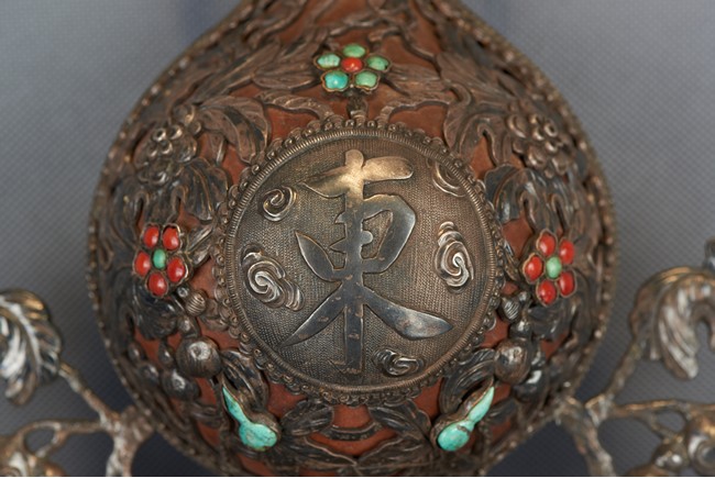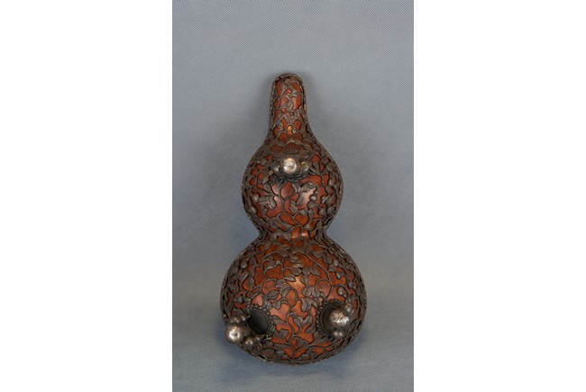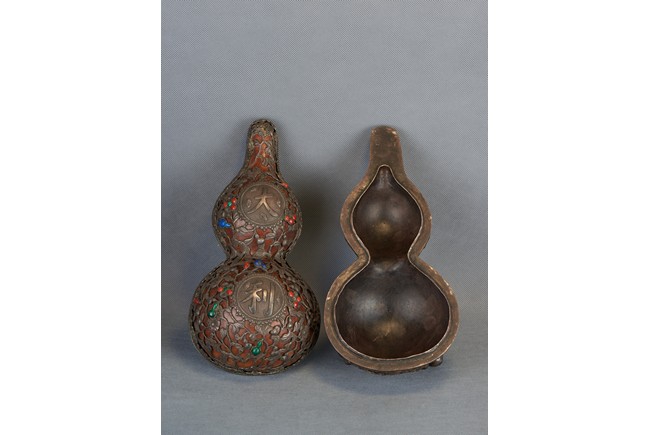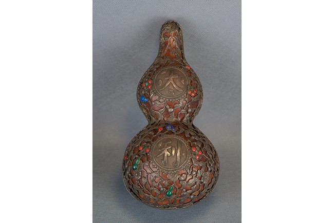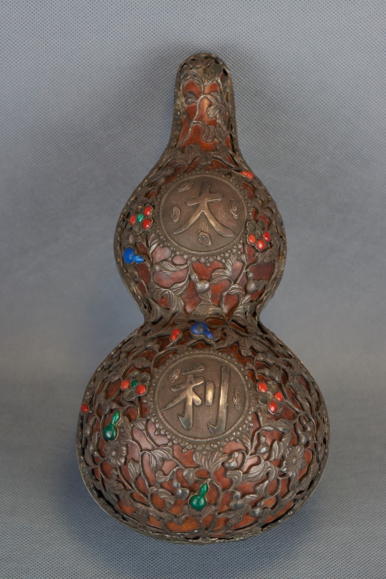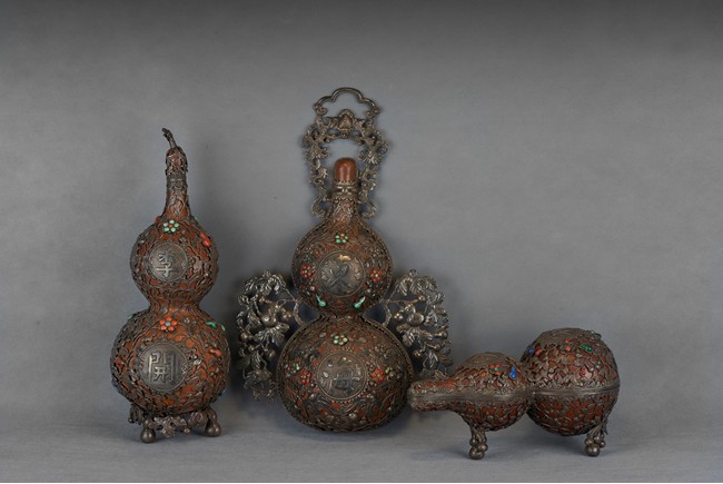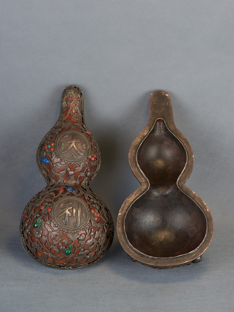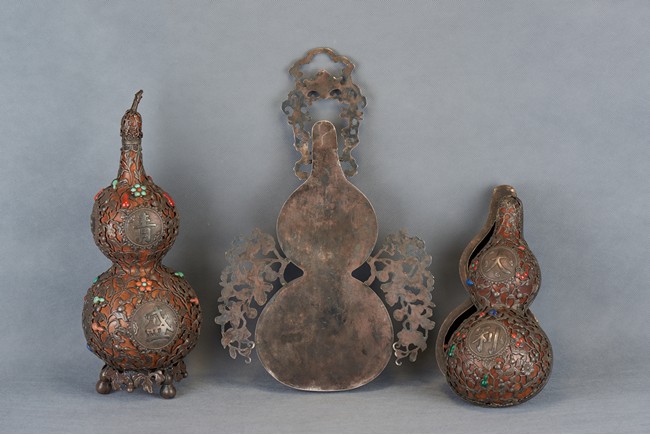 Each of double gourd form, finely inlaid with elaborate silver foliate decoration, with two circular emblems featuring a single character of auspicious meaning in relief, delicately embellished with semi-precious gems including coral, turquoise, and lapis lazuli forming small gourds and flower decoration. Qing Dynasty period.