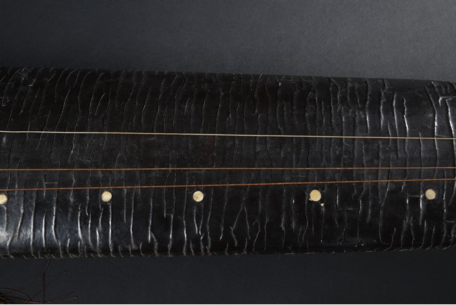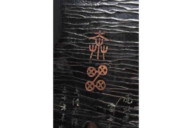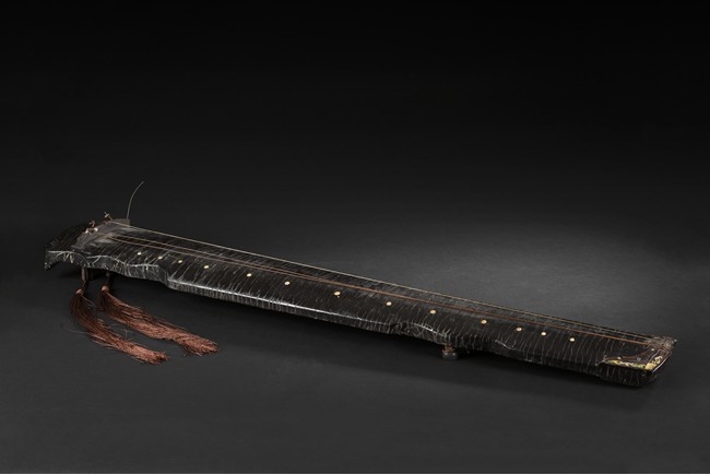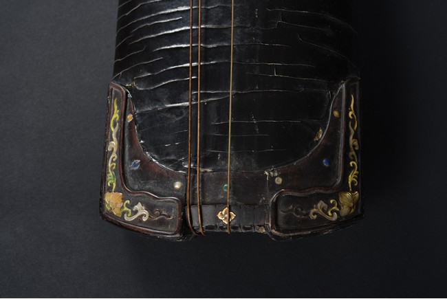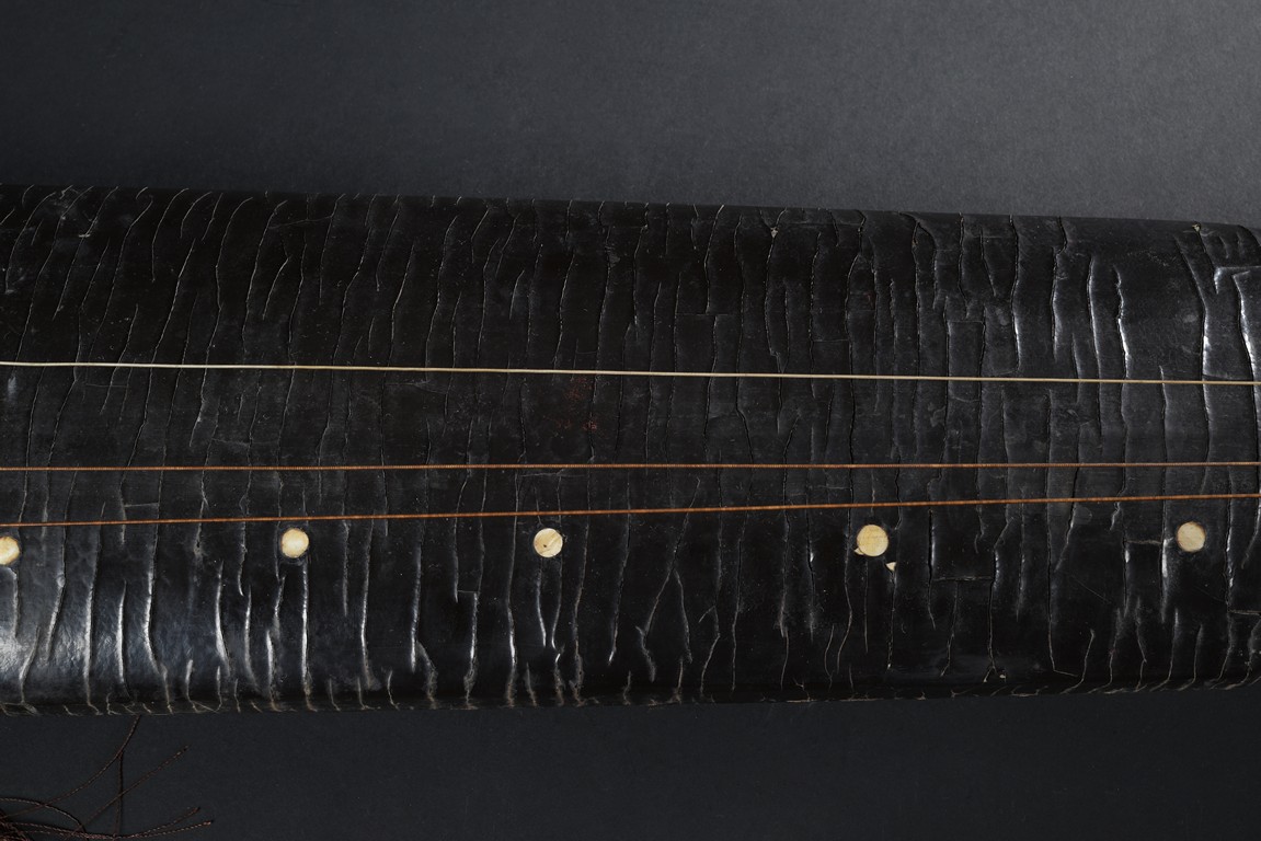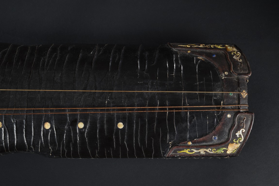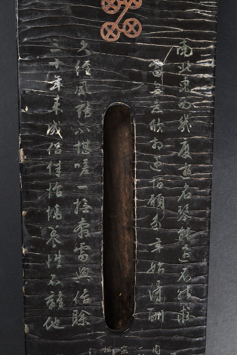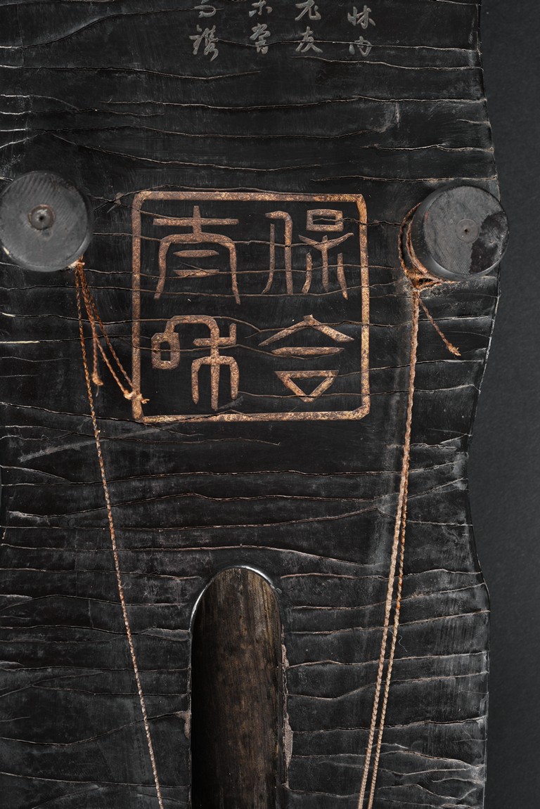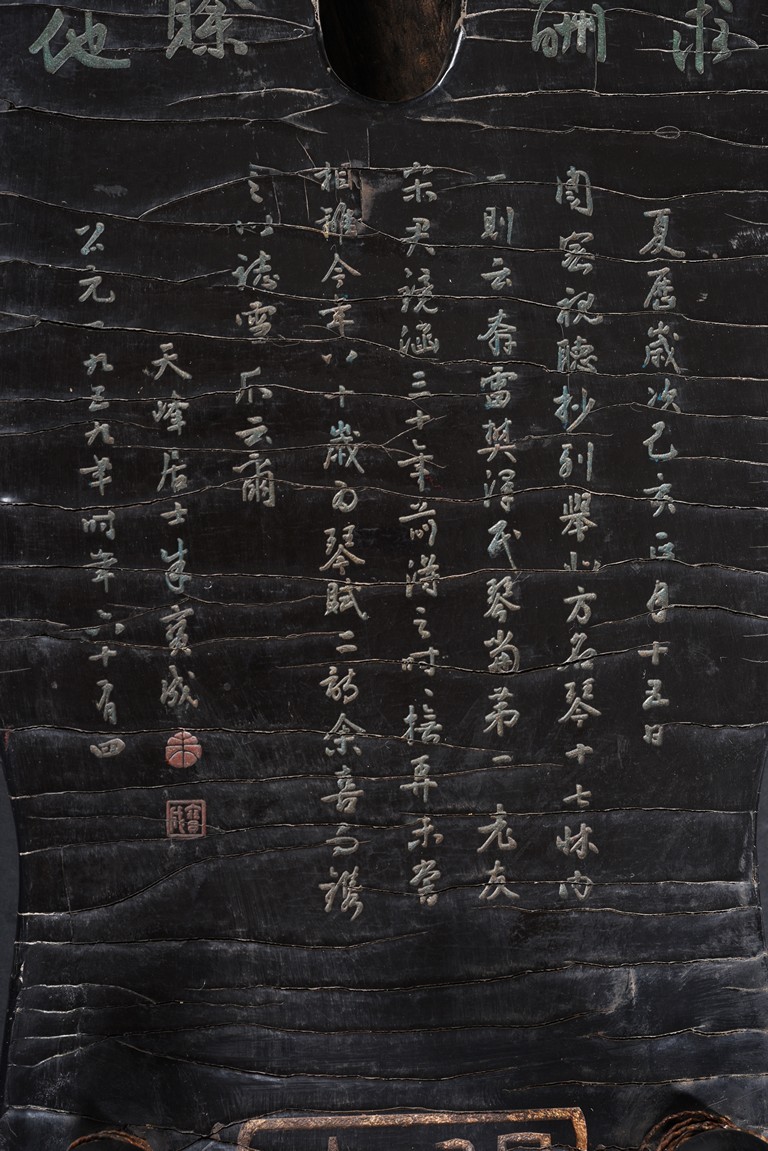 The surface of the long thin section of hollow lacquered wood mounted with three strings, the base incised with a two character inscription in seal script and two long colophons in running script with seal marks, all surfaces exhibiting an even vertical craquelure. Qing Dynasty period.