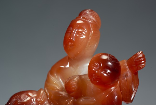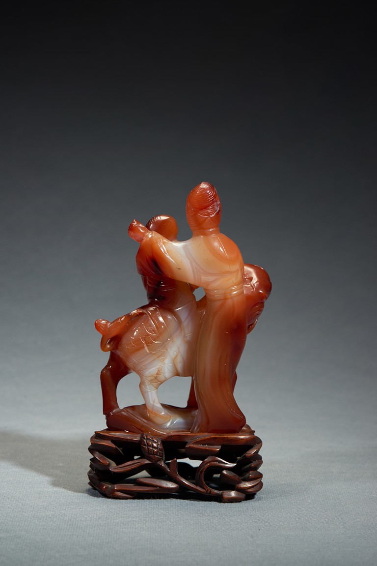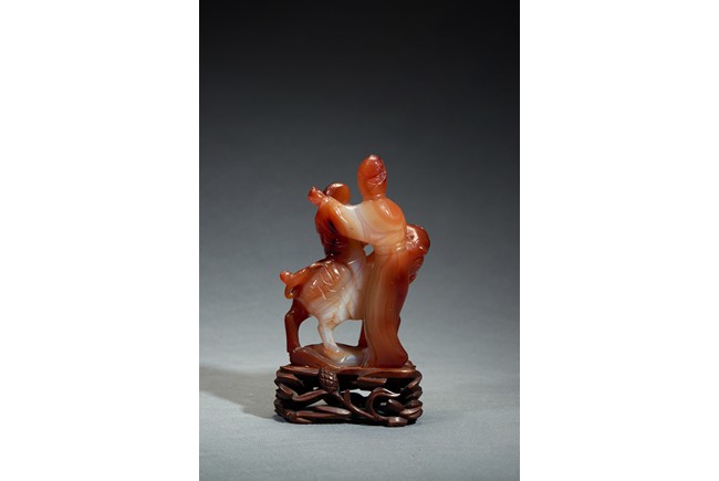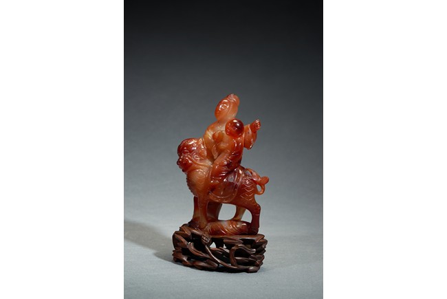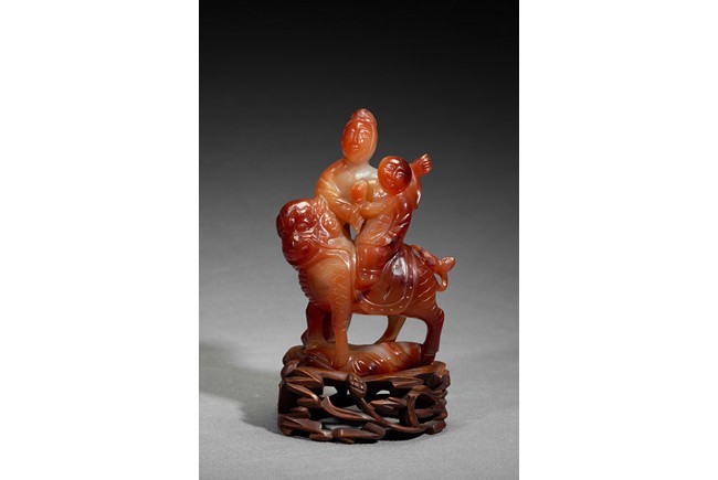 Finely carved depicting a Guanyin standing besides a mythical beast, her hands holding a boy sitting upon the mythical beast, all supported on a pierced wooden stand. Qing Dynasty period.