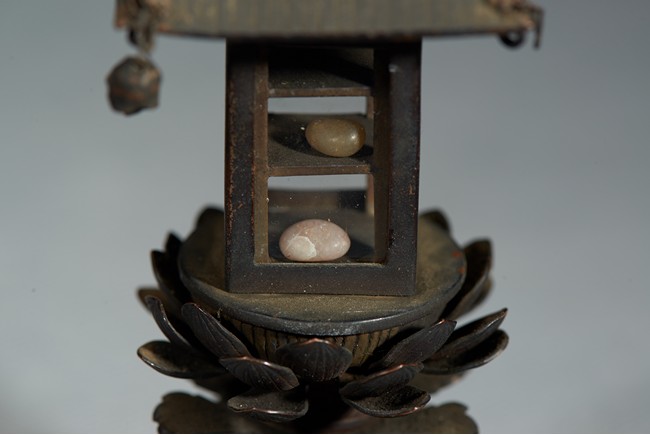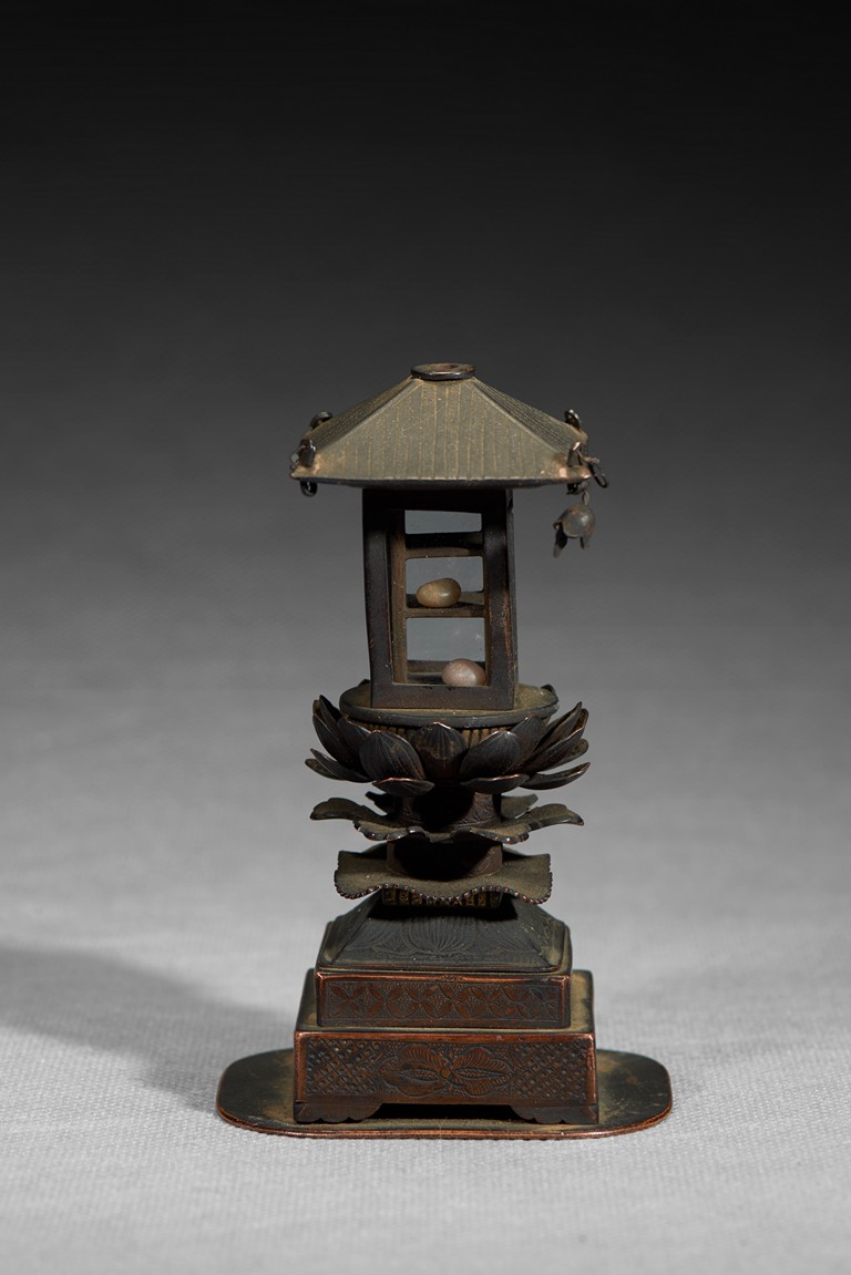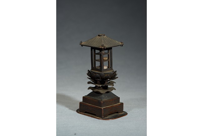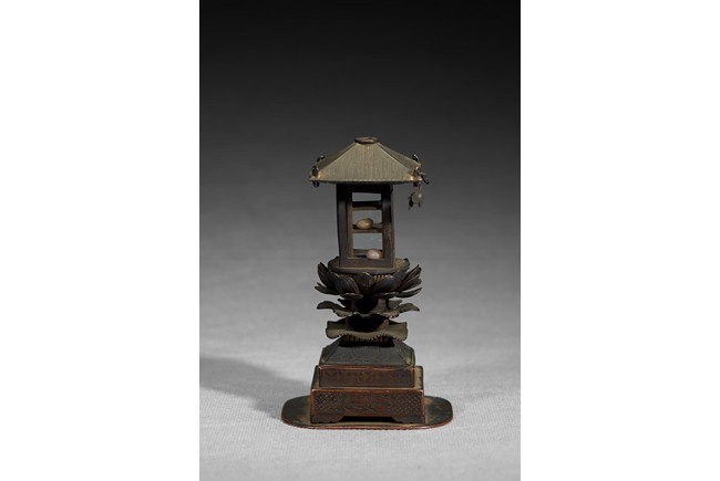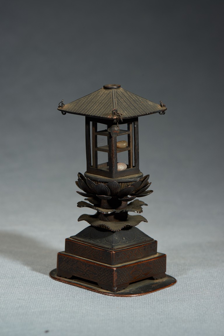Modelled in the form of pagoda, raised on layered lotus base above, containing two irregular ovoid shaped sarira beads below the pagoda roof. Qing Dynasty period.