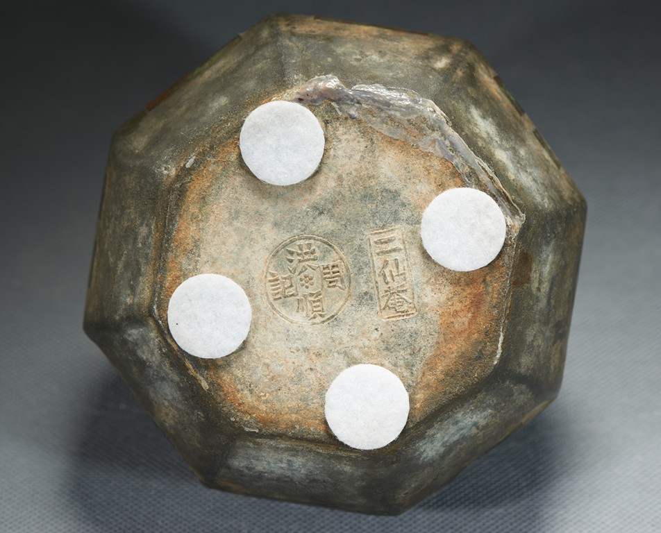 Of octagonal form, each side decorated with a bagua motif, the base incised with two marks 'Er Xian An' and 'Hong Shun Zhou Ji'. Qing Dynasty period.
