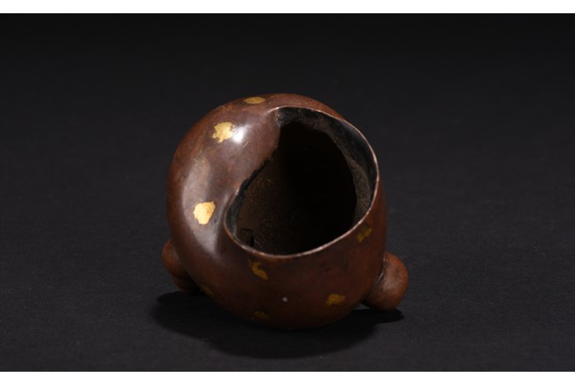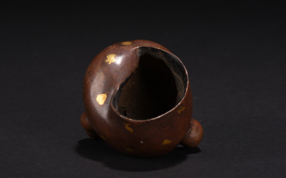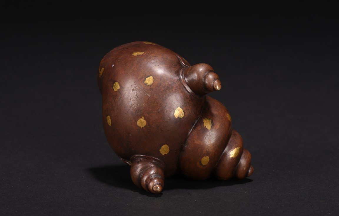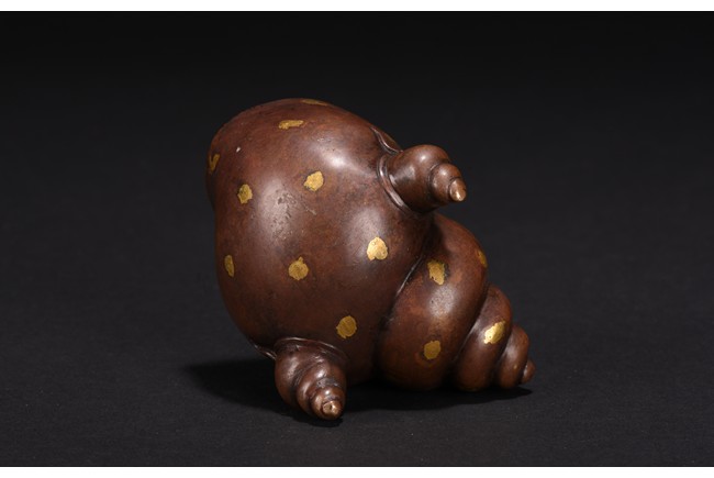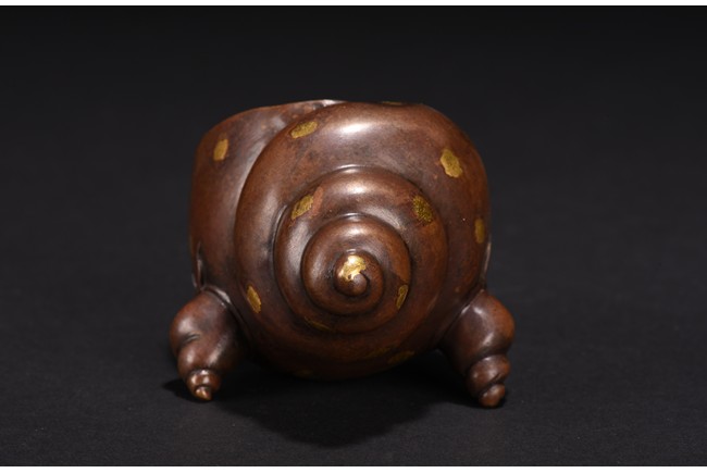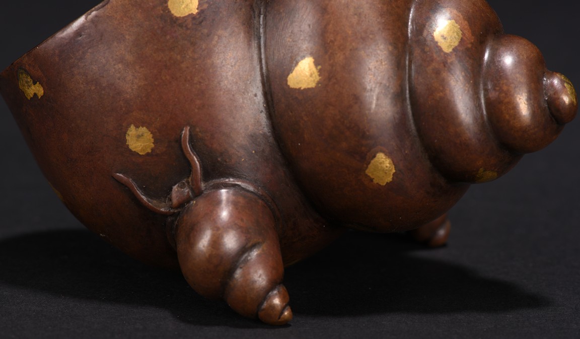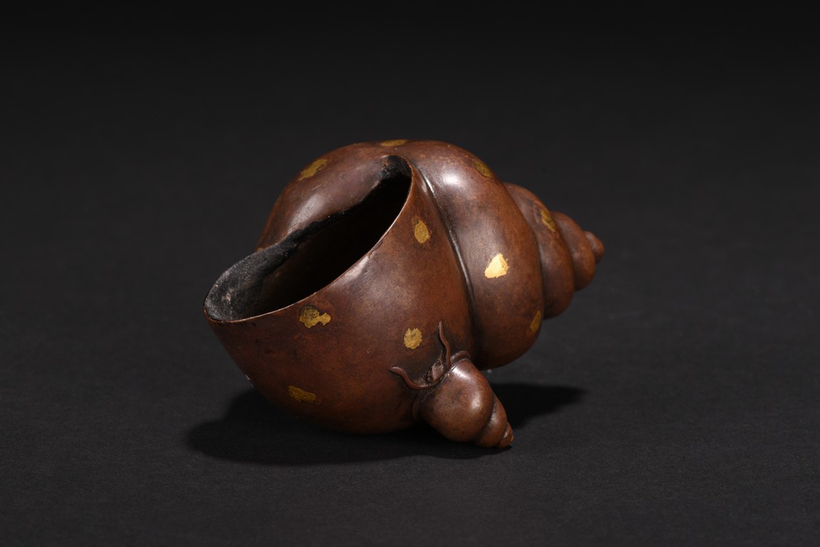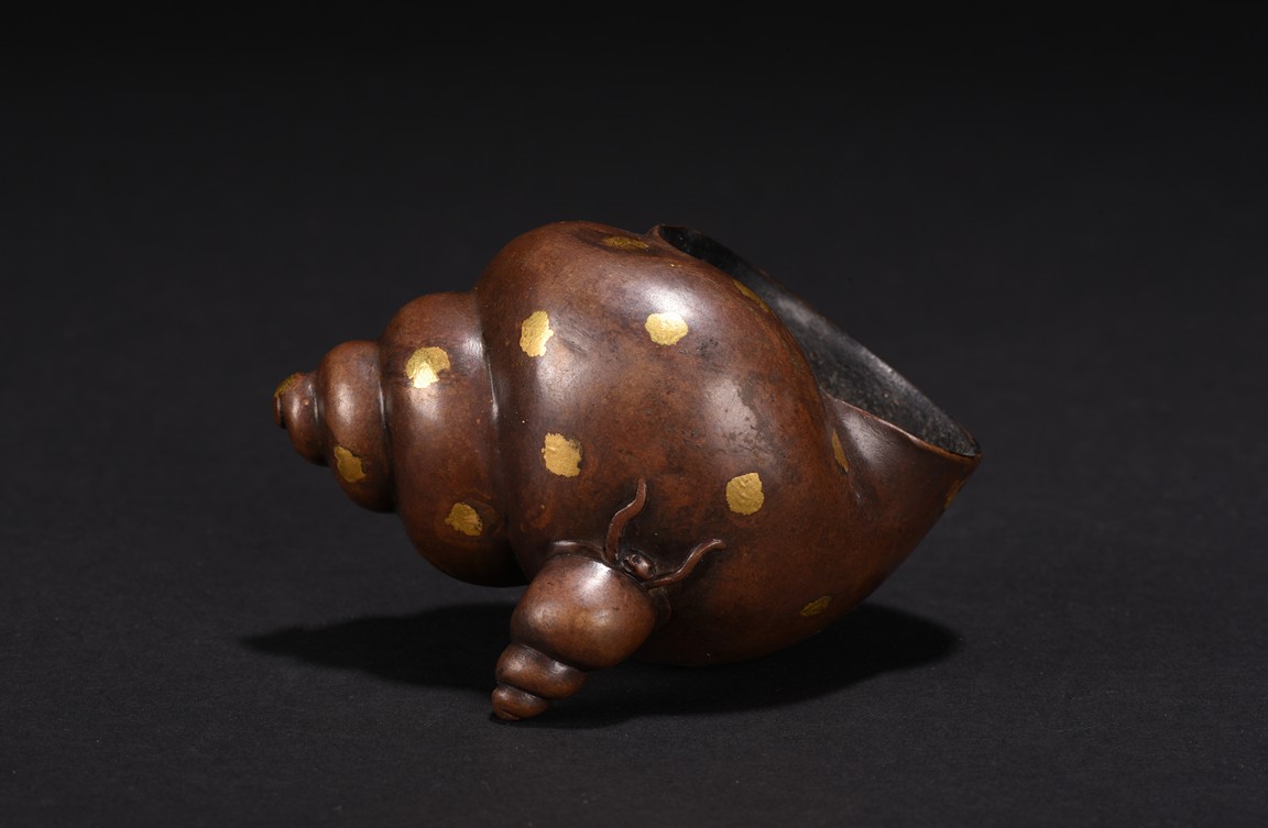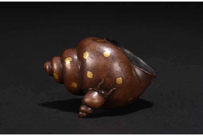 Modelled in the form of a conch shell in the round, the spiral exterior cast with a smaller conch shell, exterior with splashed with gilt-spots. Qing Dynasty period.