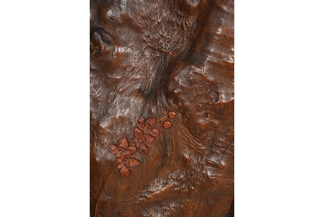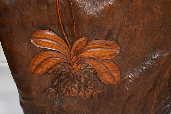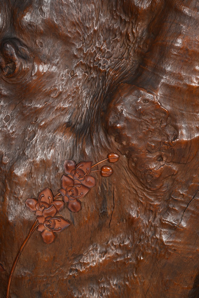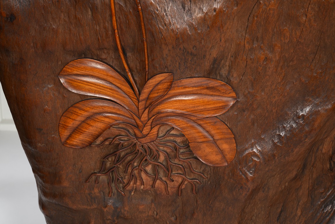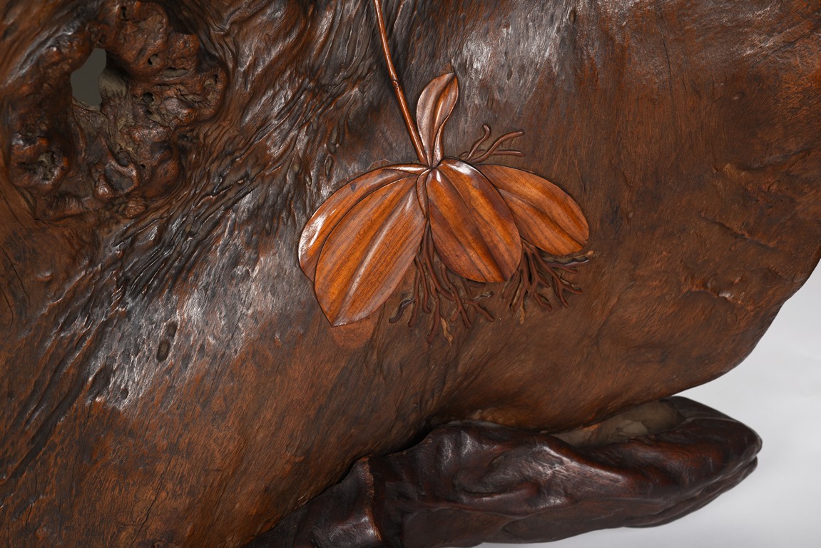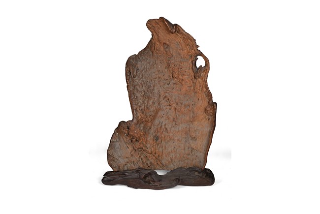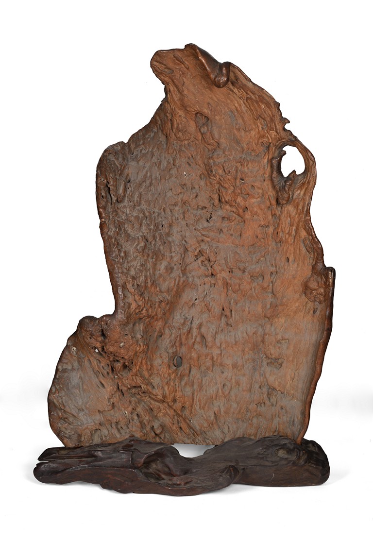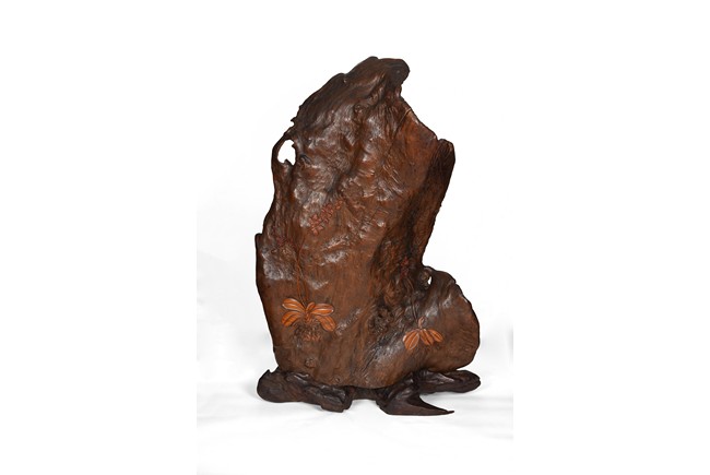 Naturalistically carved, the burlwood is inlaid with huangyangmu carved decorations, all fitted on a stand.