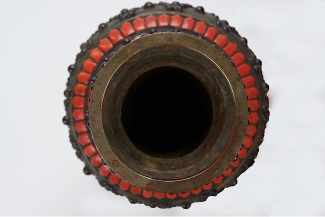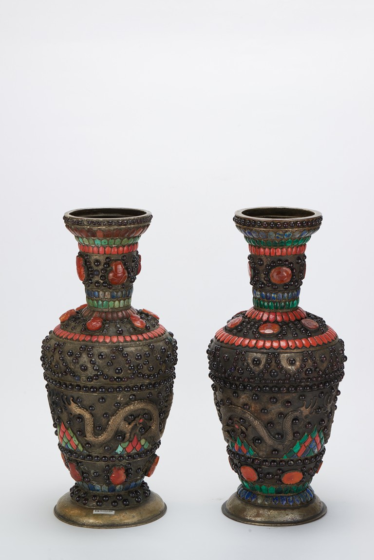 Each supported on spreading feet, the body with two raised dragon chasing a flaming pearl in repousse relief, overall embellished with coral, amber, turquoise, lapis lazuli in the form of beads, lappet, and figural carving. Qing Dynasty period.
