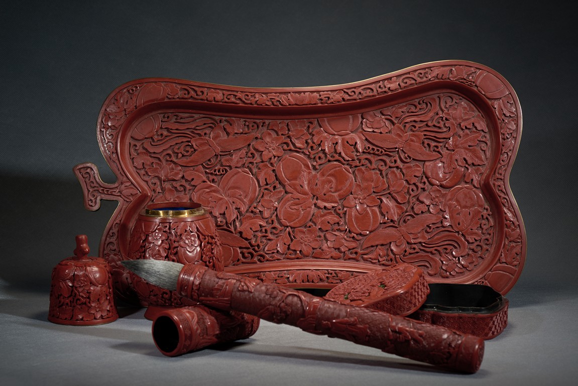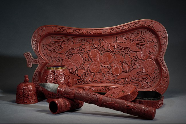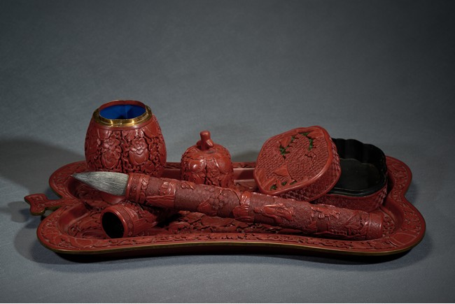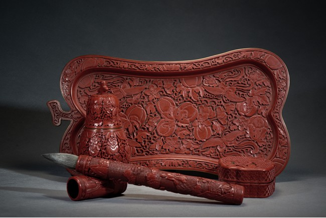 The set includes a cinnabar brush and cover, the exterior carved in relief with landscape of scholars and attendant in riverside garden setting; a shaped cover box carved to exterior with leafy branches reserved on diaper ground; a double gourd box carved to exterior with flower blossoms and scrolled branches; and a large shaped tray with floral scrolls and fruits carved in relief.