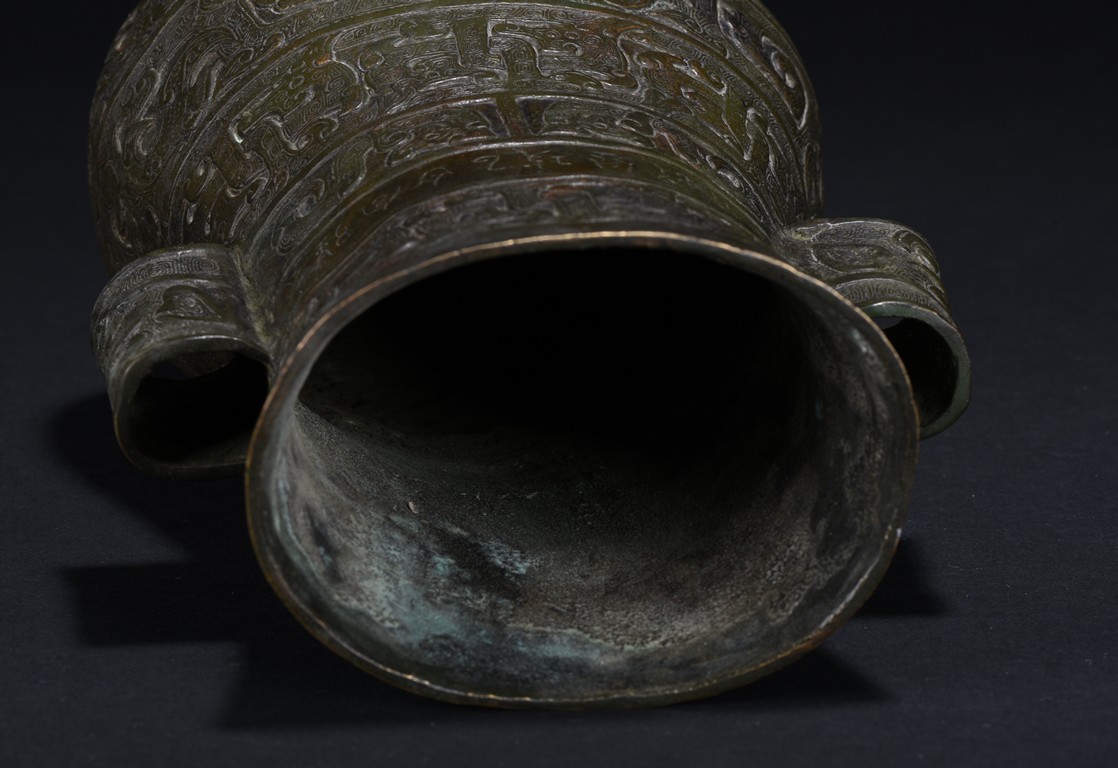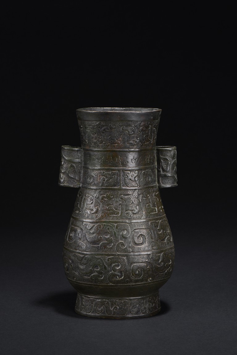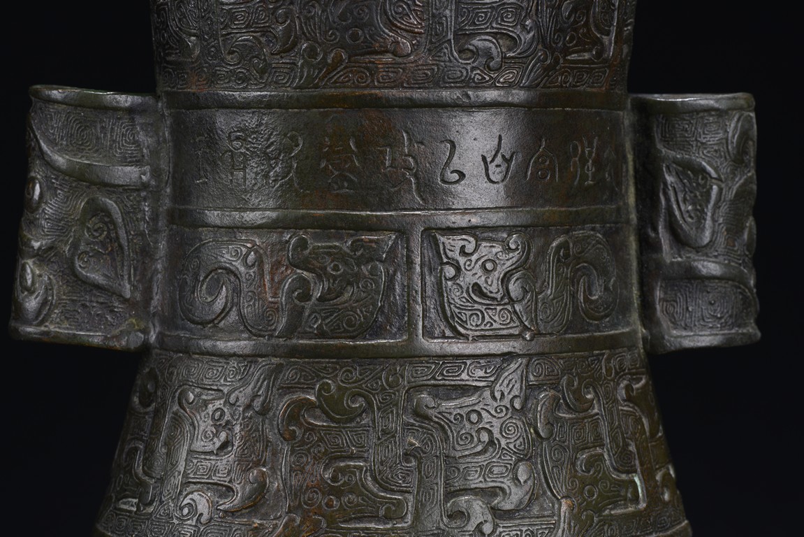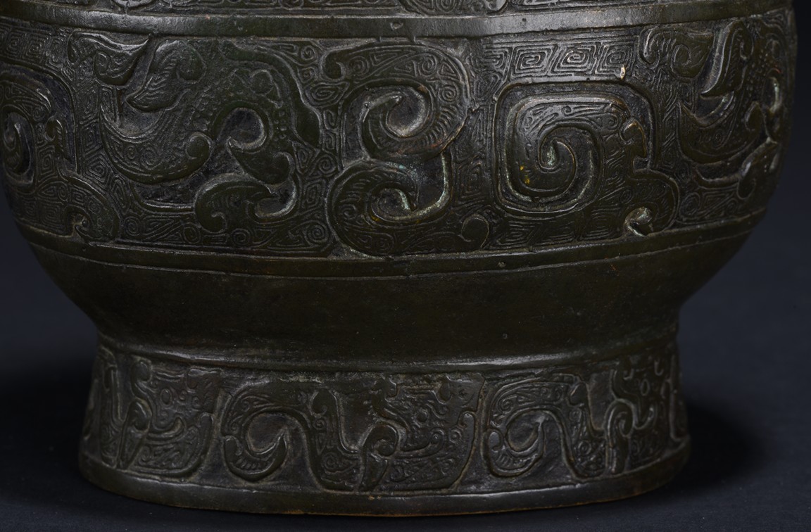 Of pear-shaped in imitation of archaic hu vessel, each side is cast in relief with archaistic mythical beast scroll pattern, the neck with a band of seal script inscription flanked by lug handles. Ming Dynasty period.