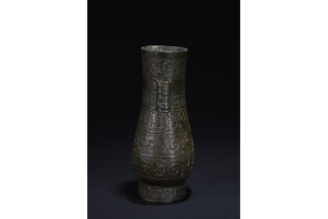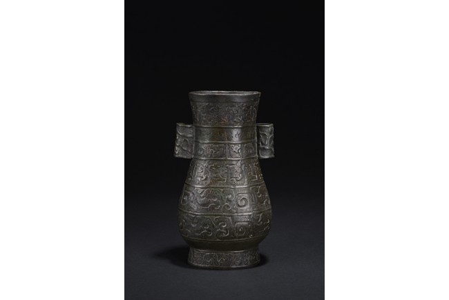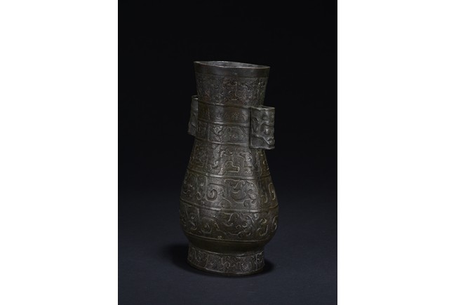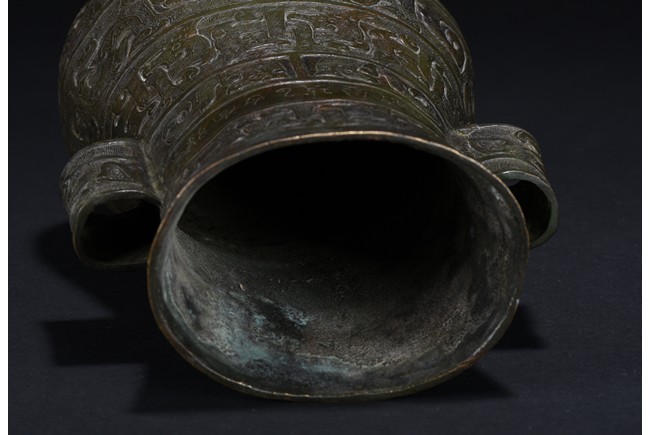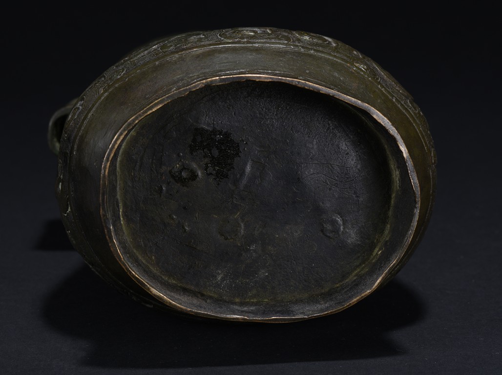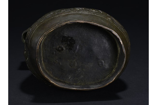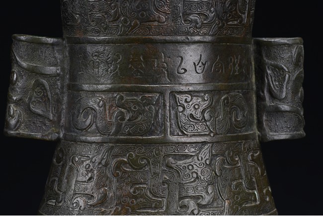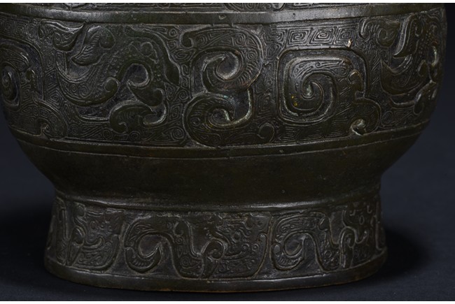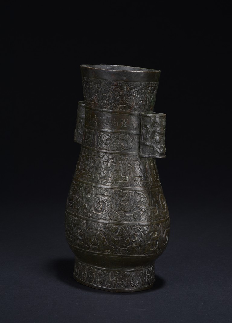 Of pear-shaped in imitation of archaic hu vessel, each side is cast in relief with archaistic mythical beast scroll pattern, the neck with a band of seal script inscription flanked by lug handles. Ming Dynasty period.