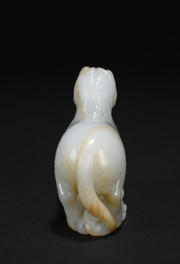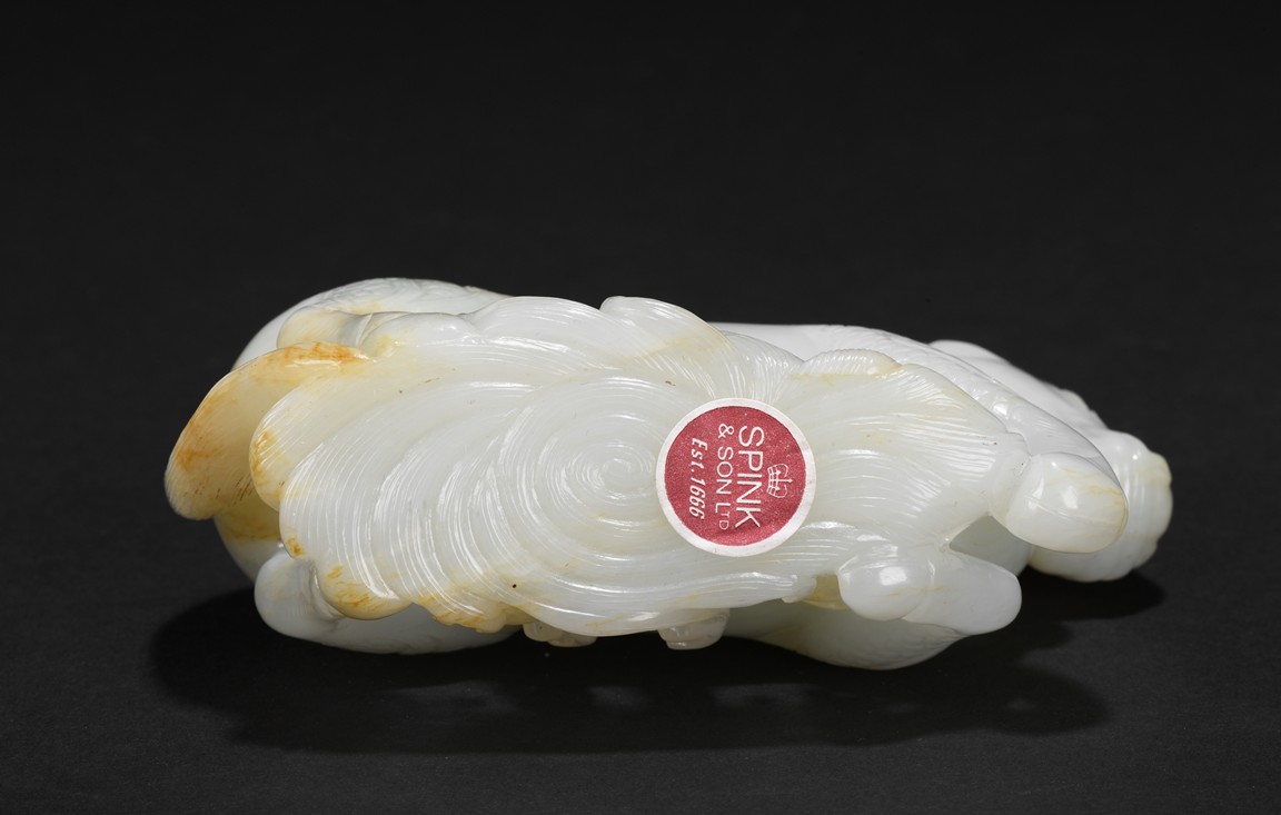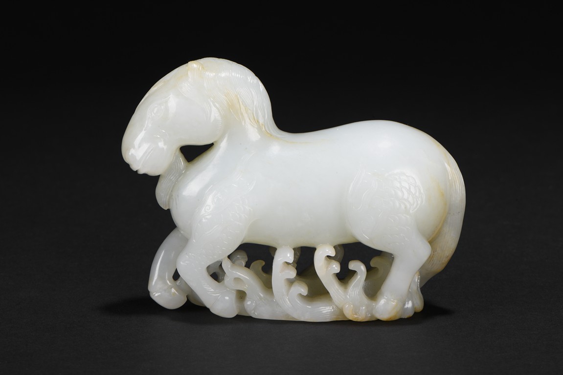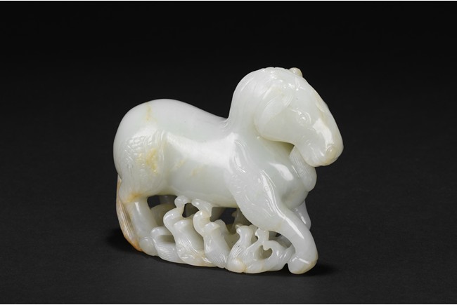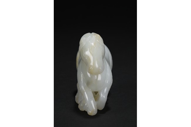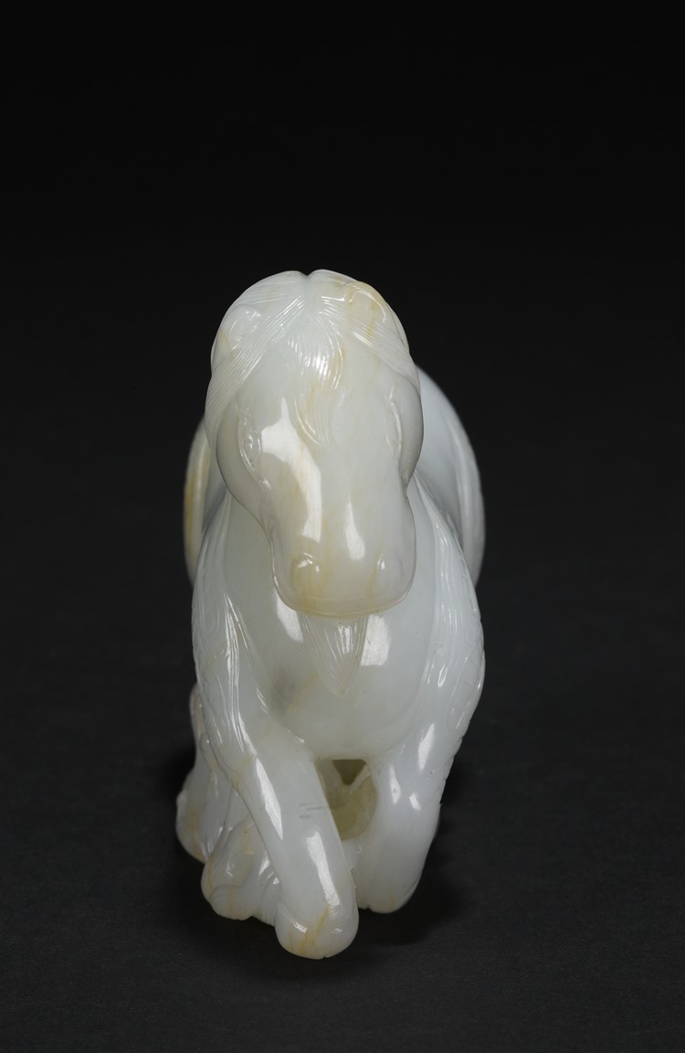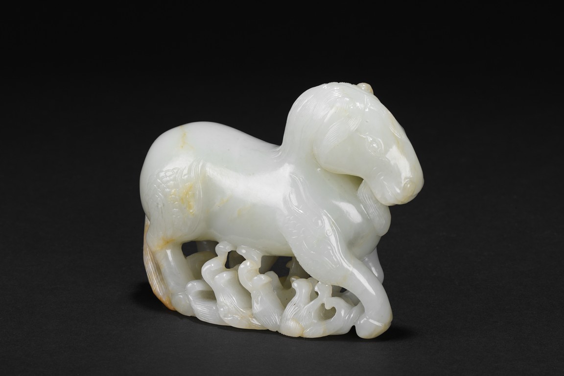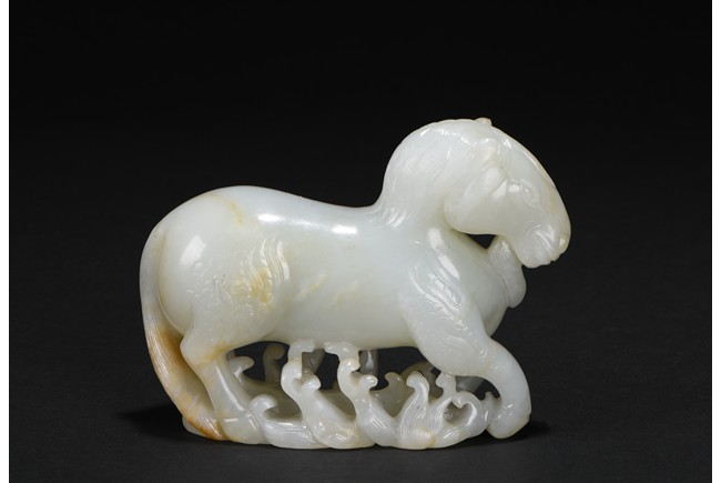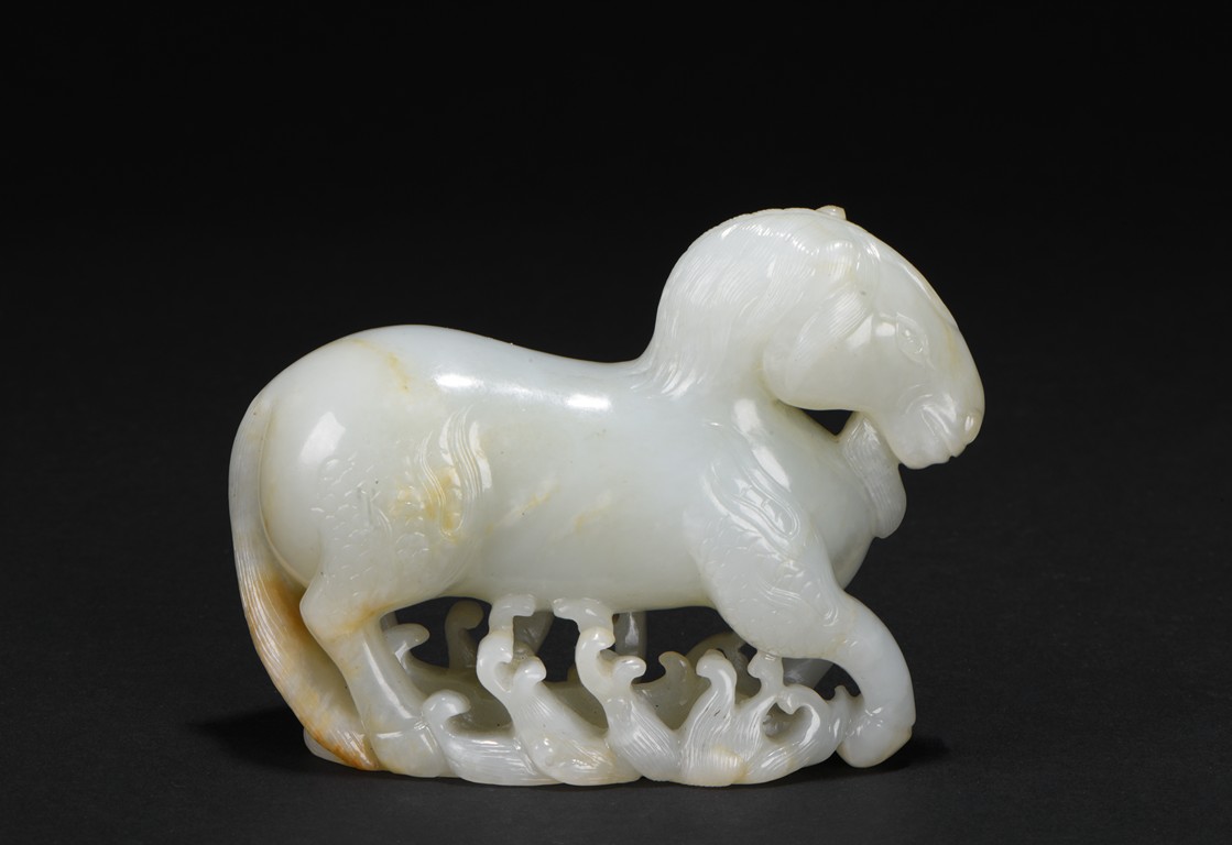 The jade is finely carved with a horse as walking upon turbulent wave foams, its mane and tail finely incised, the belly smoothly rounded and the hooves carefully carved, the stone is of even smooth white tone with some russet streaks. Qing Dynasty period.