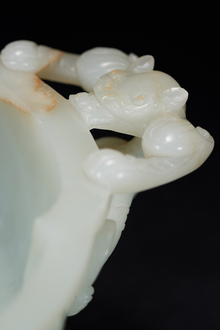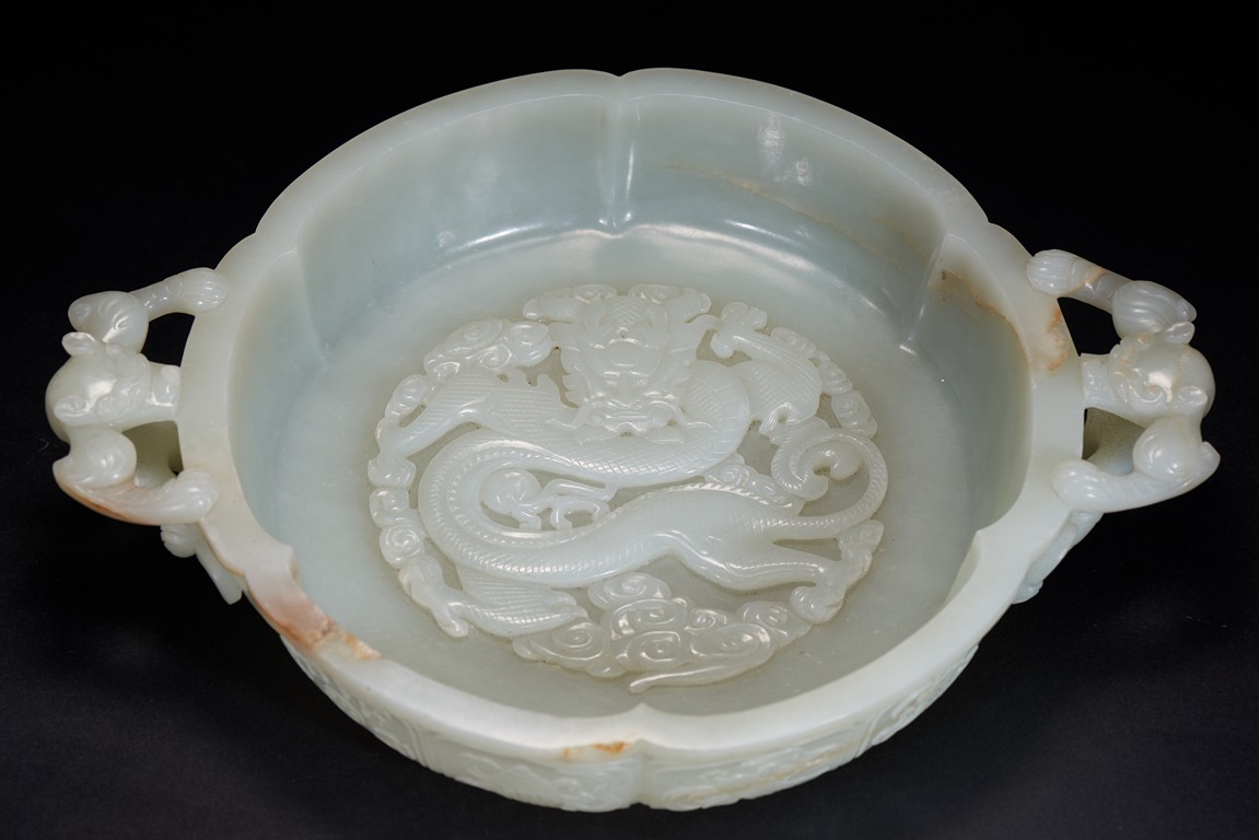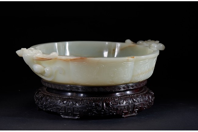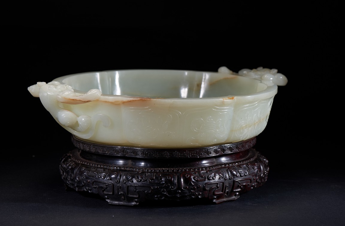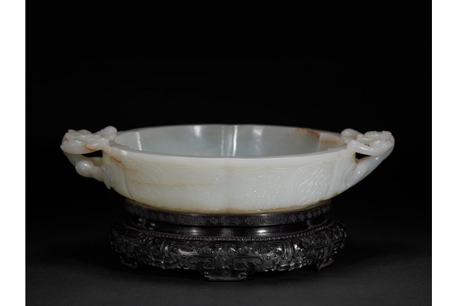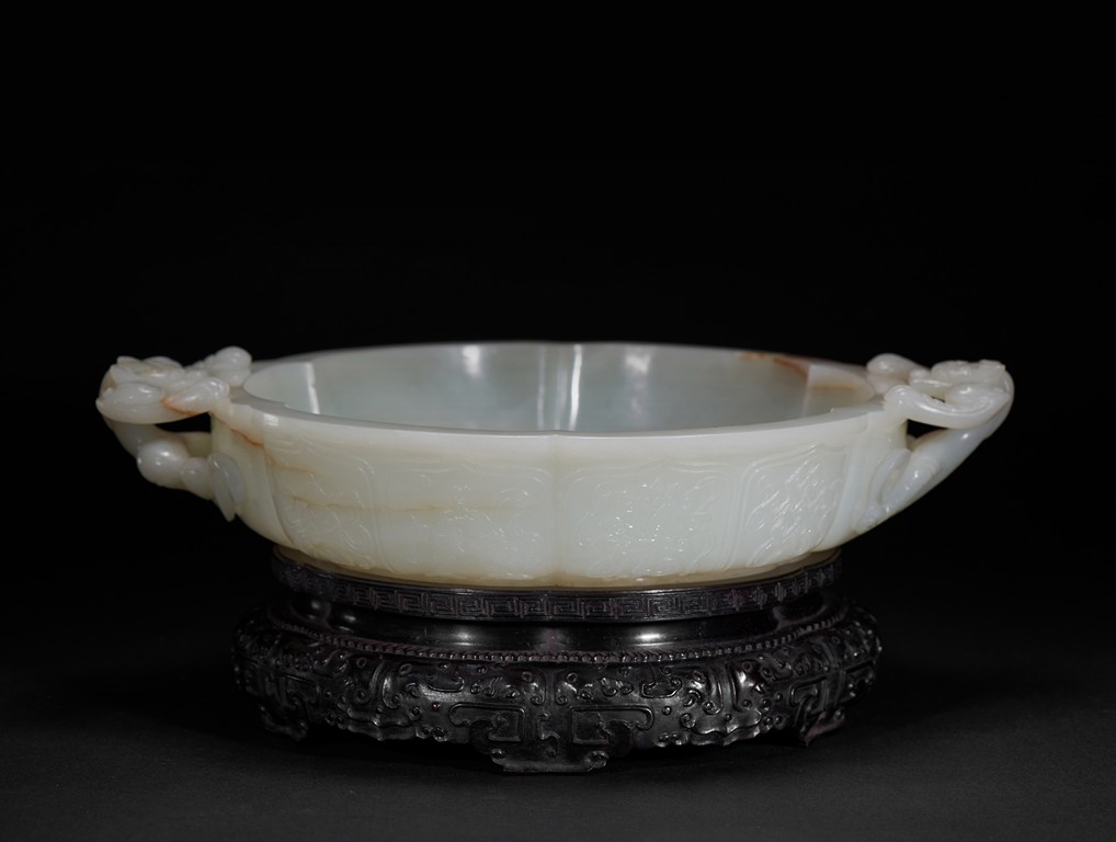 Of six-lobed form, the interior is well carved in relief with a powerful dragon amid auspicious clouds, the exterior finely carved with eight buddhist emblems within ruyi-shaped border and sinuous chilong in high relief clambering on both sides, the base with four character 'QIANLONG' mark, all fitted on zitan stand with band of archaistic and key-fret design. The stone is of even white tone with russet veins. Qing Dynasty period.