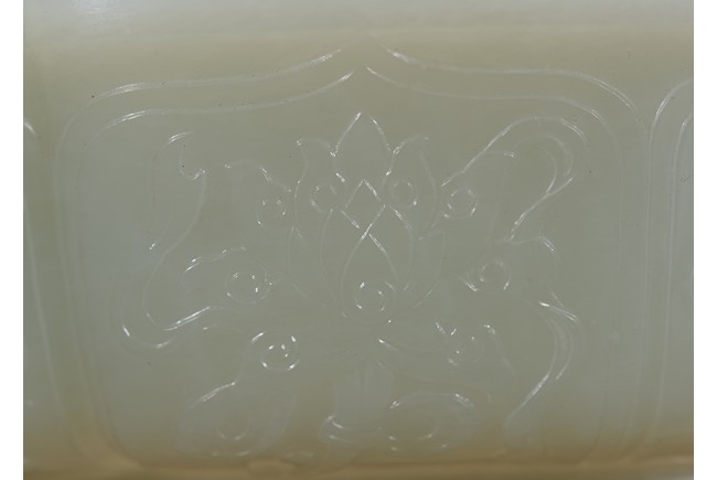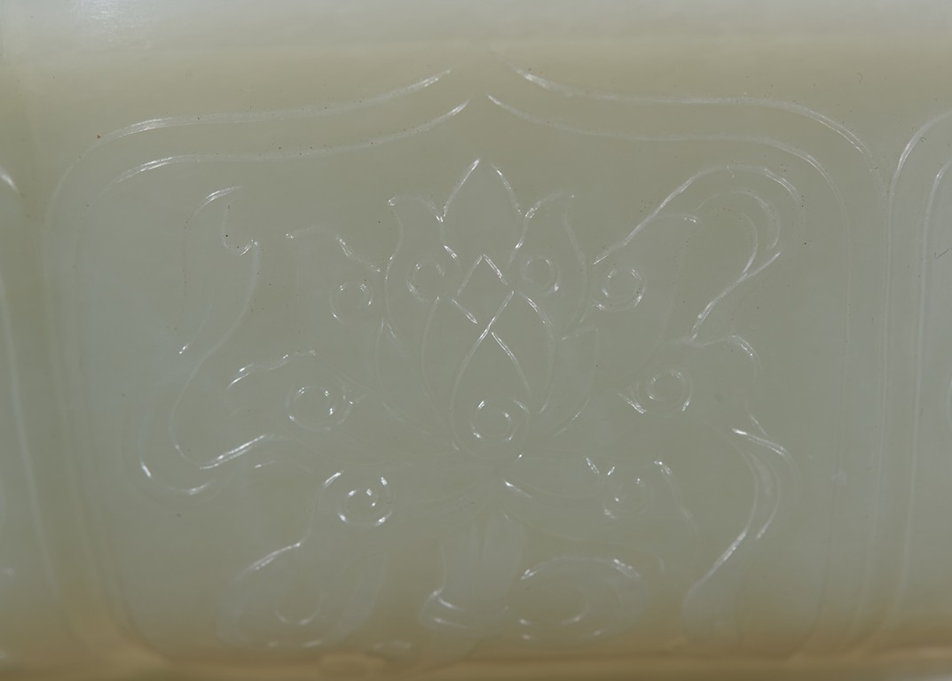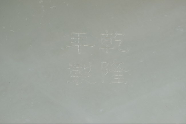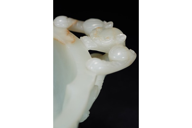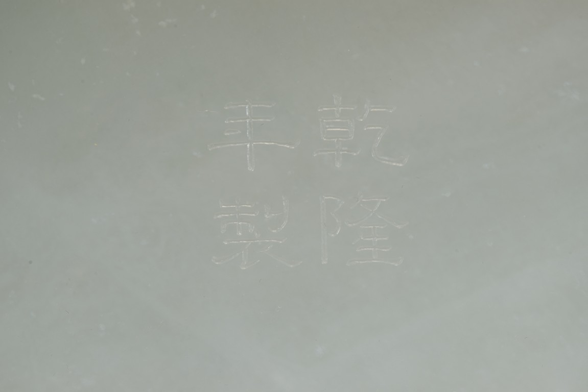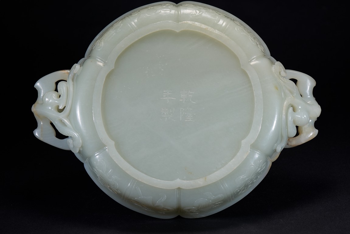 Of six-lobed form, the interior is well carved in relief with a powerful dragon amid auspicious clouds, the exterior finely carved with eight buddhist emblems within ruyi-shaped border and sinuous chilong in high relief clambering on both sides, the base with four character 'QIANLONG' mark, all fitted on zitan stand with band of archaistic and key-fret design. The stone is of even white tone with russet veins. Qing Dynasty period.