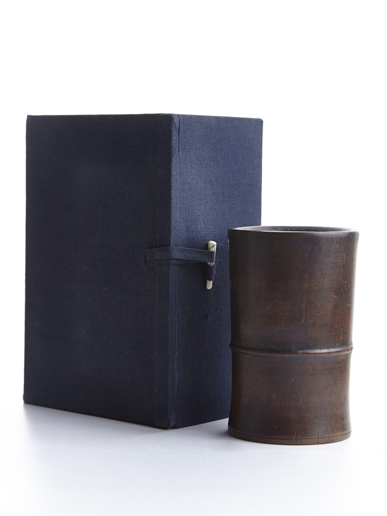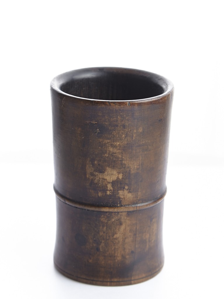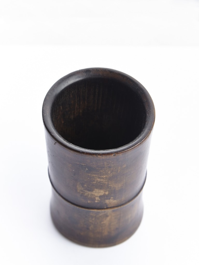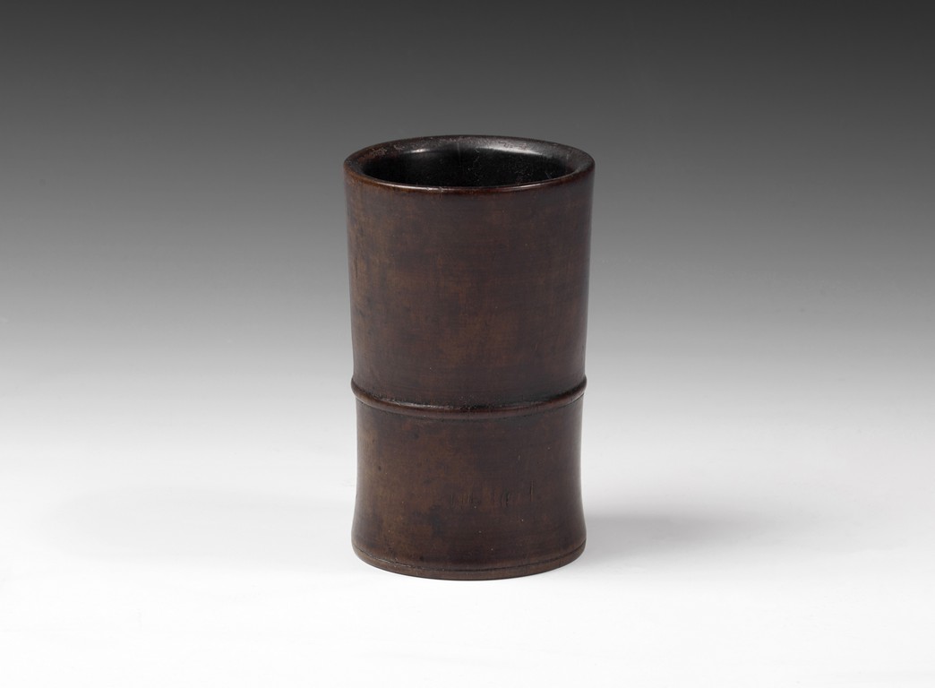 The rosewood brush pot was carved to depict a culm section of bamboo. Qing Dynasty period.