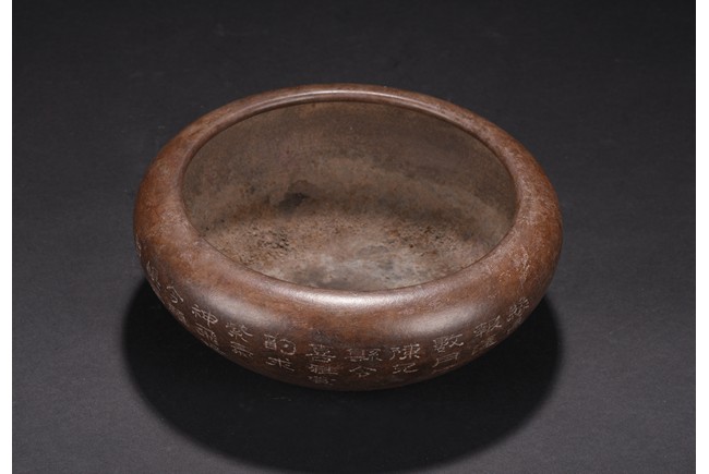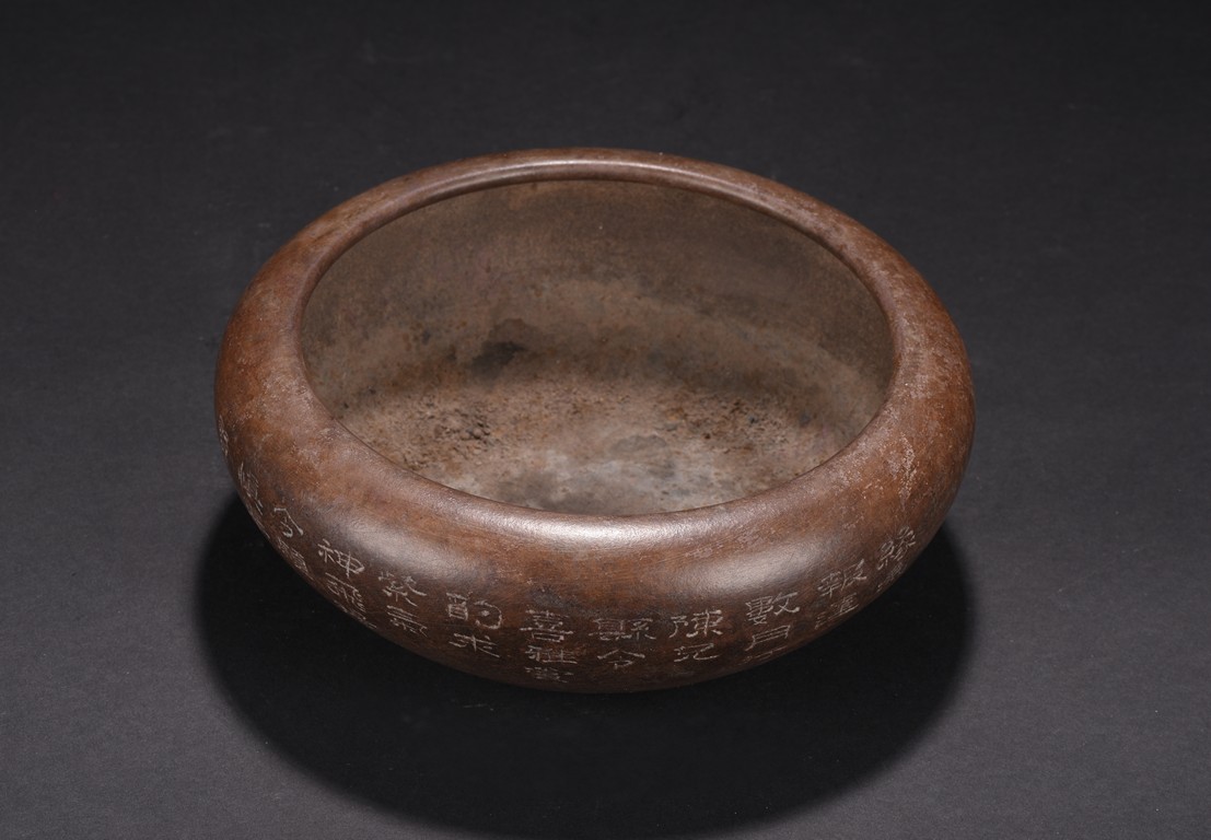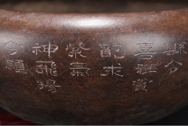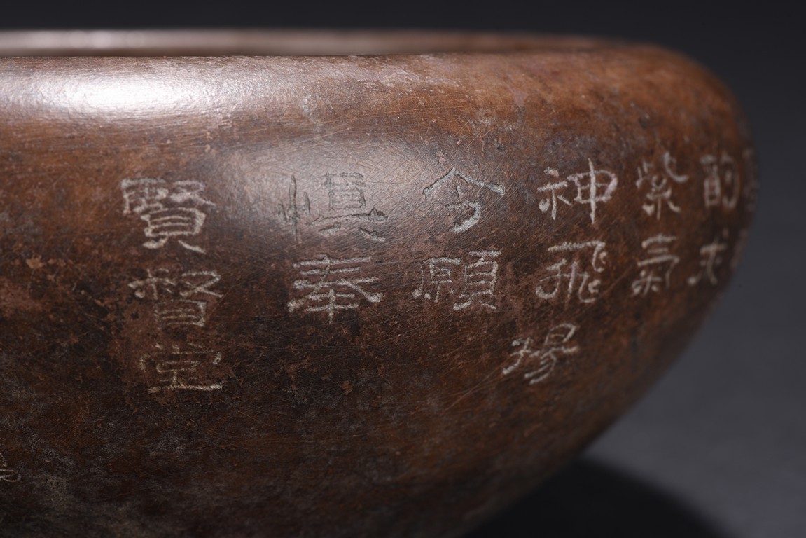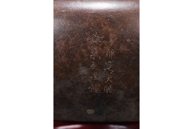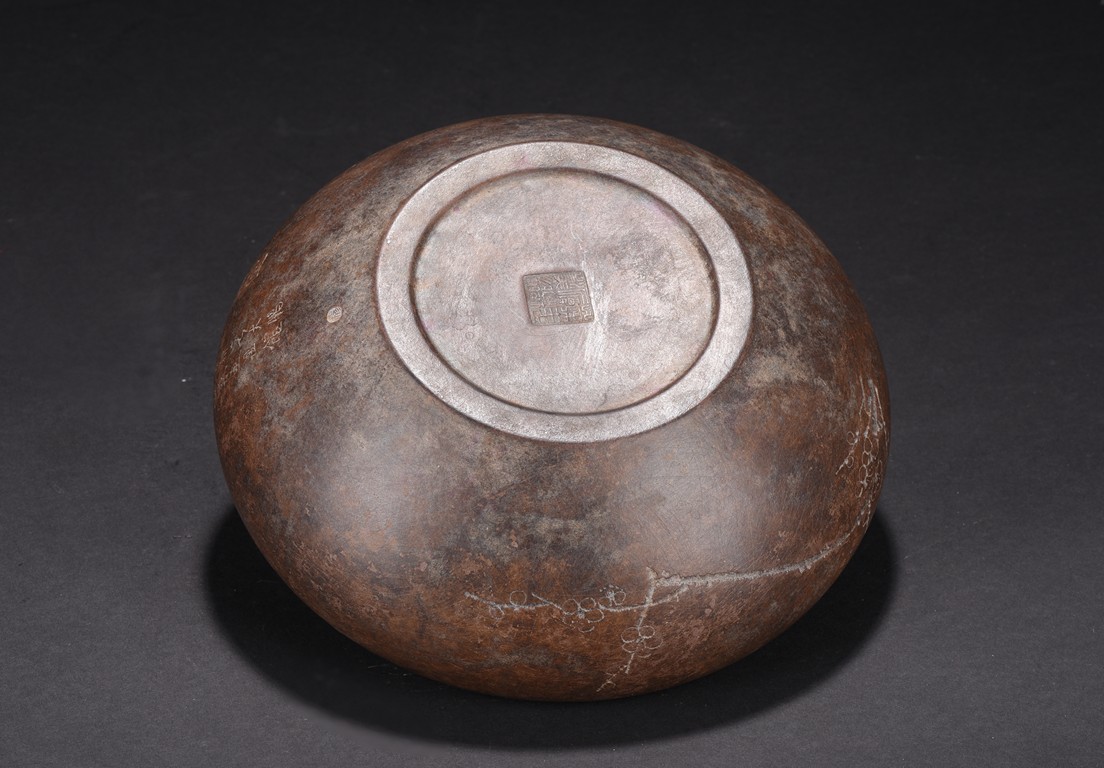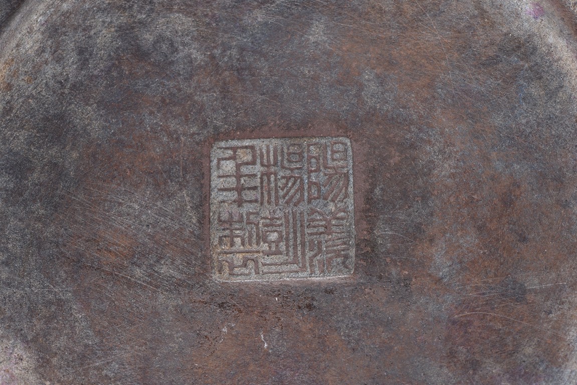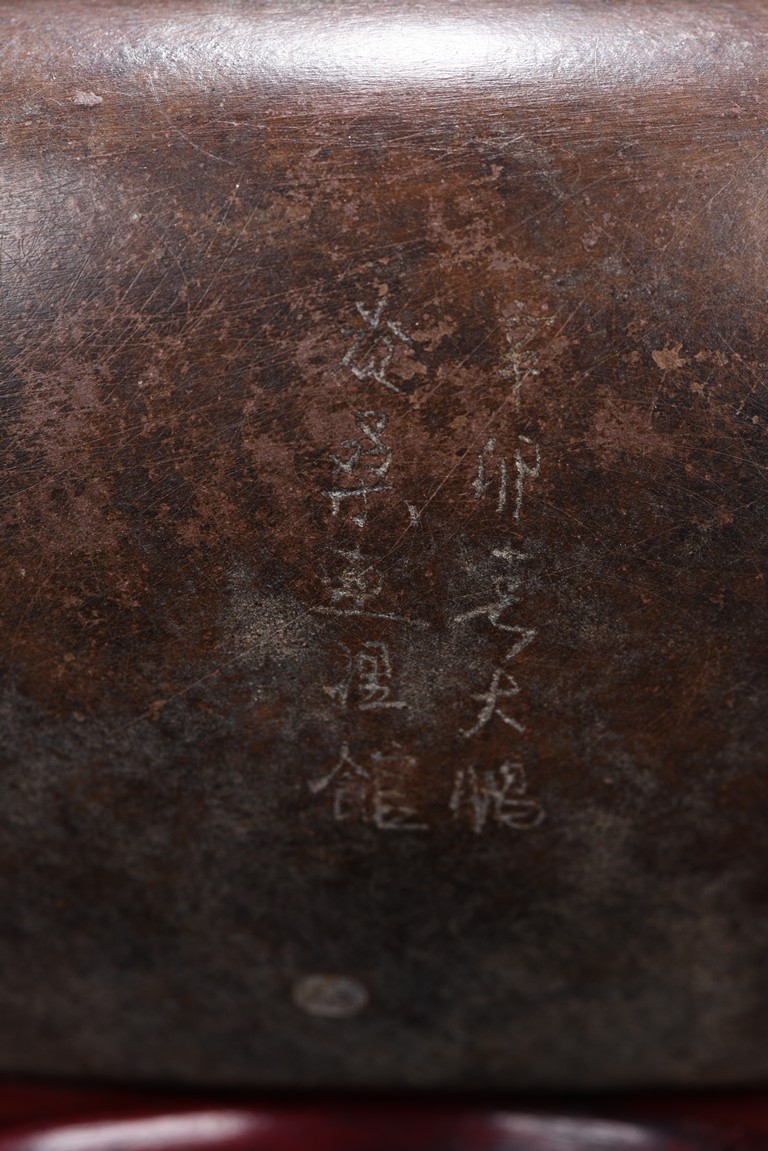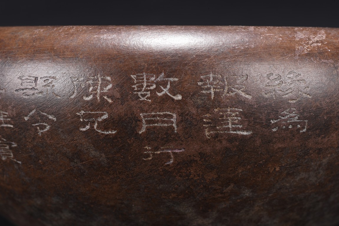 The compressed and wide body finely incised with inscription and plum blossoms, base bears six character mark. Qing Dynasty period.