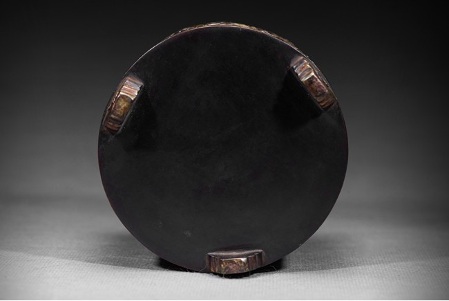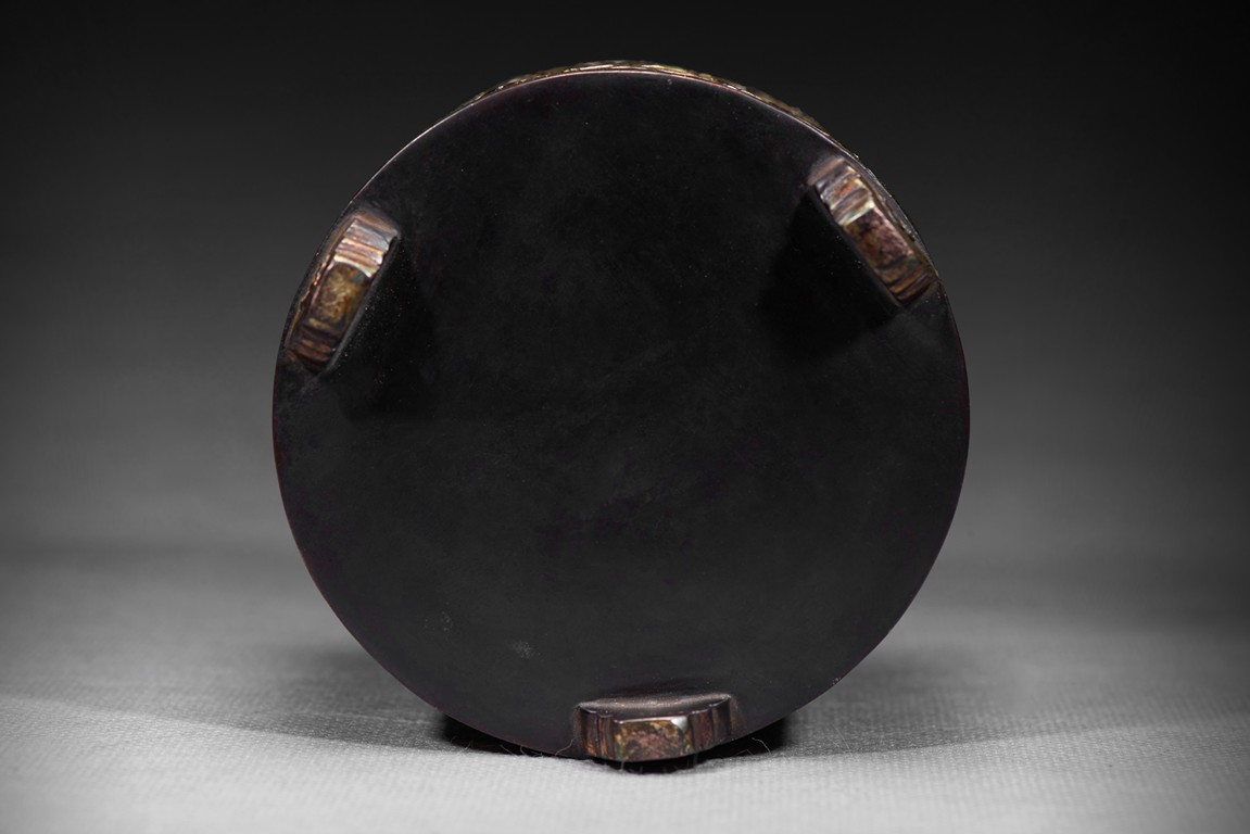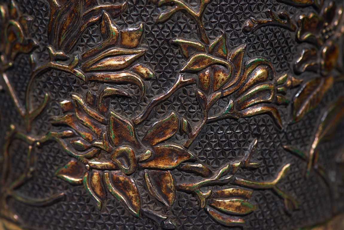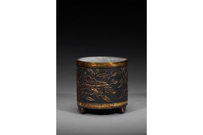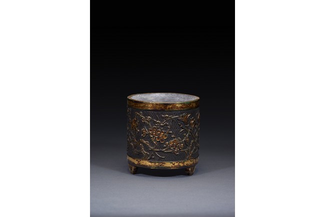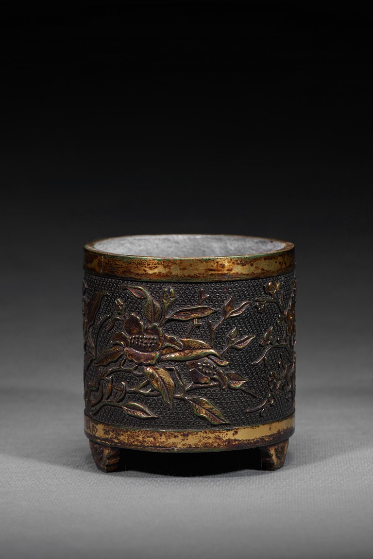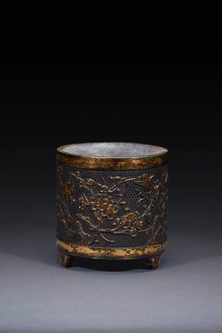 Of cylindrical form raised on three short ruyi feet, finely cast and parcel gilt decorated around the exterior with broad band of continuous scene, depicting leafy plum blossoms and branches, all reserved on dense diaper ground between gilt-bronze bands at the rim and base. Qing Dynasty period.