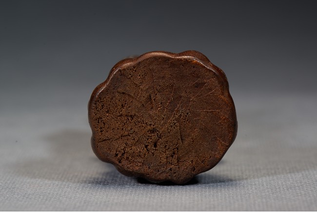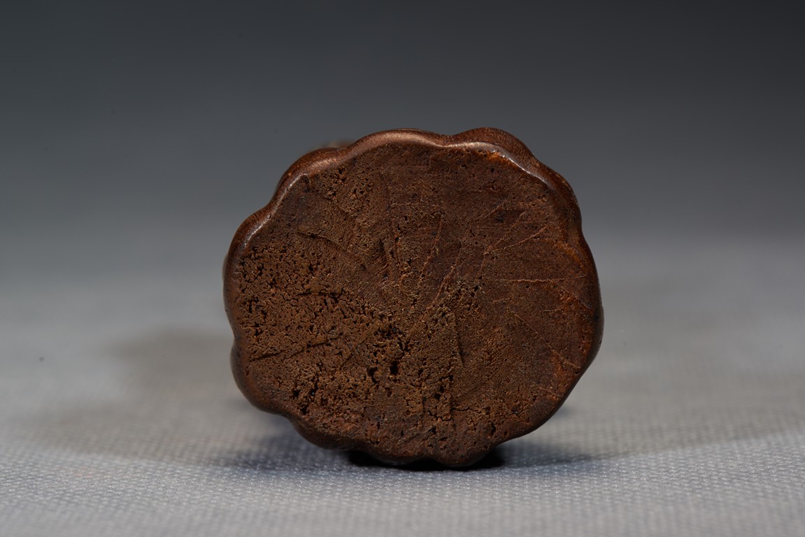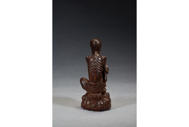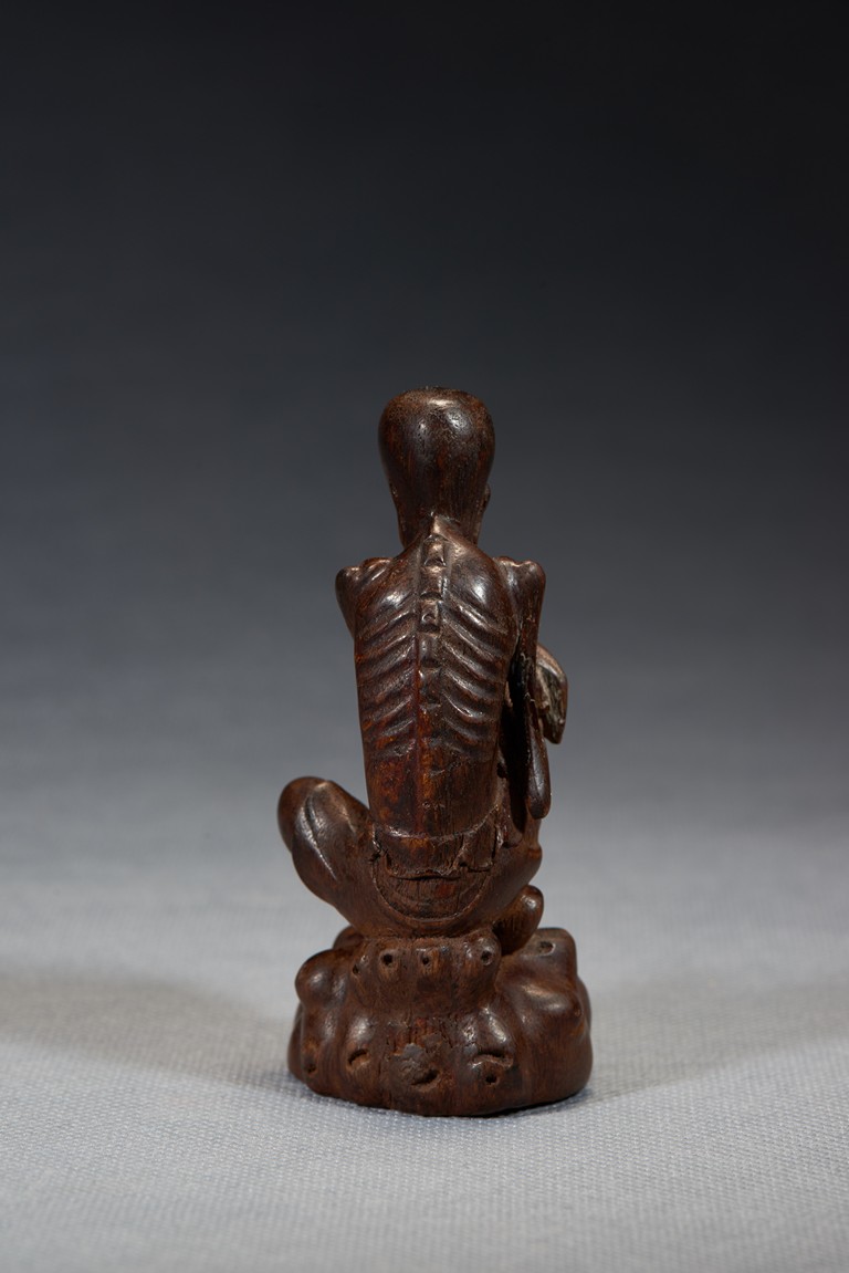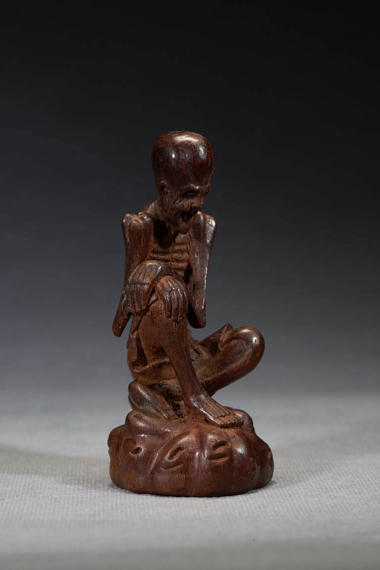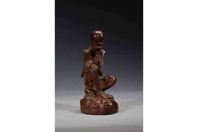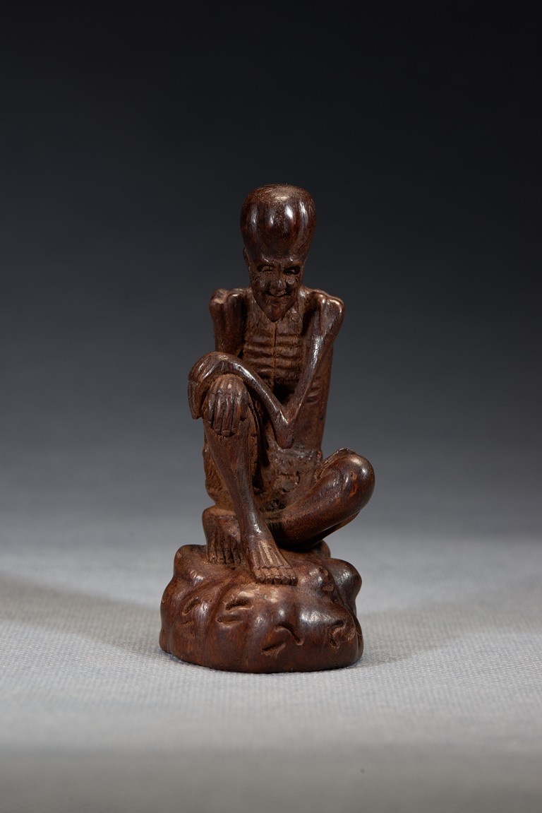 The luohan is shown seated bent forwards, his right leg raised at the knee, his left leg resting on the ground, his hands folded across one another on his right knee, chest shown with protruding ribs, bald head and face with joyful expression. Qing Dynasty period.