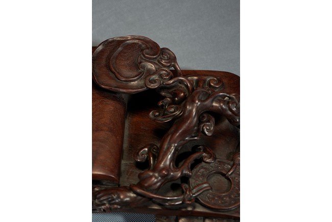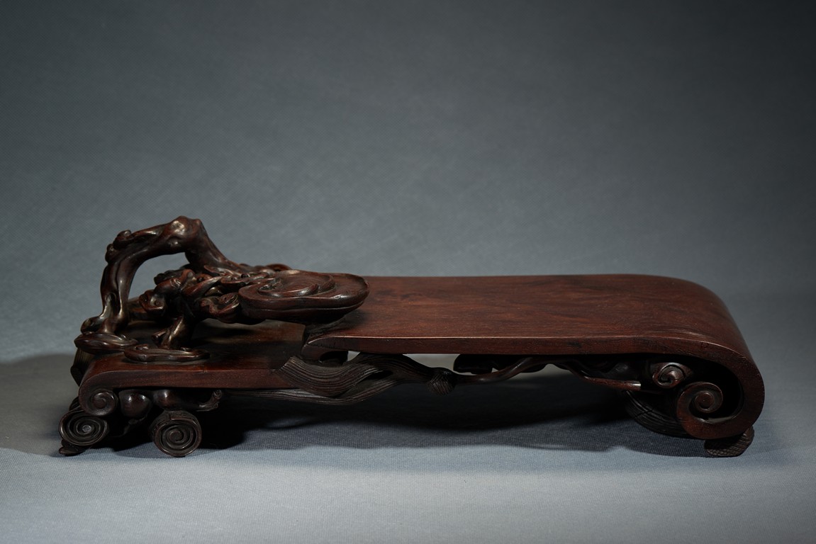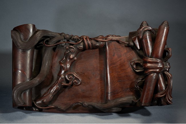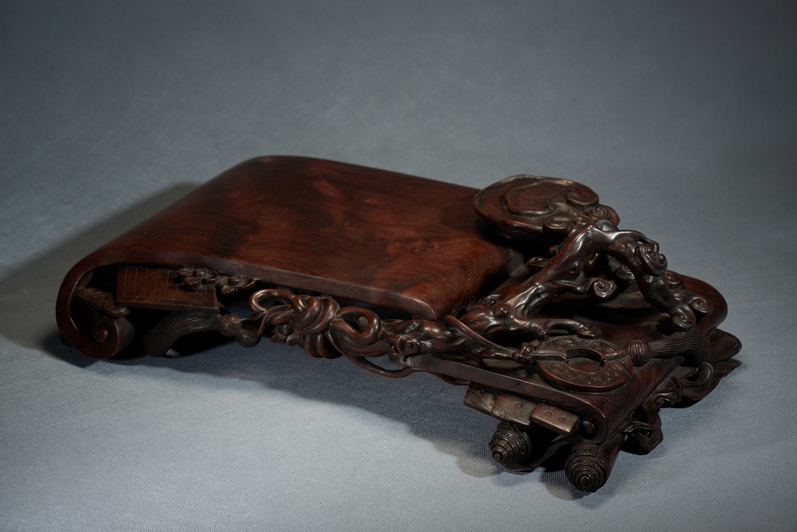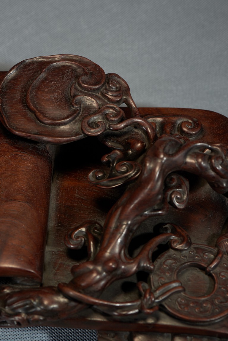 Impressively carved out of a single zitan wood trunk, one side carved with gnarled lingzhi branches tied with archaic bi disc through a string, the underside with tassels and two scrolls tied together forming the feet, the wood is of rich dark brown patina. Qing Dynasty period.