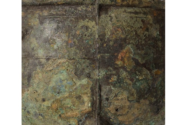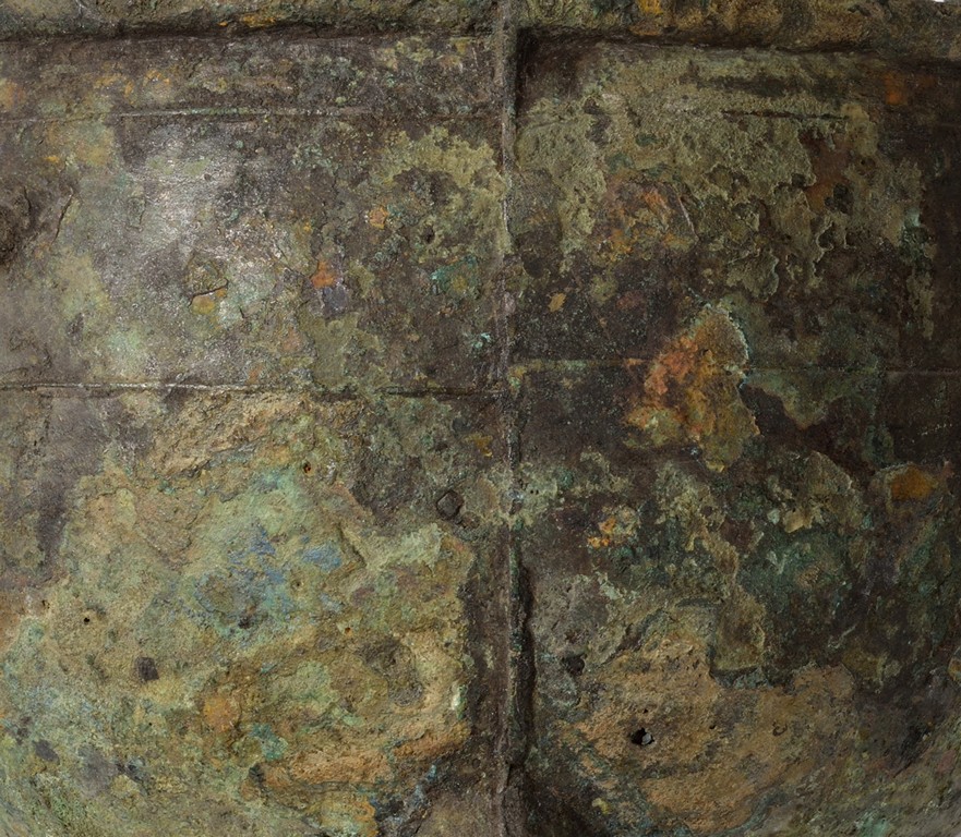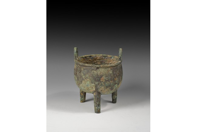 The Ding is of rounded form with very slight S-form profile, swollen lower section, a pair of upright U-form handles to each side of the everted rim, all supported on three tall columnar legs. Western Zhou dynasty period.