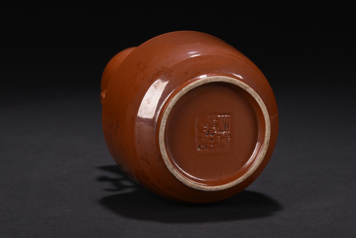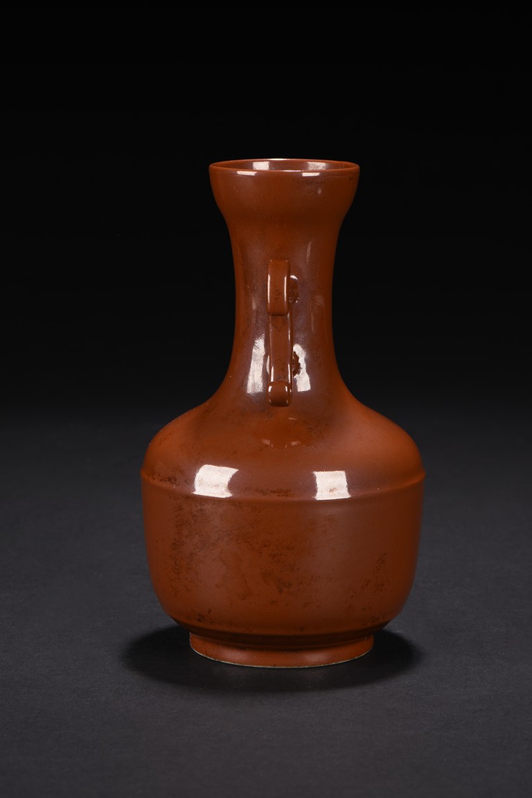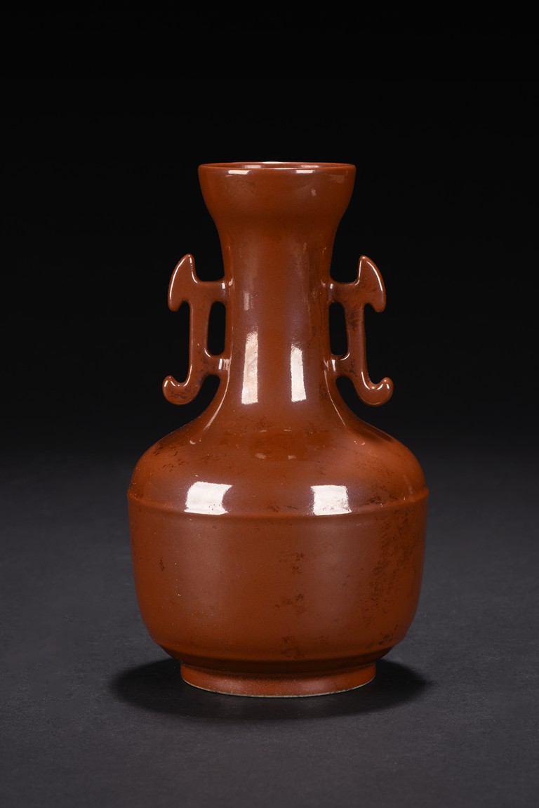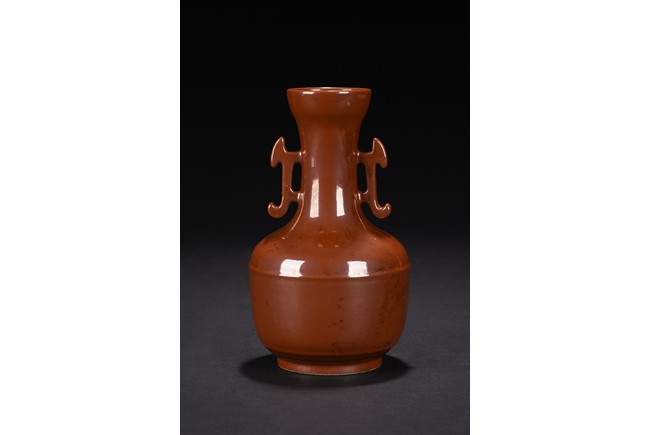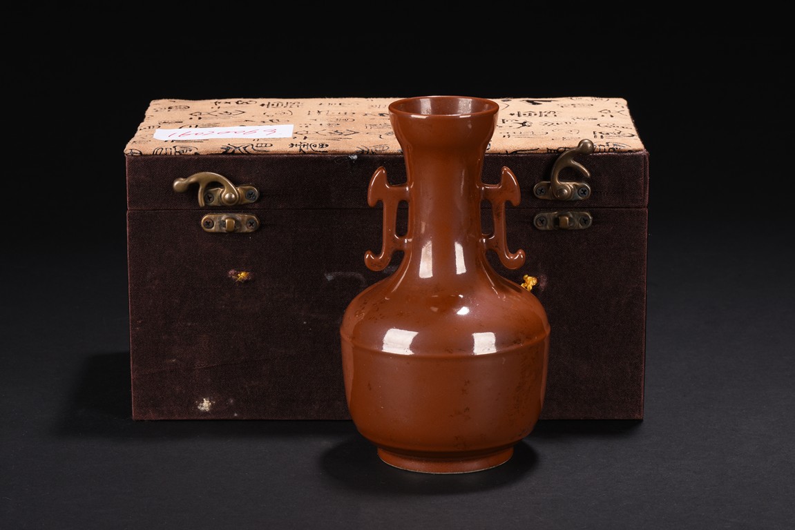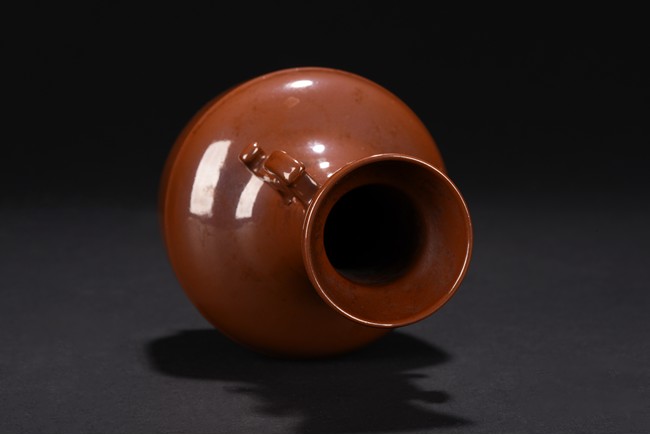 Rising from straight circular foot, the globular bodyrising to a long neck with flared mouth rim, the neck flanked by two lugs, overall suffused to the exterior with lustrous brown glaze. The base bears four character 'QIANLONG' mark. Qing Dynasty period.